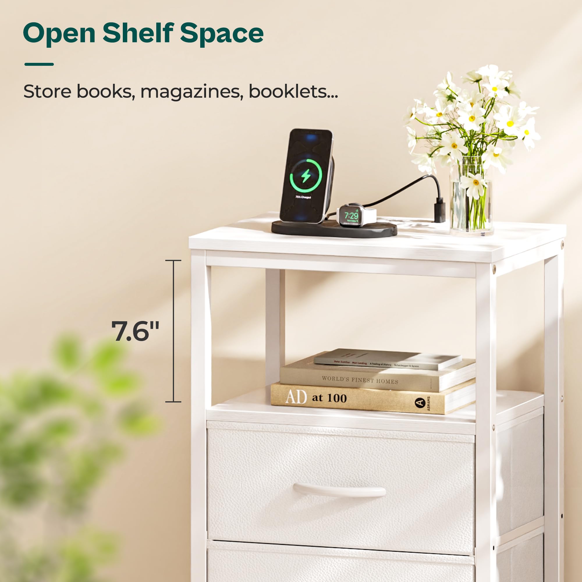 Huuger Nachttisch mit Ladestation, Beistelltisch mit 2 Stoffschubladen, Beistelltisch mit offenem Regal, Nachttisch mit USB-C-Anschluss und Steckdosen, Nachttisch, PU-Leder, Weiss