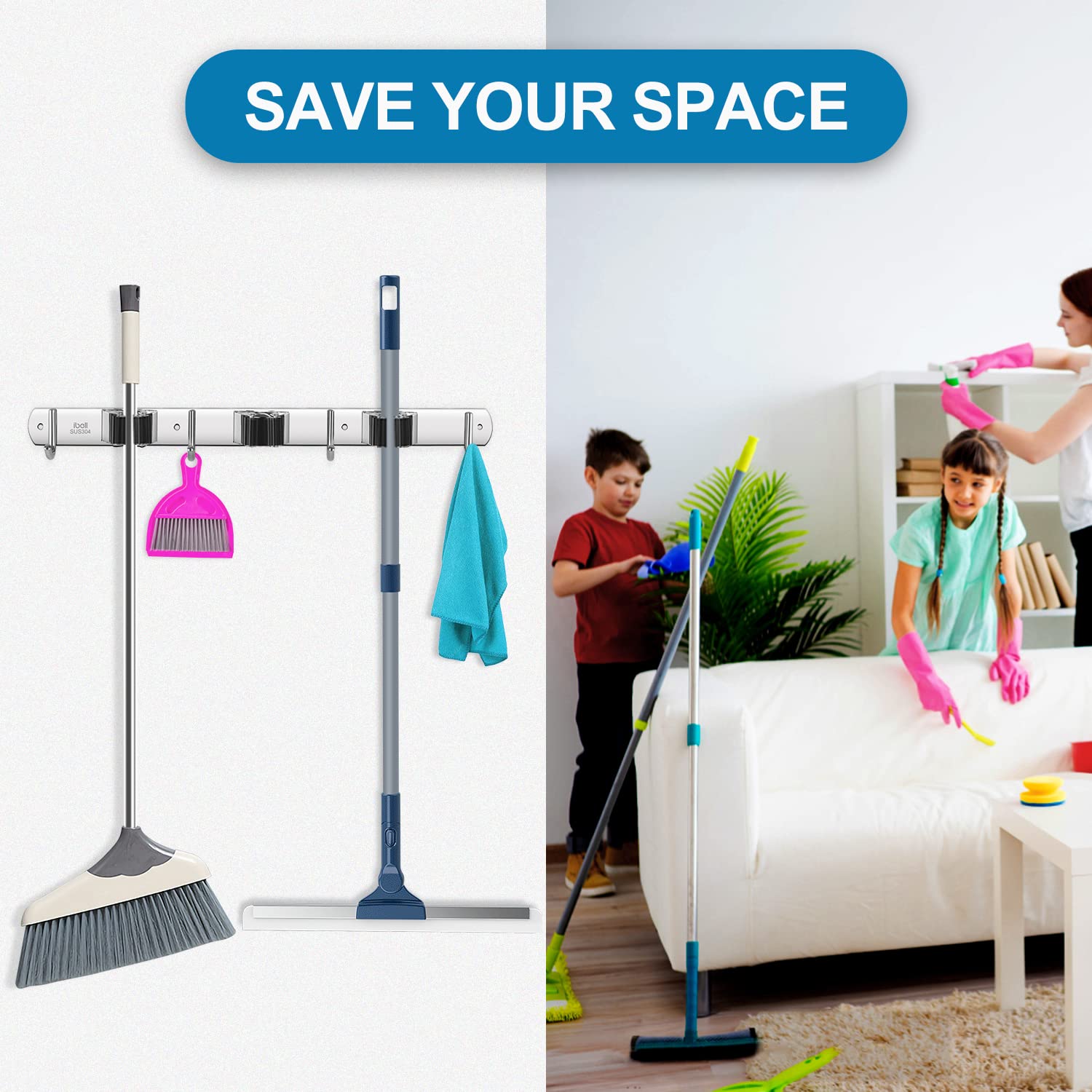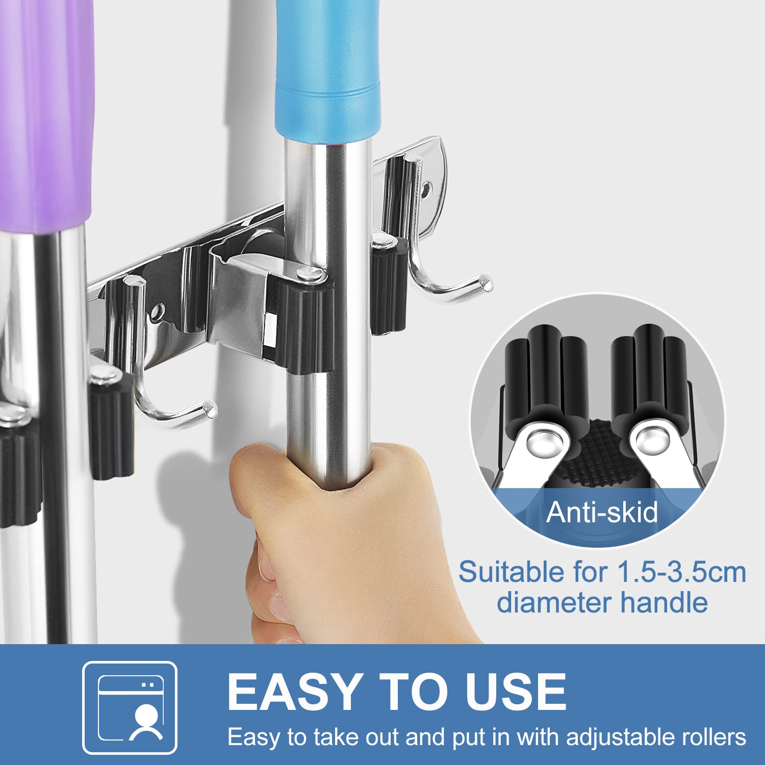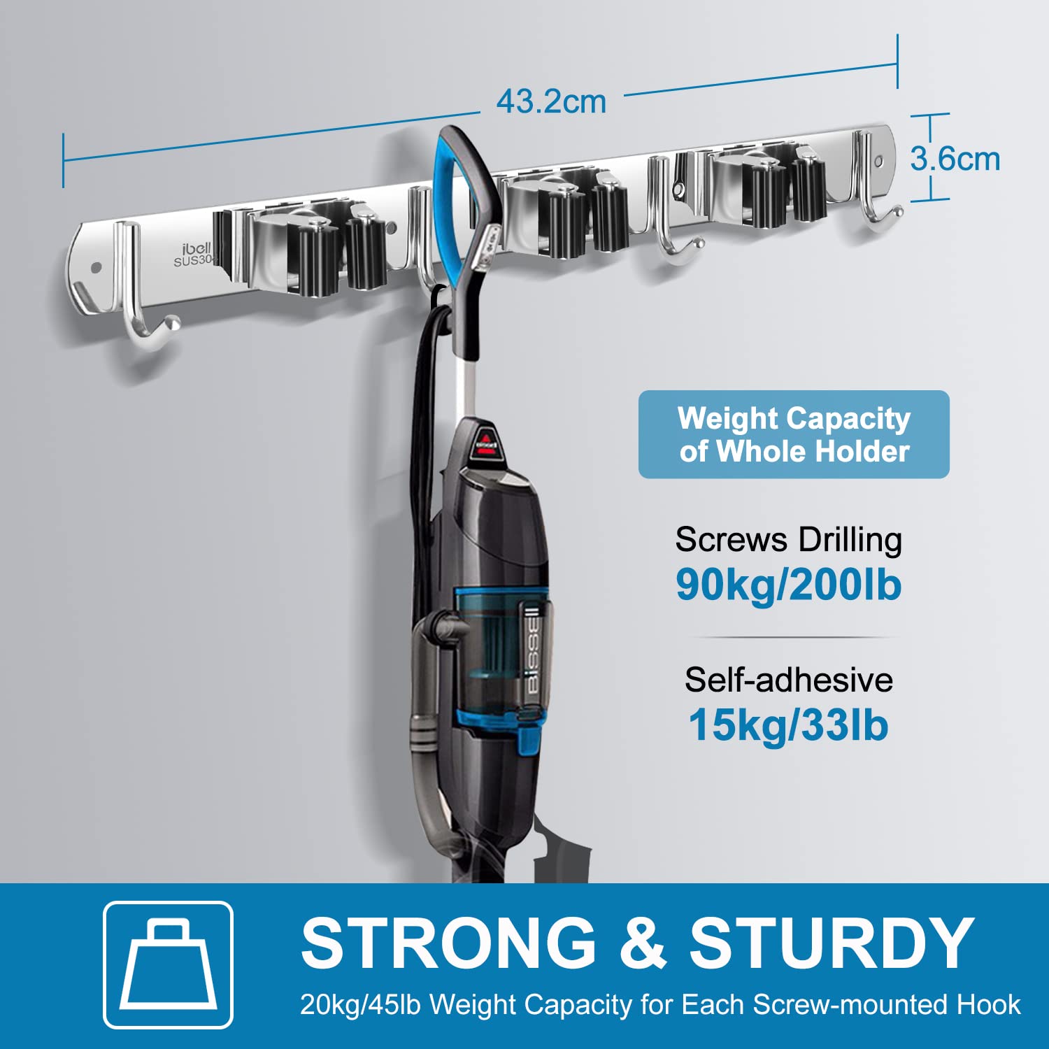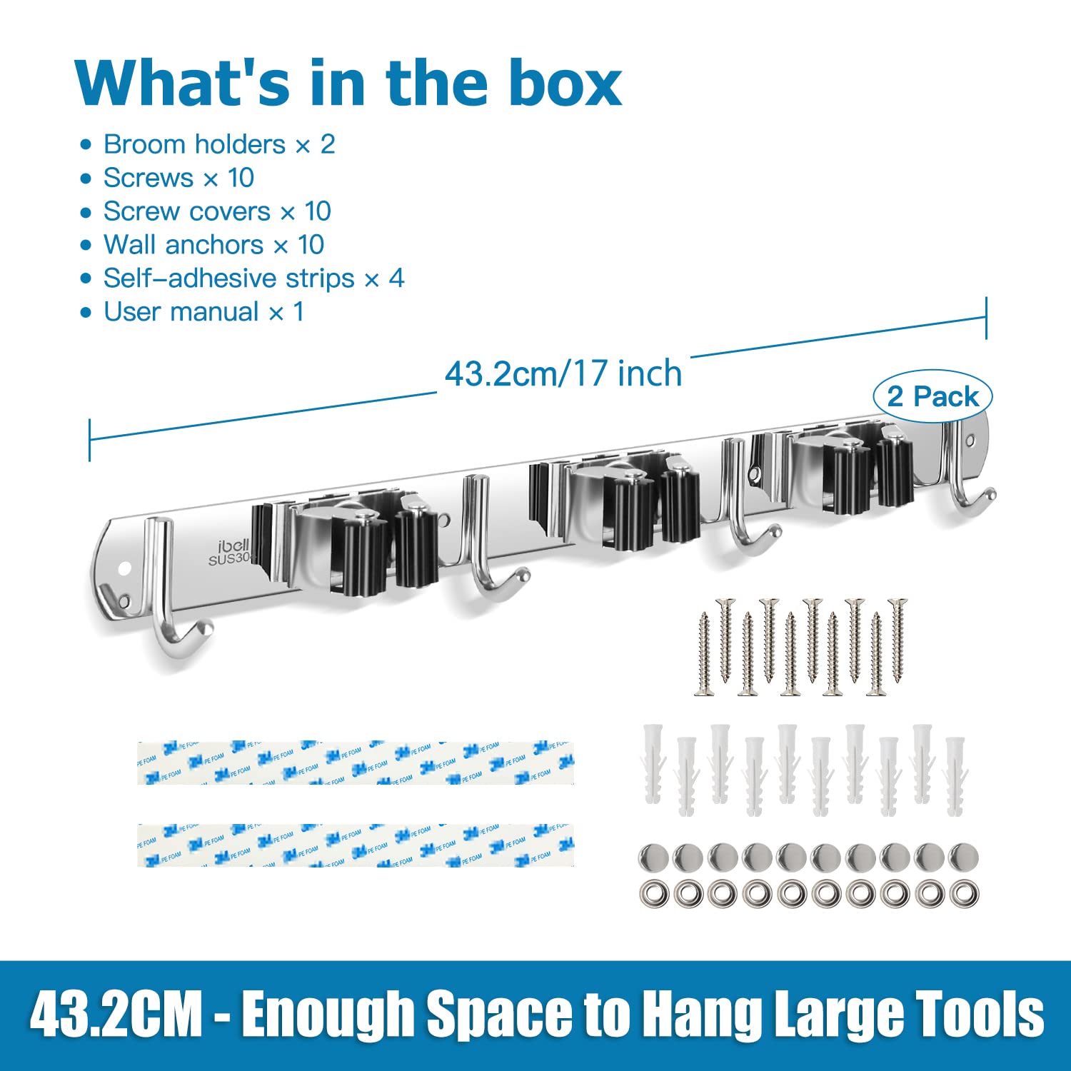 ibell 2 Stück Besenhalterung Wand, Gerätehalter Edelstahl, Besen Mop Halter Wandhalterung, Selbstklebend Werkzeughalter Organizer mit 3 Halter und 4 Haken für Zuhause Küche Badezimmer