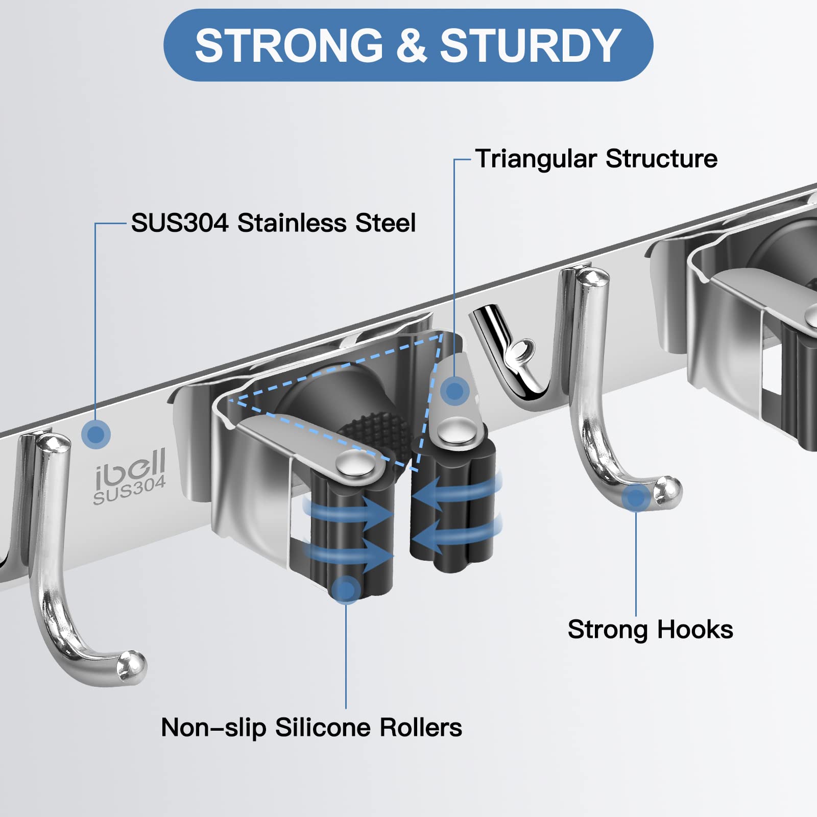 ibell 2 Stück Besenhalterung Wand, Gerätehalter Edelstahl mit 10 Halter und 8 Haken, Gartengerätehalter Wandhaken Mopphalter Wandhalterung Selbstklebend Werkzeughalter für Badezimmer Garten Garage