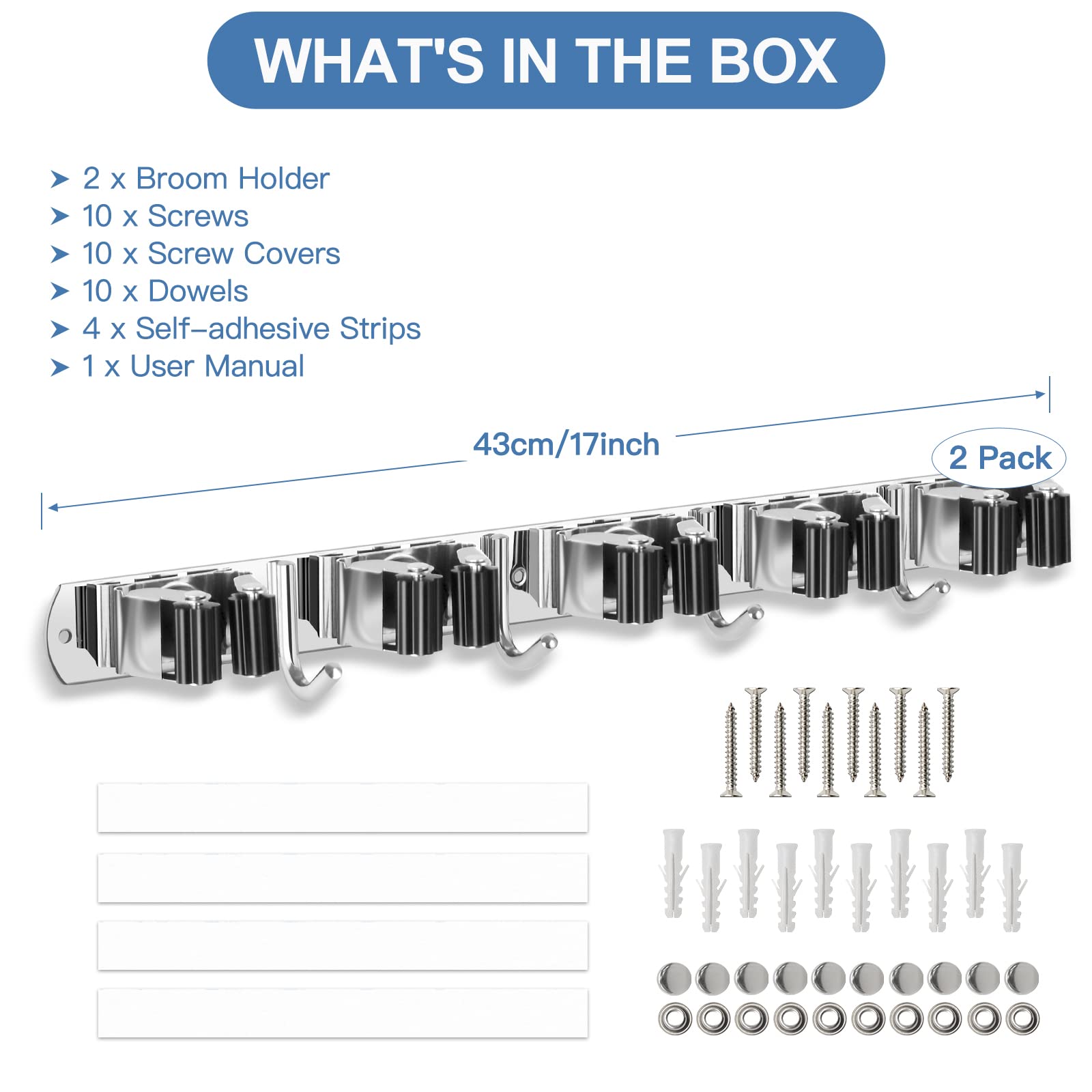 - 【Was Sie bekommen & Kundenservice】: Paket eingeschlossen: 2 x Besenhalter, 10 x Schrauben, 10 x Schraubenabdeckungen, 10 x Wanddübel, 4 x selbstklebende Streifen, 1 x Gebrauchsanweisung. Wenn Sie irgendwelche Probleme mit dem Besenhalter-Organizer haben, zögern Sie bitte nicht, uns zu kontaktieren. Wir kümmern uns wirklich um die Kauferfahrung jedes Kunden.