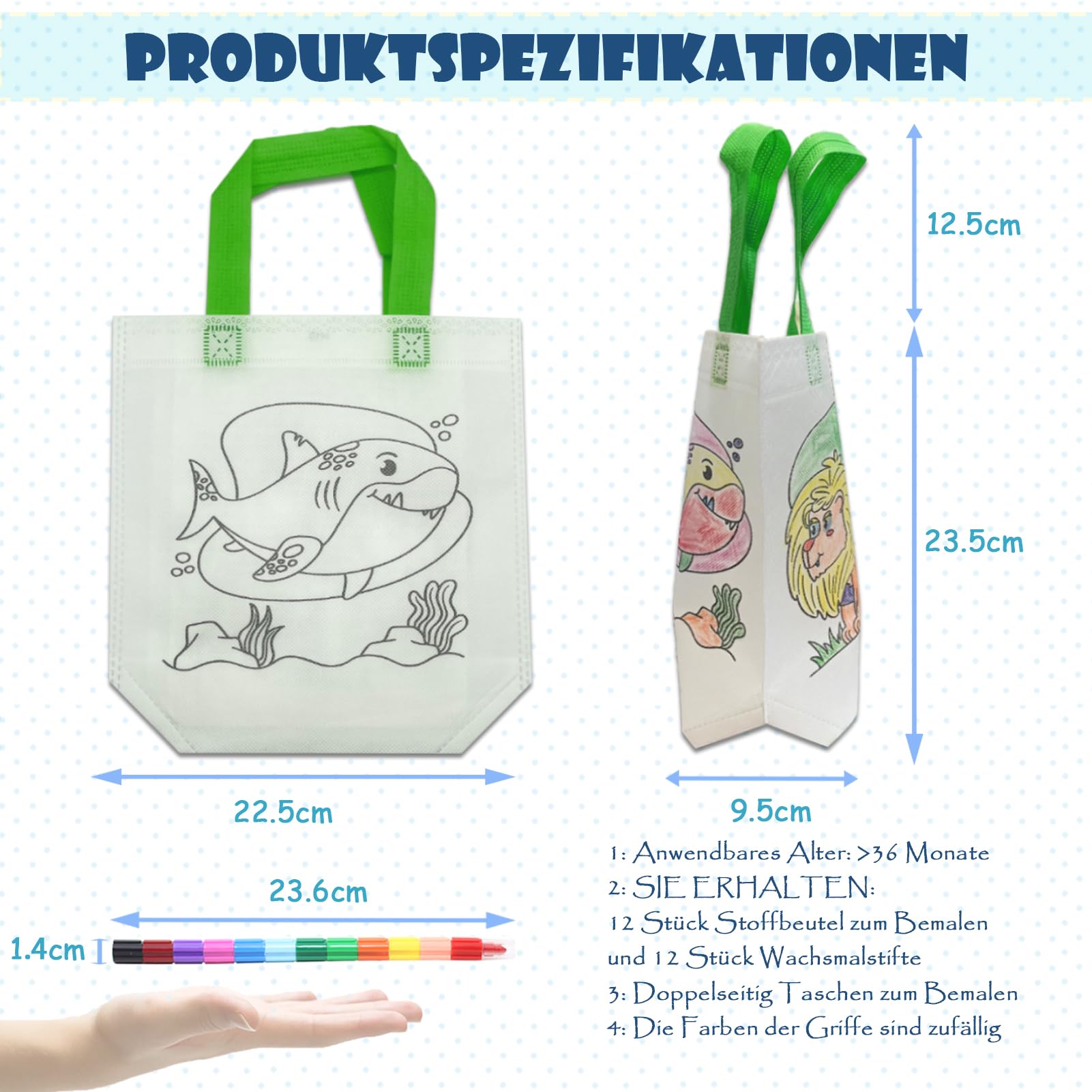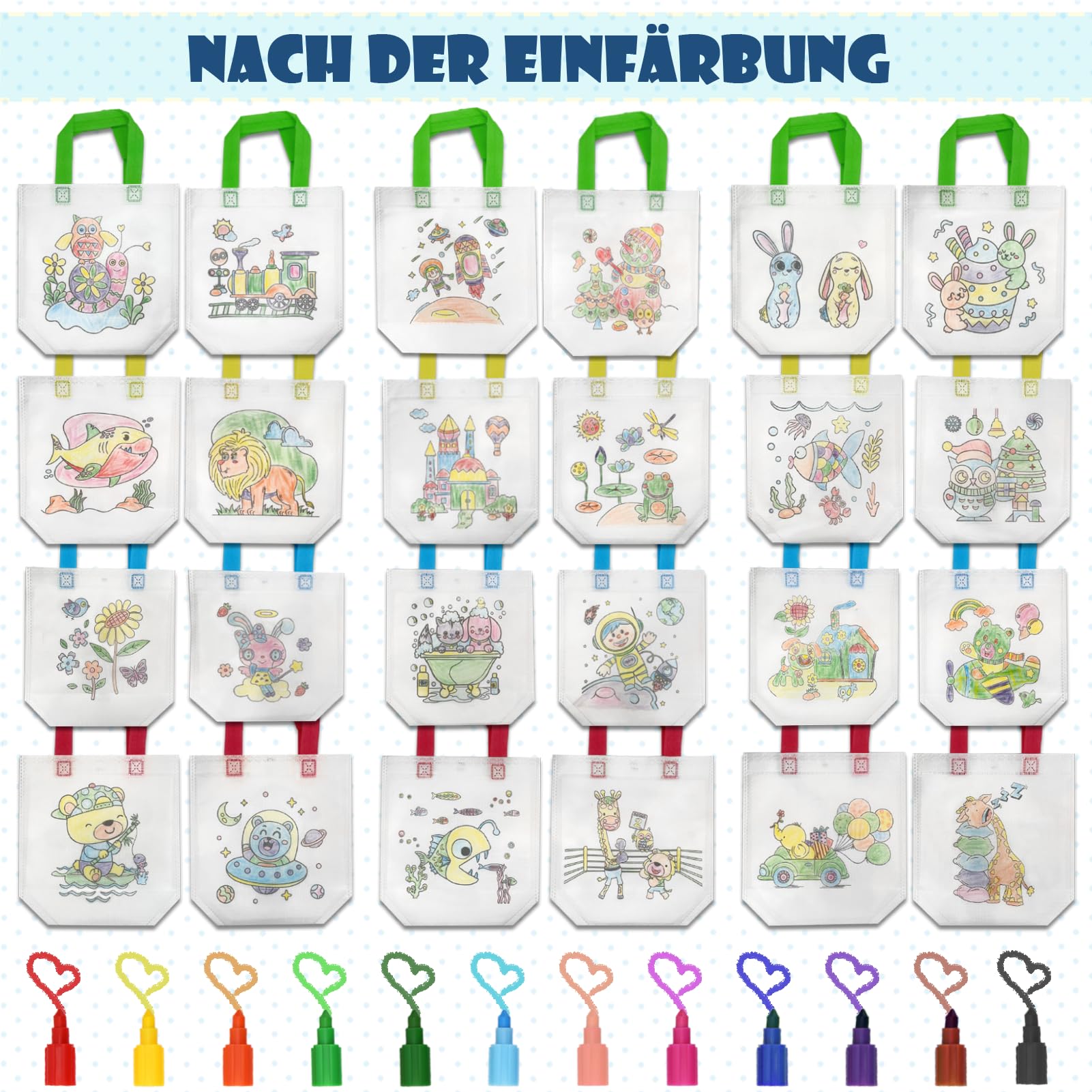 Menge: enthält 12 doppelseitige Stofftaschen zum Ausmalen und 12 Buntstifte in 12 Farben