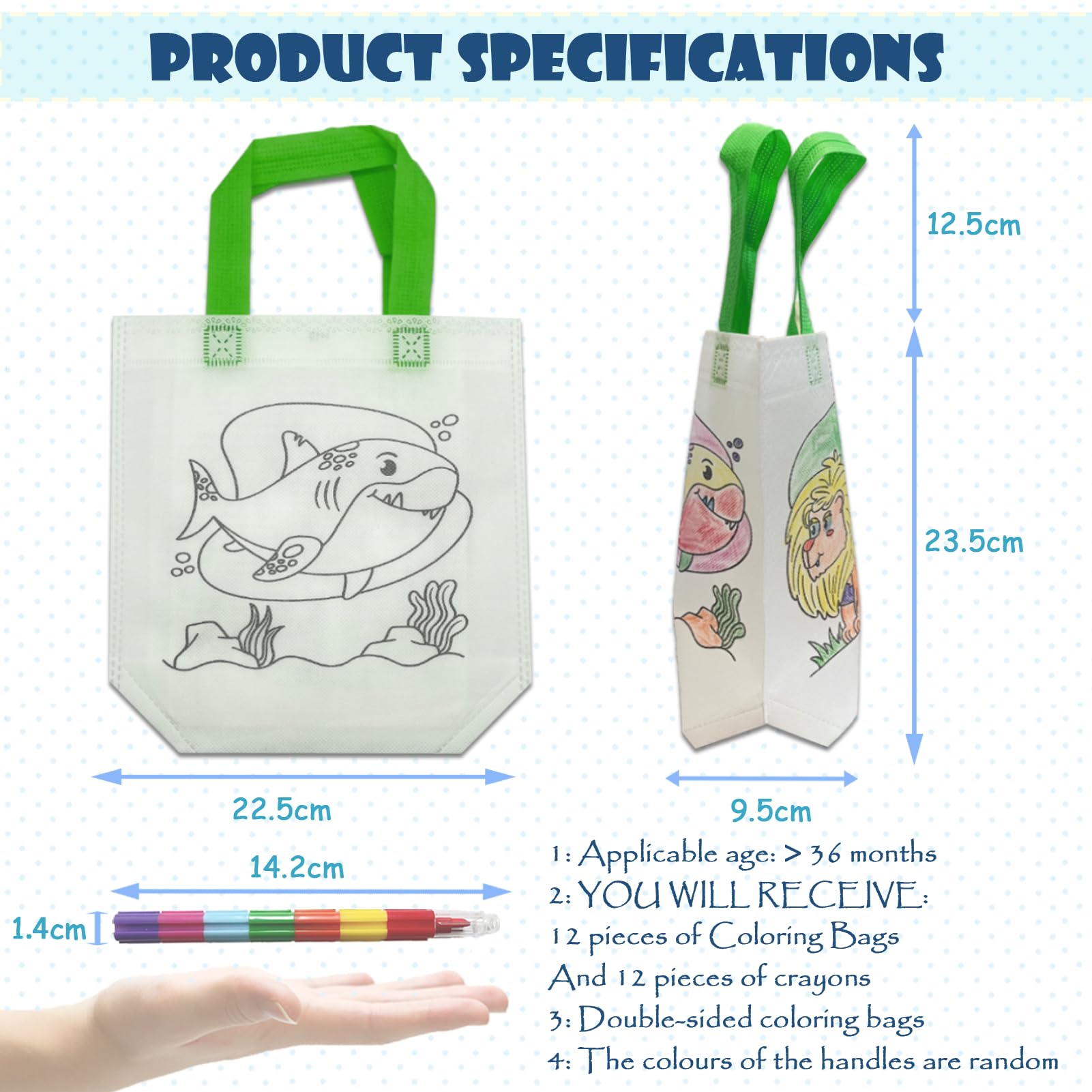 Menge: enthält 12 doppelseitige Stofftaschen zum Ausmalen und 12 Buntstifte in 7 Farben
