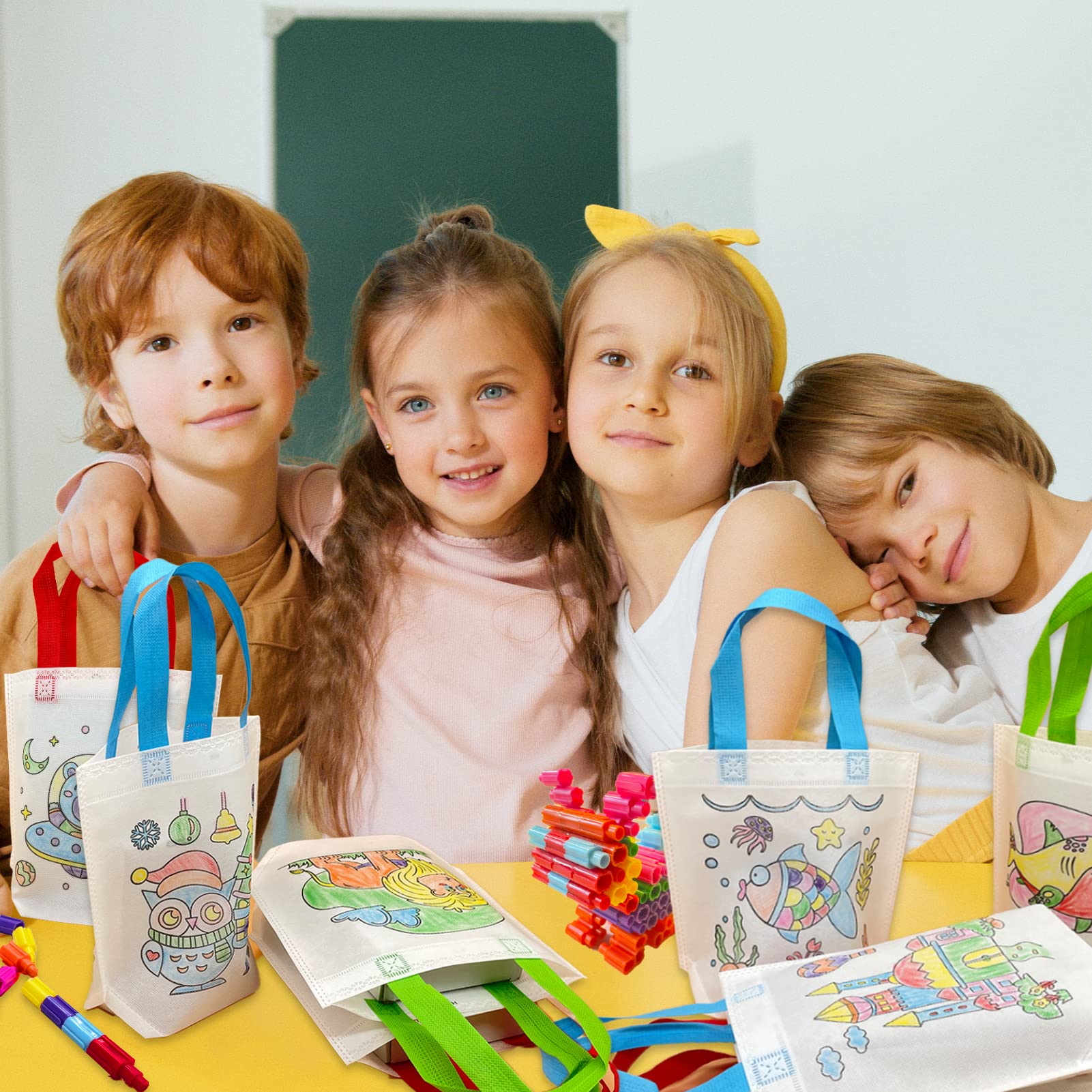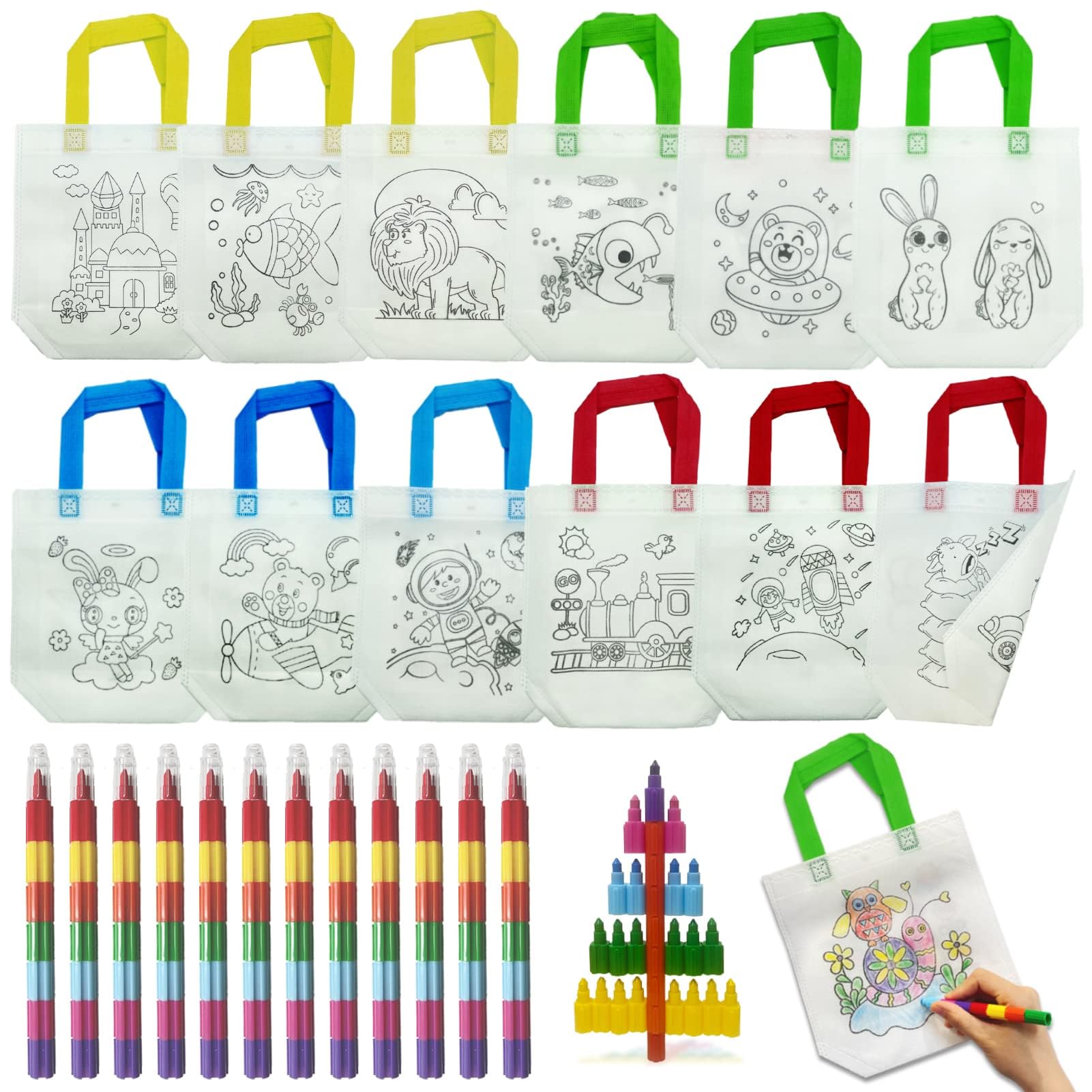 ICEPAPA, 12 Stück Stoffbeutel zum Bemalen für Kinder und 12 Stück Stapelbare Wachsmalstifte (7 Farben in 1), Perfekt für Kindergeburtstag Gastgeschenke, Bastelset Kindergeburtstag