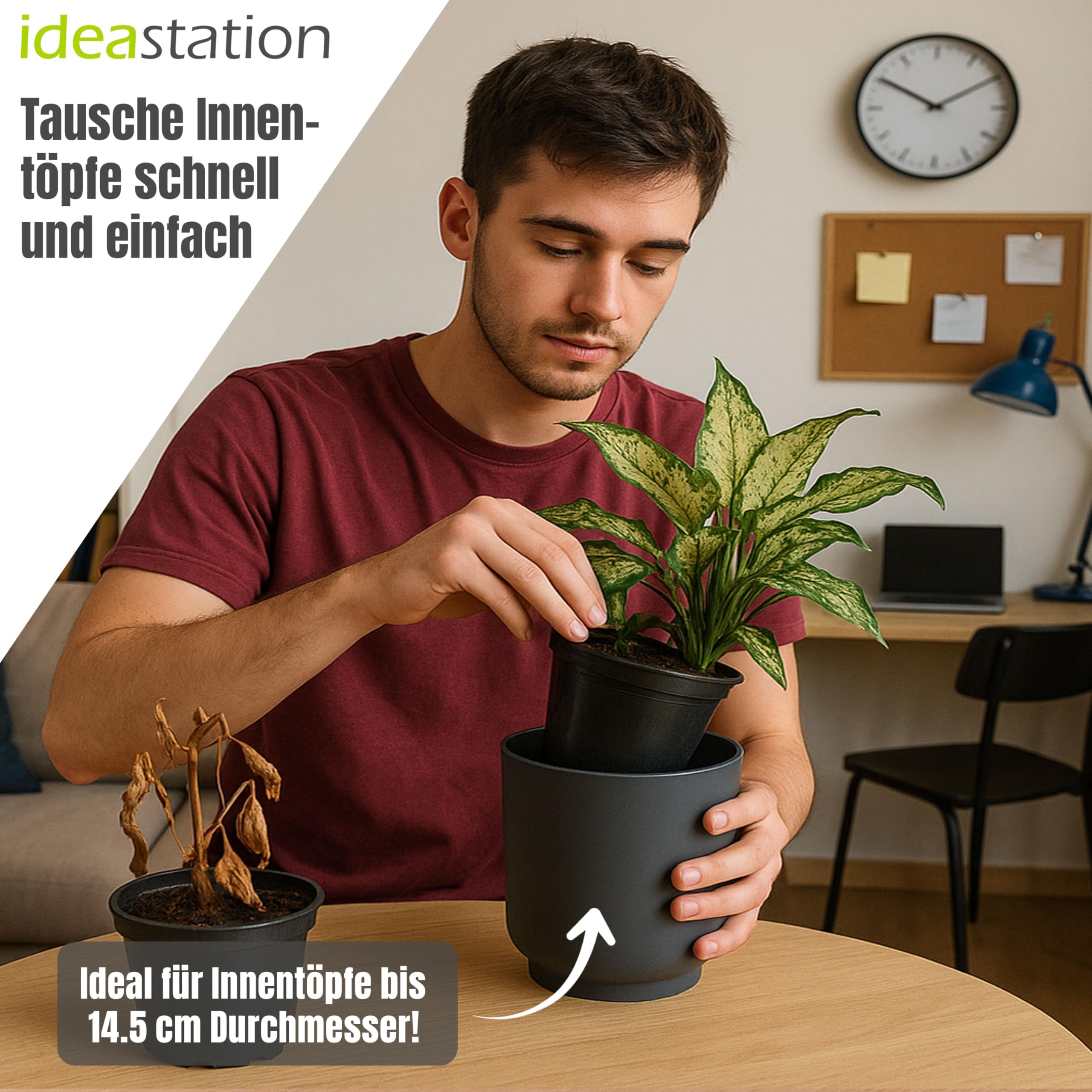Verwandeln Sie Ihr Zuhause, die Küche, das Büro oder draussen Ihren Garten oder Balkon mit unseren stilvollen und vielseitigen Blumentöpfen in eine grüne Oase der Entspannung. Egal, ob Sie Ihre Wohnräume beleben oder Ihren Aussenbereich verschönern möchten, unsere Blumentöpfe sind die perfekte Wahl. Bringen Sie die Natur in Ihr Leben und geniessen Sie die beruhigende Wirkung von Pflanzen, egal wo Sie sich gerade aufhalten. Mit ihrem einzigartigen Design und den dezenten Farben passen sie perfekt zu jeder Einrichtung und verleihen Ihrem Zuhause einen Hauch von Natürlichkeit. Lassen Sie sich von der Vielseitigkeit unserer Töpfe begeistern - ob Zimmerpflanzen, Blumen, Kräuter oder sogar kleines Gemüse, sie bieten ausreichend Platz und schaffen optimale Bedingungen für gesundes Wachstum. Unsere Blumentöpfe sind nicht nur ästhetisch ansprechend, sondern auch langlebig und funktional. Dank ihrer robusten Konstruktion und der geschlossenen Unterseite sind sie stabil und auslaufsicher, sodass Sie sich keine Sorgen um unschöne Wasserflecken machen müssen. Die Handhabung und Pflege ist kinderleicht - sie lassen sich mühelos reinigen und ermöglichen eine unkomplizierte Pflanzenpflege. Verwandeln Sie Ihr Zuhause mit Leichtigkeit in eine grüne Oase und geniessen Sie die positiven Auswirkungen von Pflanzen auf Ihr Wohlbefinden. Holen Sie sich noch heute unsere Blumentöpfe und schaffen Sie eine harmonische Atmosphäre, in der Sie sich rundum wohlfühlen können.