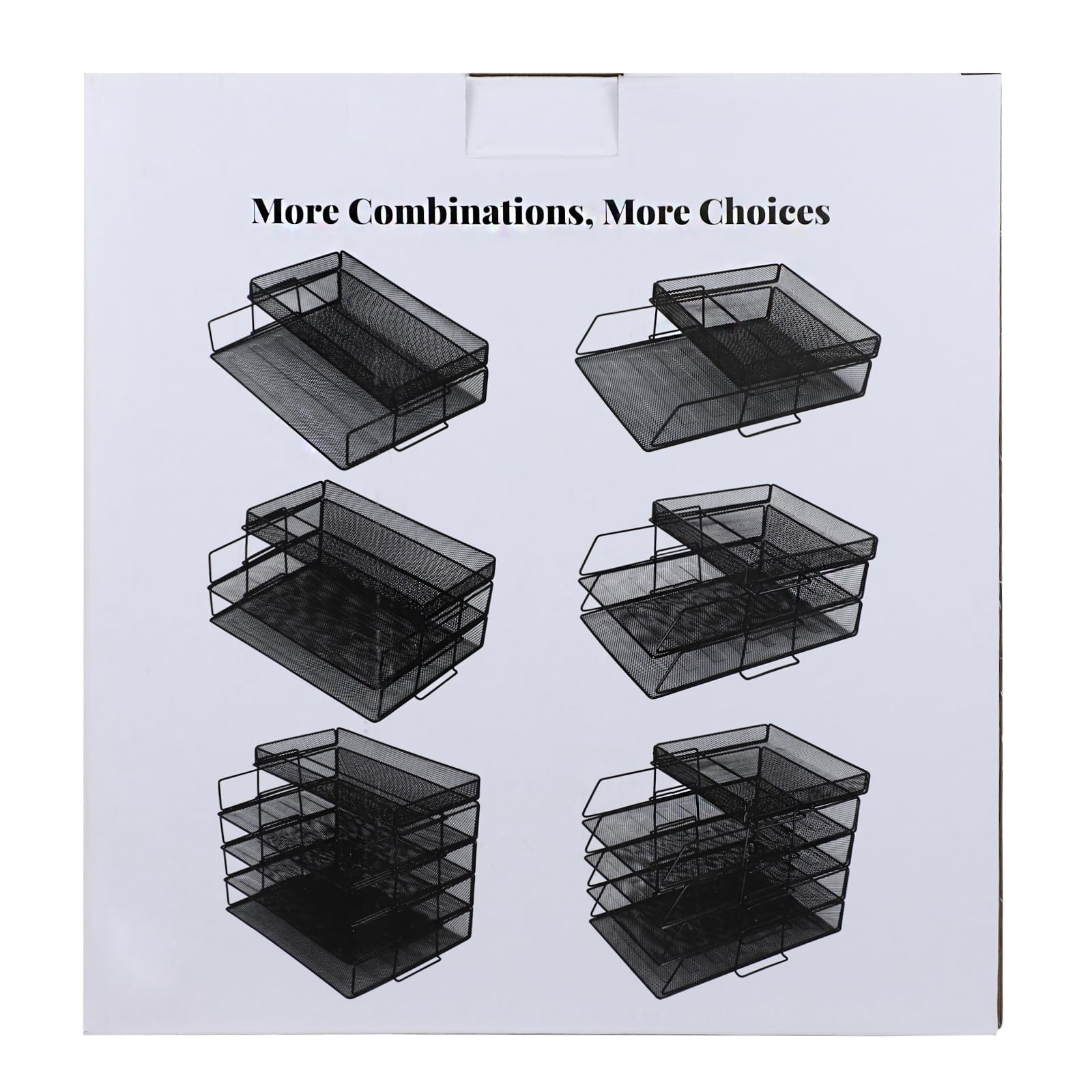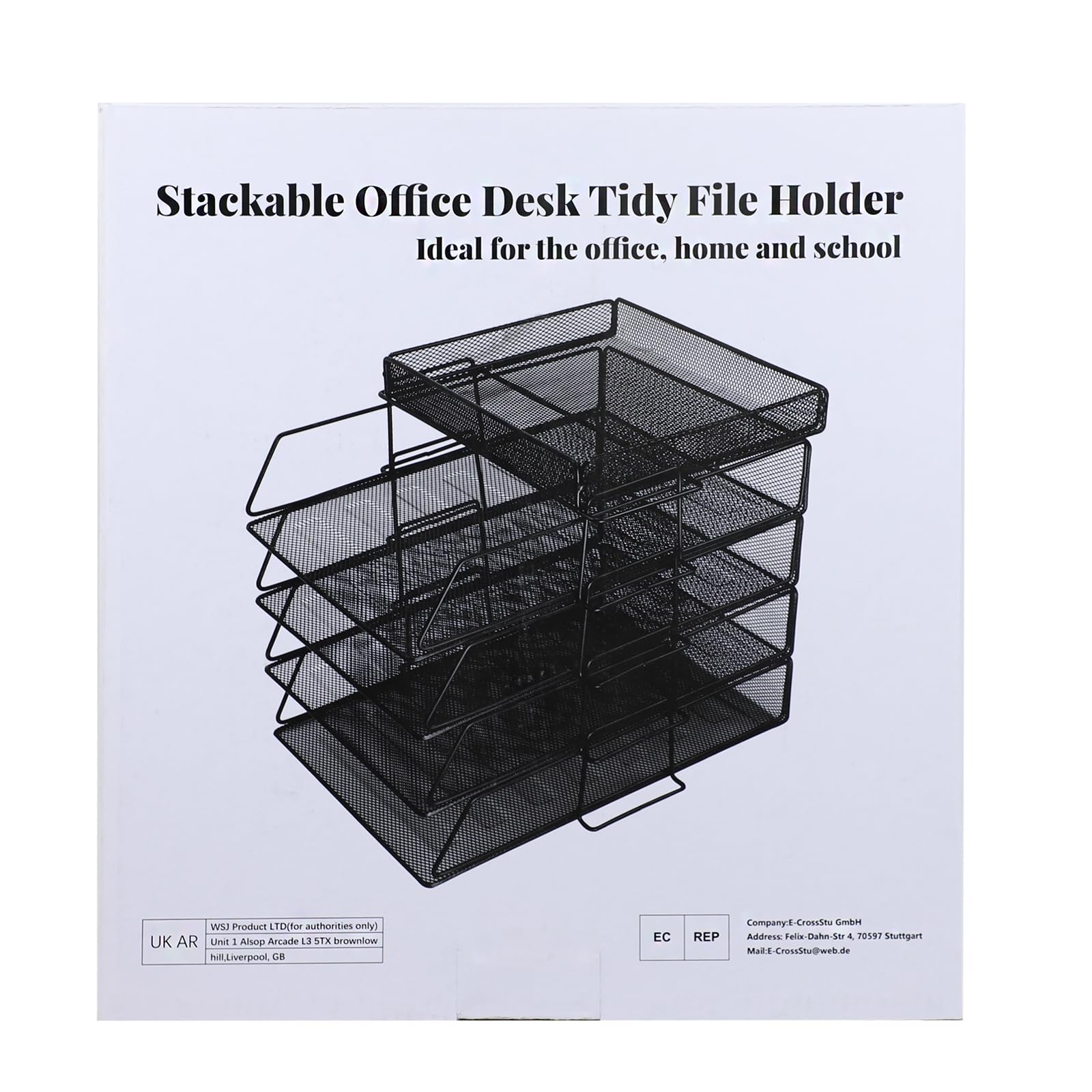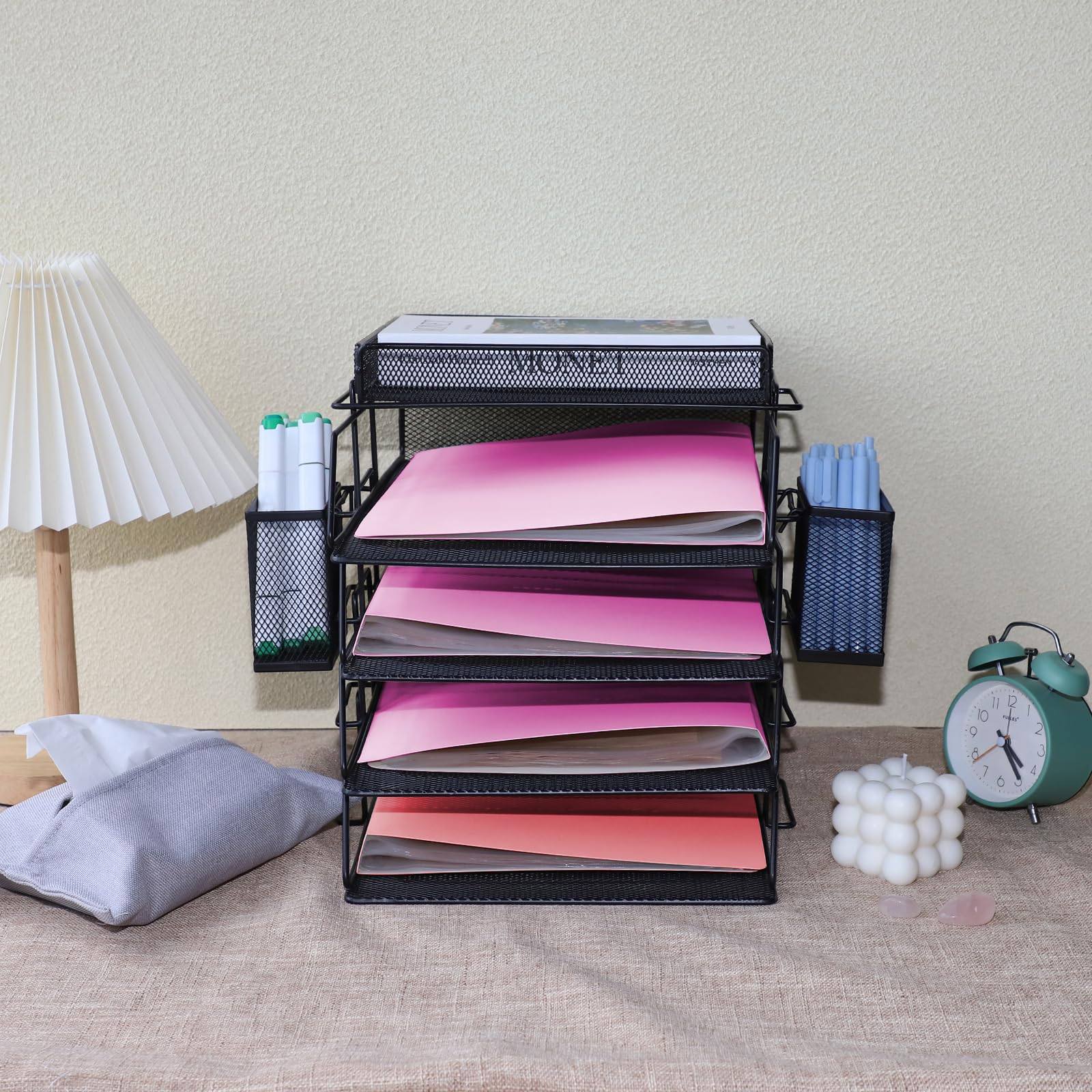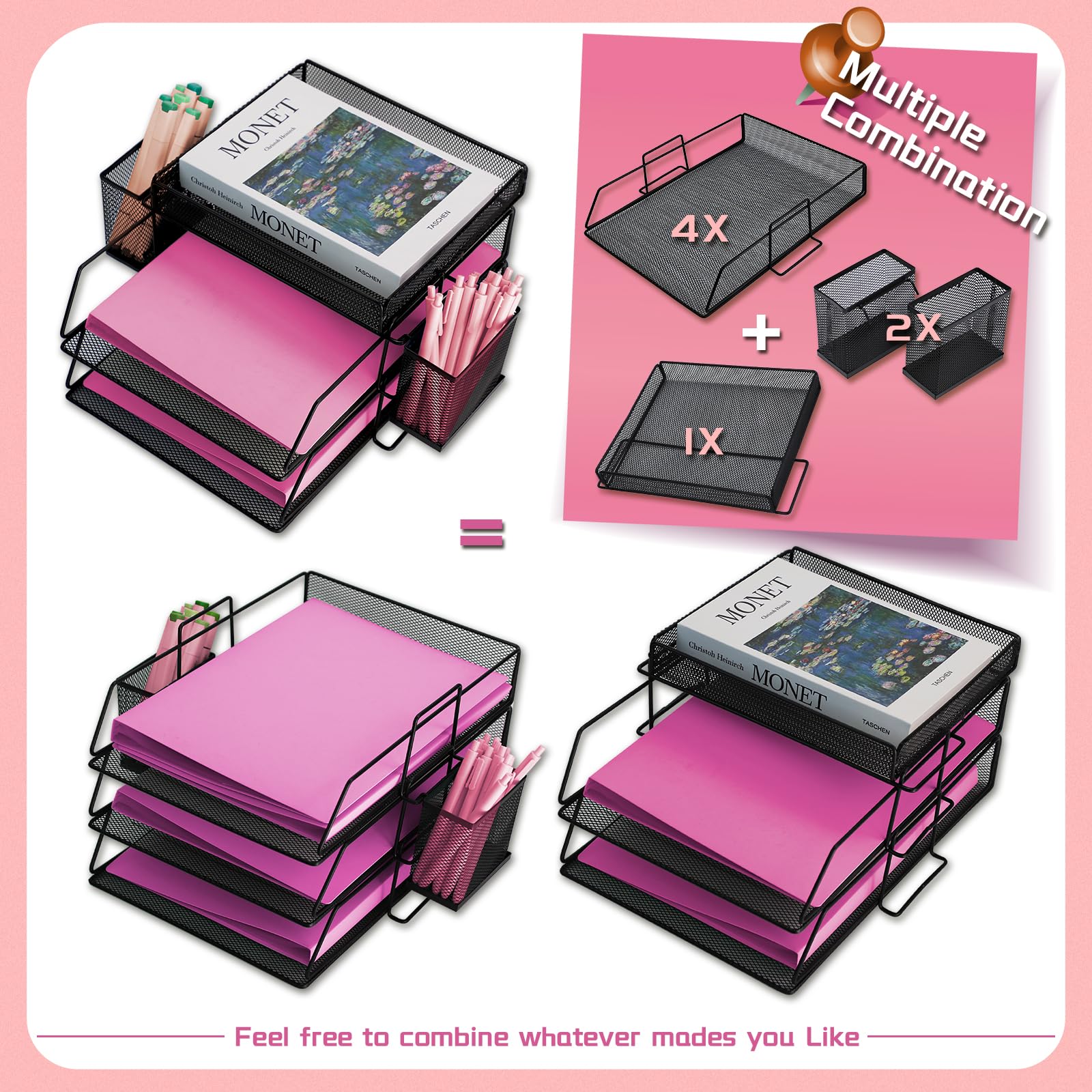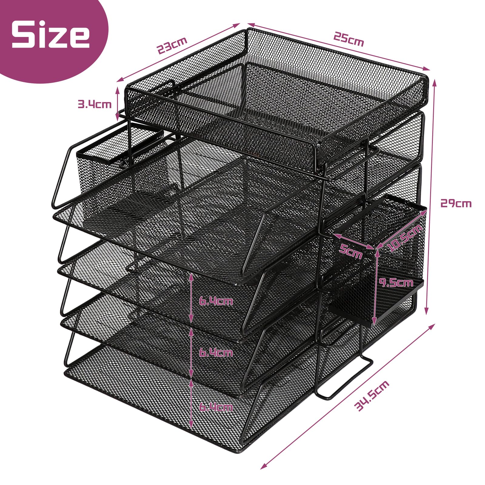 ideallife Stapelbare Briefablage aus Metall, Schwarz Schreibtisch Organizer mit 4 Dokumentenablage und 2 Stiftehalter, Mesh Schreibtischablage für A4 Dokument, Büroablage, Postkörbe