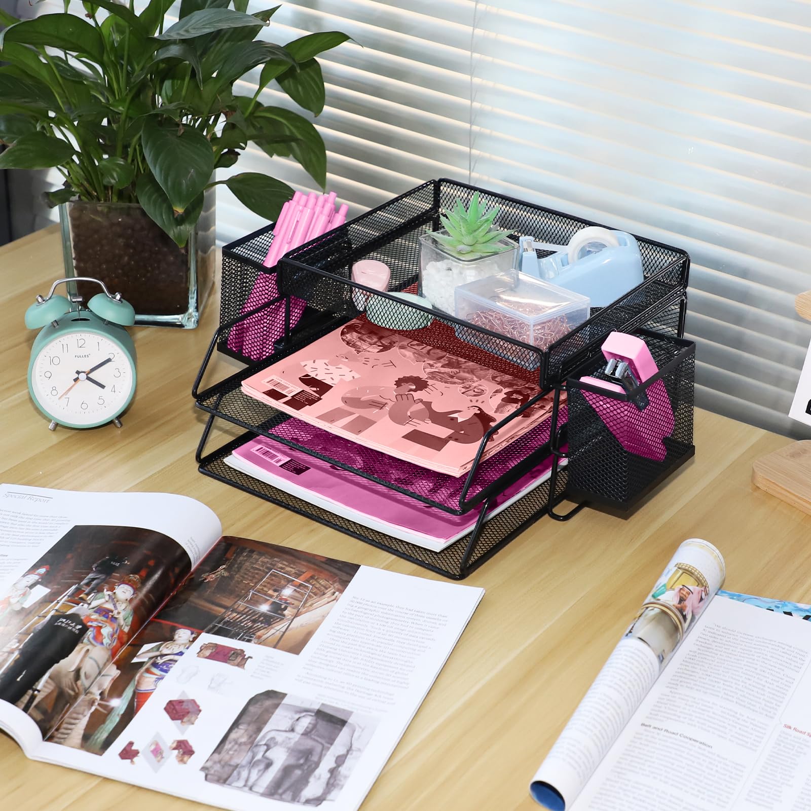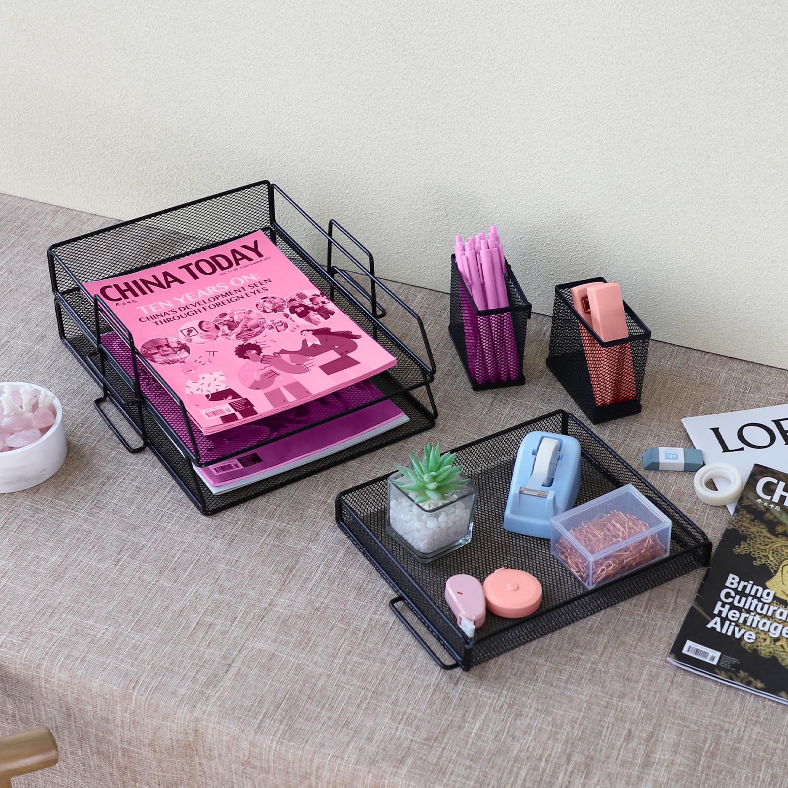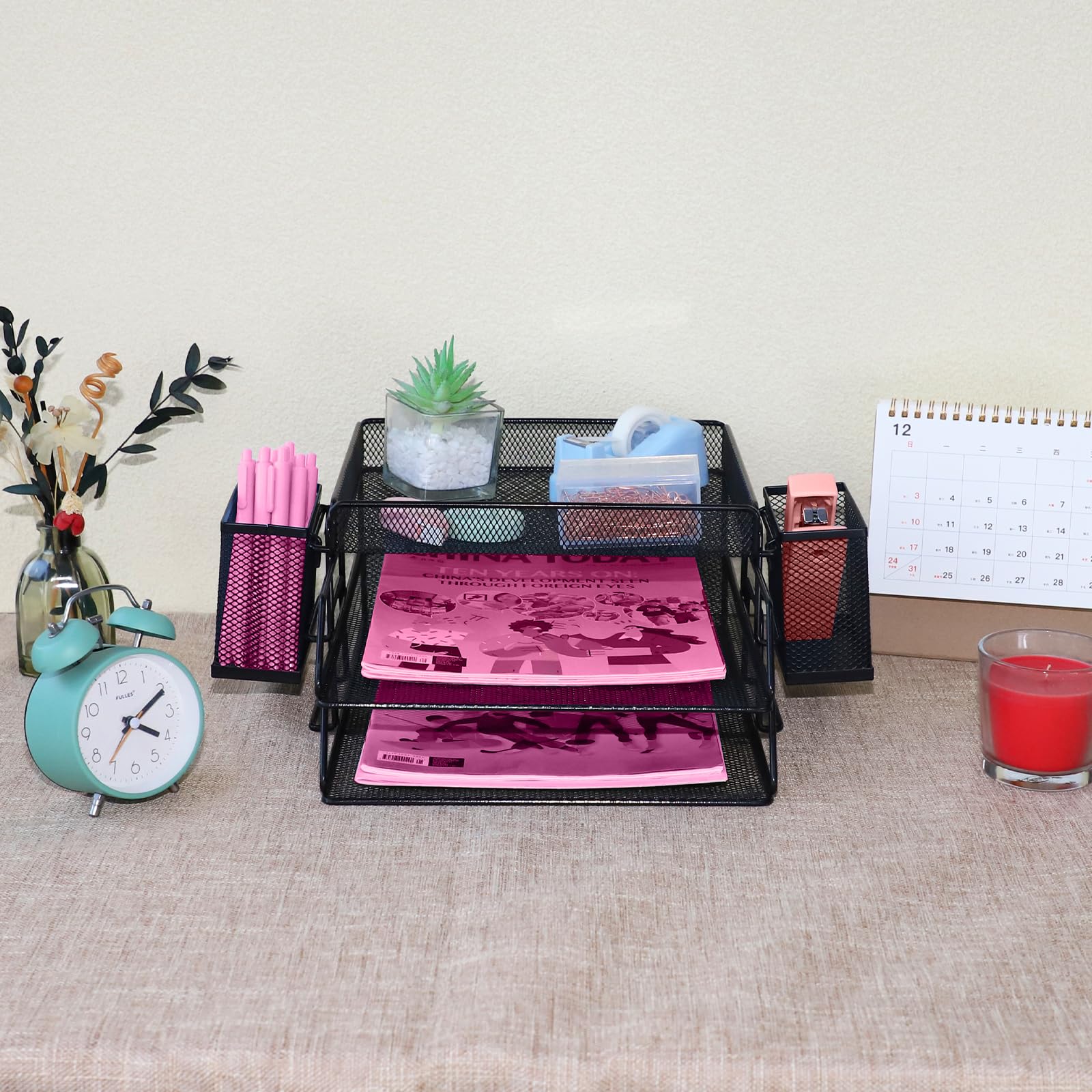 ideallife Stapelbare Briefablage aus Metall, Schwarz Schreibtisch Organizer mit 2 Dokumentenablage und 2 Stiftehalter, Mesh Schreibtischablage für A4 Dokument, Büroablage, Postkörbe