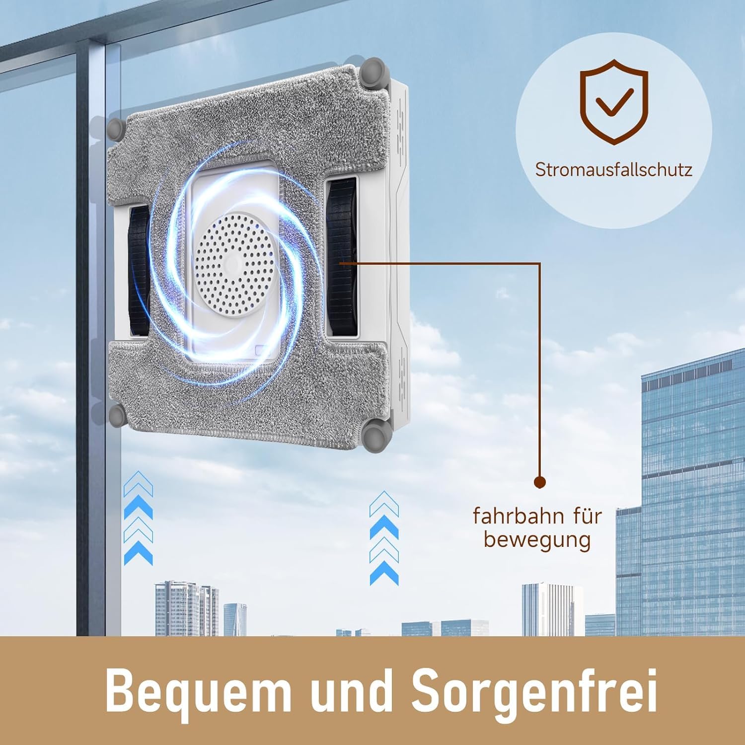 Mit 4000 Pa Saugkraft haftet der iDEEBO G500A Fensterroboter zuverlässig auf allen glatten Oberflächen. Ob Hochhausfenster, Badezimmerspiegel oder Glasbalustrade – er reinigt nicht nur effektiv, sondern bleibt dabei stets sicher haften.