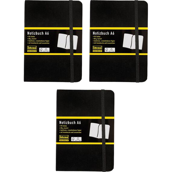 Idena 209282 - Notizbuch DIN A6, kariert, Papier cremefarben, 192 Seiten, 80 g/m², Hardcover in Schwarz (Notizbuch, 3x DIN A6)