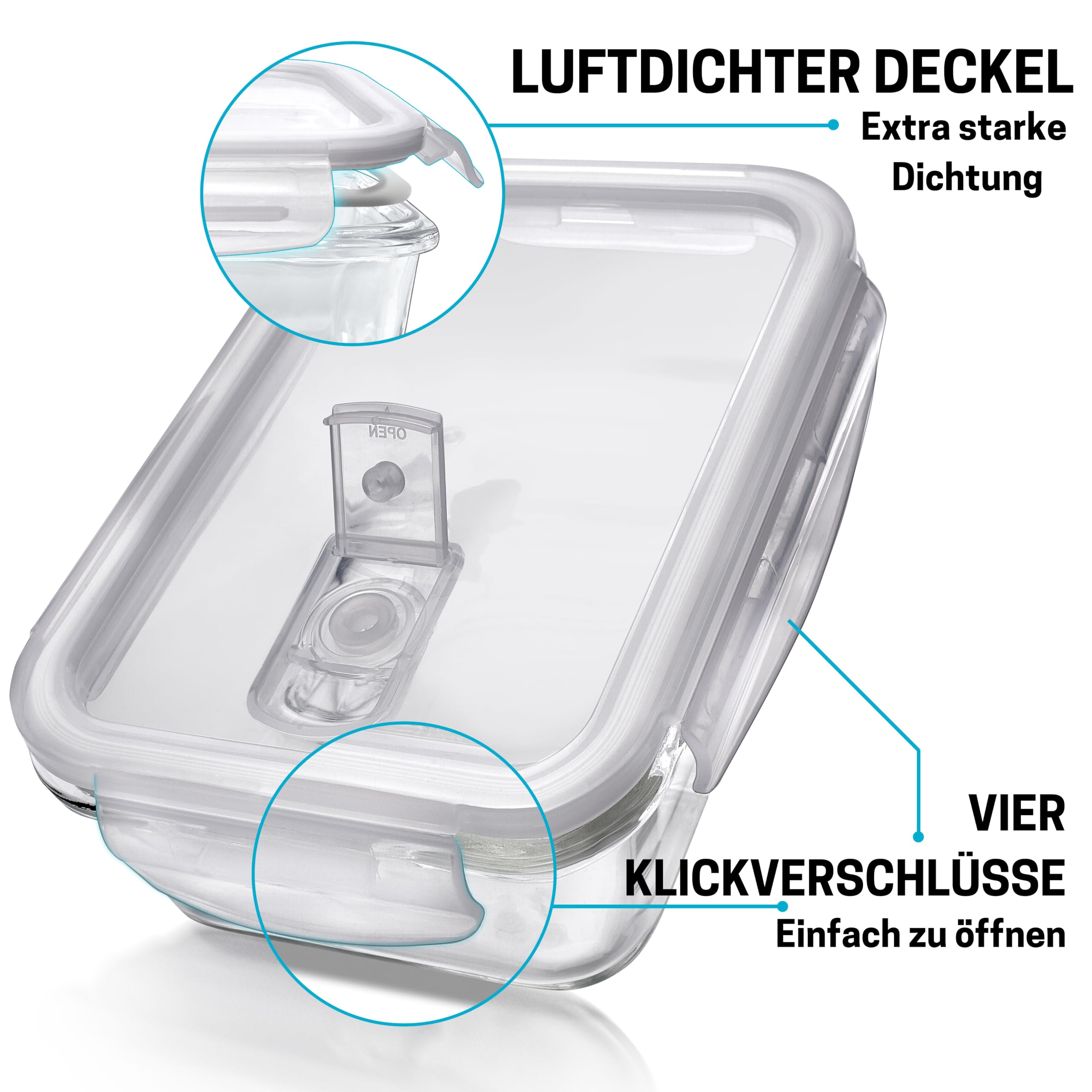 Selbstgekochtes Essen, zuhause und unterwegs!Haben Sie genug von Plastikbehältern, die nach mehrmaligem Gebrauch übel riechen und kaum mehr richtig sauber zu bekommen sind?Suchen Sie nach einem Weg den Verbrauch von Plastik im Alltag zu reduzieren?Holen Sie sich die praktische Art selbstgekochtes Essen für unterwegs aufzubewahren, mit dem neuen Meal-Prep Glascontainer Set von Igluu.Fünf Glascontainer mit jeweils 840ml Volumen, sechs auslaufsichere Deckel mit abnehmbarer Dichtung plus eBook mit zahlreichen Tipps und Tricks, wie Sie auch unter der Woche selbstgekochtes geniessen können.Hält länger frisch: Das LockTab System sorgt dafür, dass ungewünschte Bakterien draussen bleiben und Ihr Essen auslaufsicher im Behälter bleibt.Zeit zu essen: Wenn es Zeit zum Essen ist, entfernen Sie einfach den Deckel und stellen Sie den Glasbehälter in den Ofen. Bei Verwendung in Mikrowelle, lassen Sie den Deckel leicht geöffnet auf dem Behälter.Einfache Reinigung: Nach dem Essen, geben Sie den Glasbehälter einfach in die Spülmaschine (Deckel in die obere Ablage/Etage) oder spülen Sie die Behälter von Hand. Die Deckeldichtung lässt sich abnehmen und kann separat gereinigt werden.Erreichen Sie Ihre Ziele: Ideal um auch unterwegs und ausser Haus auf eine gesunde, vollwertige Ernährung zu achten.