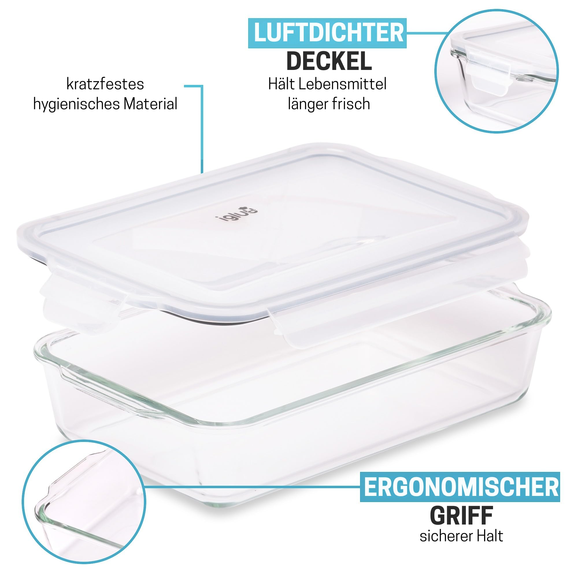 Igluu Meal Prep Lasagne-Auflaufform mit BPA-freiem Schnappverschluss-Deckel 2,2 Liter (3-teilig) – rechteckige, robustes Borosilikatglasform – ofen-, mikrowellen-, gefrier- & spülmaschinengeeignet