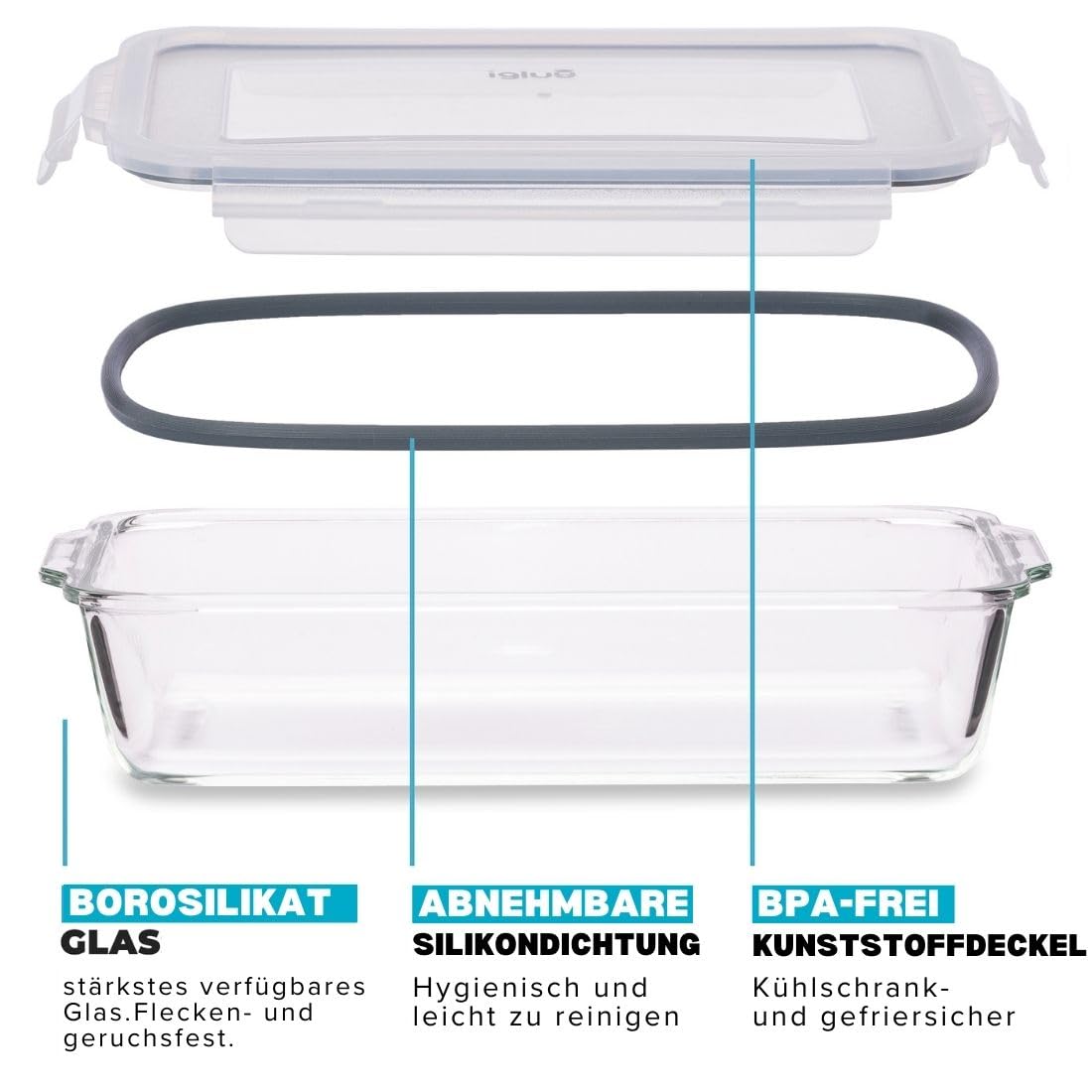 Wie viel einfacher wäre Ihre Woche, wenn Sie eine Lösung für die Aufbewahrung und Zubereitung von Lebensmitteln in Mikrowellenbehältern ohne Kunststoff hätten oder Ihre Mahlzeit im selben Vorratsbehälter im Ofen kochen und danach leicht reinigen - ohne Angst zu haben, dass Chemikalien in Ihre Mahlzeit gelangen? Seien Sie bereit für die Woche mit diesem Igluu Meal Prep Lebensmittelbehälter aus Glas. Eine 2,2 l Glas-Backform, ein verschliessbarer Deckel mit abnehmbaren Dichtungen geben Ihnen alles, was Sie brauchen, um eine schöne hausgemachte Mahlzeit zuzubereiten, die für die Woche bereit ist. Frische: Mit dem LockTab-System können Sie sicher sein, dass unangenehme Bakterien hier draussen bleiben und Ihre nächste Mahlzeit darin bleibt. Zeit zum Essen: Für Lebensmittelsparer macht Sie dieser Aufbewahrungsbehälter immer bereit. Entfernen Sie den Deckel und stellen Sie den Behälter in den Ofen und servieren Sie Ihre köstliche Mahlzeit. Reinigung: Nachdem Sie Ihre Mahlzeit genossen haben, werfen Sie den Behälter einfach in die Spülmaschine (Deckel im oberen Geschirrkorb) oder waschen Sie ihn schnell in der Spüle, um ein brandneues Aussehen, Gefühl und Geruch zu erzielen, ohne die Unannehmlichkeit, die in Kunststoffbehältern zurückbleiben kann. Sie können sogar das Siegel selbst entfernen und waschen! Erreichen Sie Ihre Ziele: Jetzt können Sie Ihre Ernährung leicht beibehalten, erstellen Sie einfach einen wöchentlichen Mahlzeitenplan, lassen Sie Chargen kochen und den Behälter einfrieren oder kühlen, bis er benötigt wird. Alternative zu Kunststoff: Vom Geruch über das Aussehen bis hin zu gesundheitlichen und ökologischen Vorteilen, Glas erledigt die Arbeit.