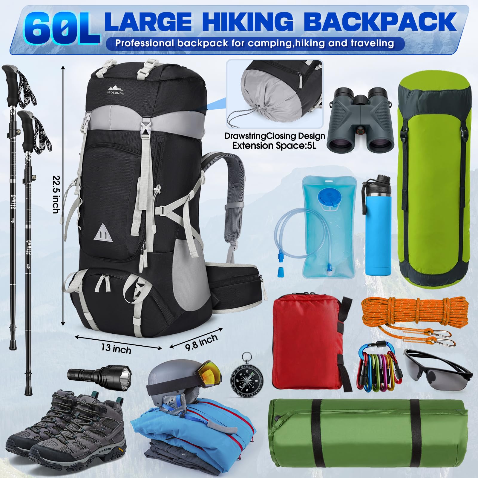 IGOLUMON Wanderrucksack 60L Herren Damen Trekkingrucksack Reiserucksack Grosser Wasserdicht Wandern Rucksack mit Regenhülle für Camping Trekking Mountainering Outdoor Reisen Schwarz