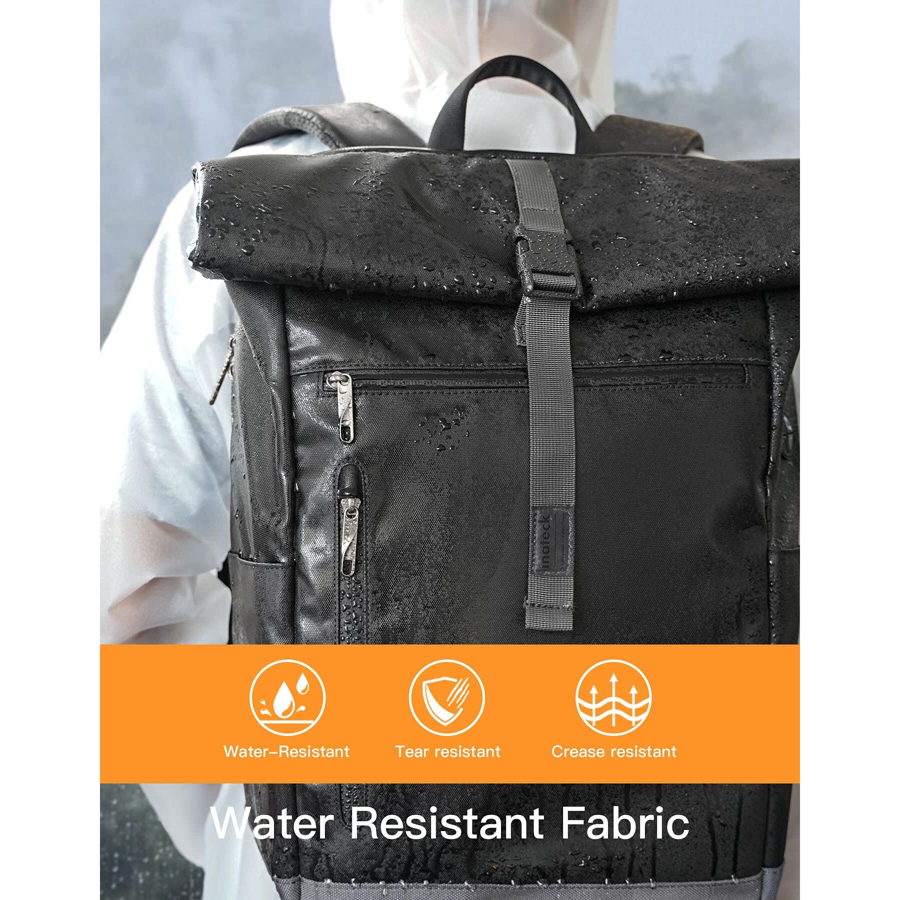 Inateck RollTop Rucksack Herren Damen 25L-30L Fahrradrucksack LaptopRucksack Schulrucksack für Uni Fahrrad Freizeit Job Sport Reisen, Radsport Rucksack Stylische Tagesrucksack mit 17 Zoll Laptopfach. Hinweis: Dieser Rucksack kann nicht an einem Fahrrad befestigt werden. Flexibler Stauraum: Der Rucksack hat Masse von 48cm x 34cm x 15cm (eingerollt) oder 56cm x 34cm x 15cm (ausgerollt). Der Flexible 25l bis 30l Stauraum bietet Platz für Bücher, Kleidung, A4-Papier, Laptops etc. und ist divers einsetzbar. Ideal für Arbeit, Schule, Freizeit- und Wochenendausflüge. Auch wenn der Rucksack vollgepackt wird, sieht er nicht prall und klobig aus. Spritzwassergeschützt: Wasserabweisendes Foliengewebe, Spritzwassergeschütztes Polyester und wasserabweisende SBS-Reissverschlüsse schützen den Rucksack vor Wasser und halten den Inhalt trocken. Zwei Zugänge: Sie können auf Gegenstände im Rucksack schnell und einfach zugreifen. Über den Rollverschluss oder durch Öffnen des hinteren Reissverschlusses haben Sie direkt Zugang auf den Inhalt. Geräumige Taschen: Im Hauptfach befindet sich ein gepolstertes Fach für Laptops (bis 17 Zoll), ein gepolstertes Fach für iPad oder Tablet (bis 11 Zoll) und ein Fach für eine Powerbank. In den Seitentaschen findet sich Platz für eine Flasche oder einen Regenschirm. In den beiden Vordertaschen und den kleinen weiteren Taschen lassen sich Gegenstände aller Art verstauen. Hinweis: Dieser Rucksack kann nicht an einem Fahrrad befestigt werden. Kopfhörer-/Ladeöffnung: Weiche Öffnung aus Gummi, konzipiert um Kopfhörer- oder Ladekabel hindurch zu stecken. So laden Sie Ihre Geräte bequem unterwegs.