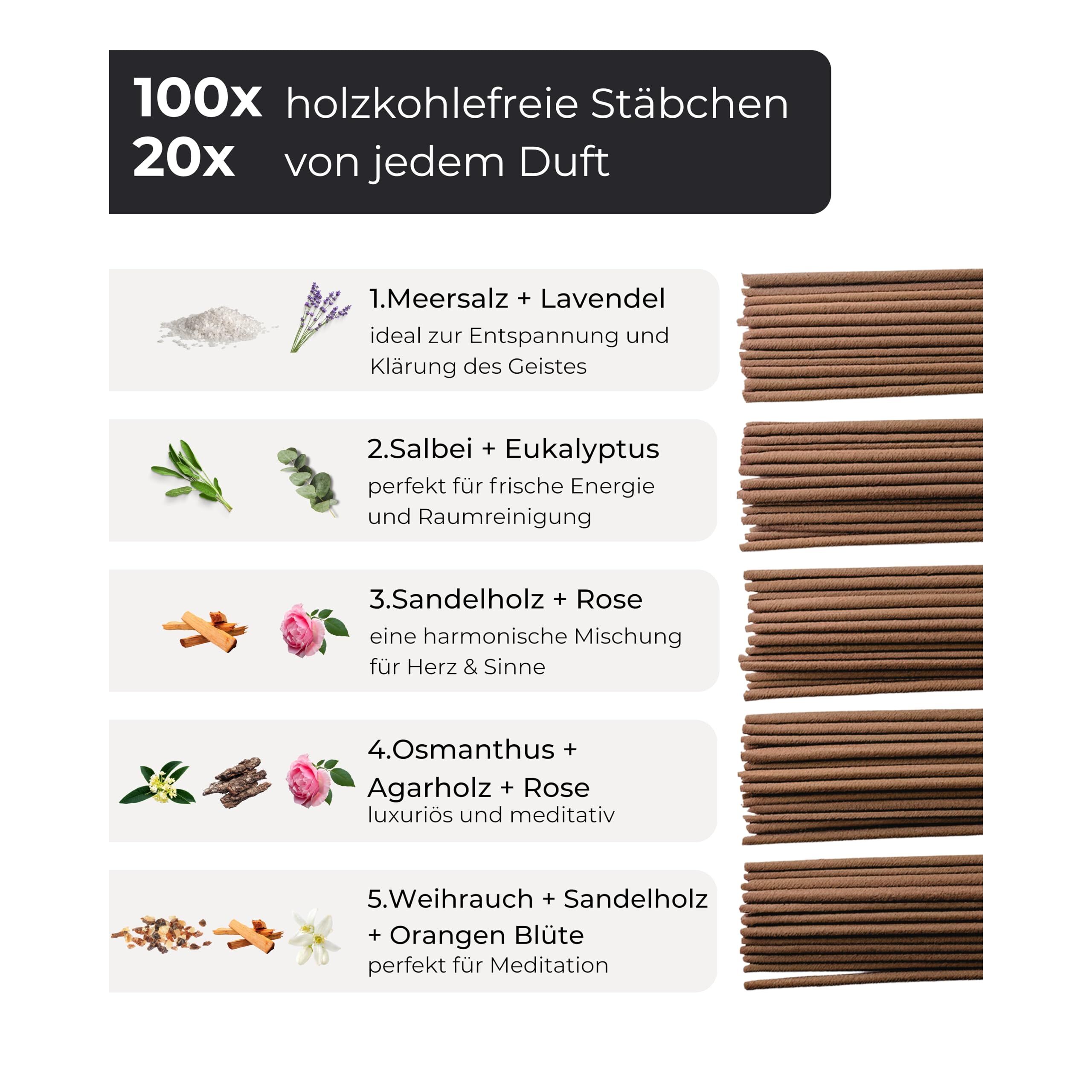 - DUFTVIELFALT SET: 100 incense sticks – Meersalz Lavendel, Salbei Eukalyptus, Sandelholz Rose, Osmanthus Sandelholz Rose & Weihrauch Sandelholz Blume.