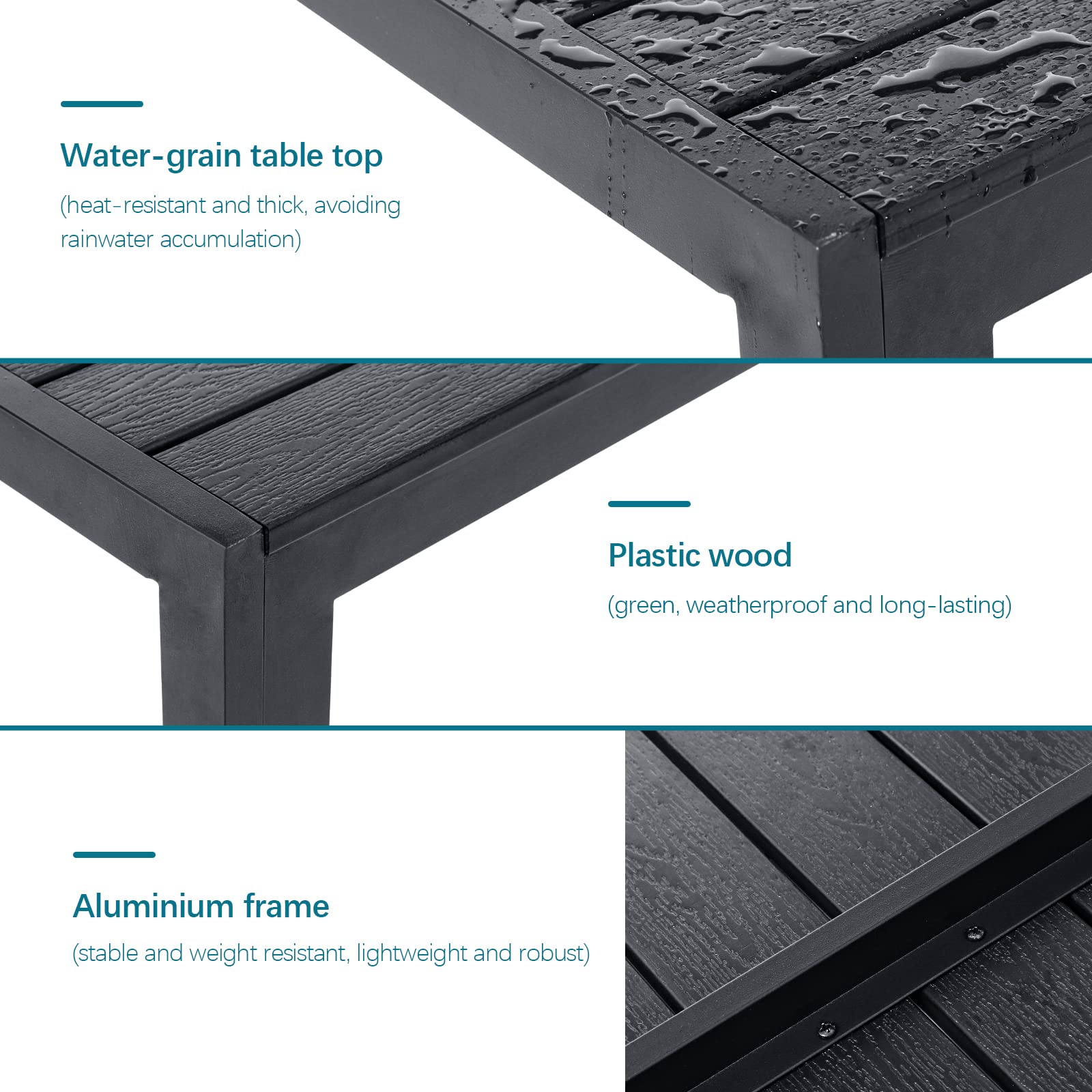 Die Tischplatte besteht aus Kunststoff-Holzplatten, die im Vergleich zu herkömmlichen Holz- und Eisengestellen besonders wasser-, feuchtigkeits- und sonnenbeständig sowie rostfrei sind. Das Material ist angenehm zu berühren, leicht zu reinigen und zu pflegen und eignet sich perfekt für den Einsatz im Freien.