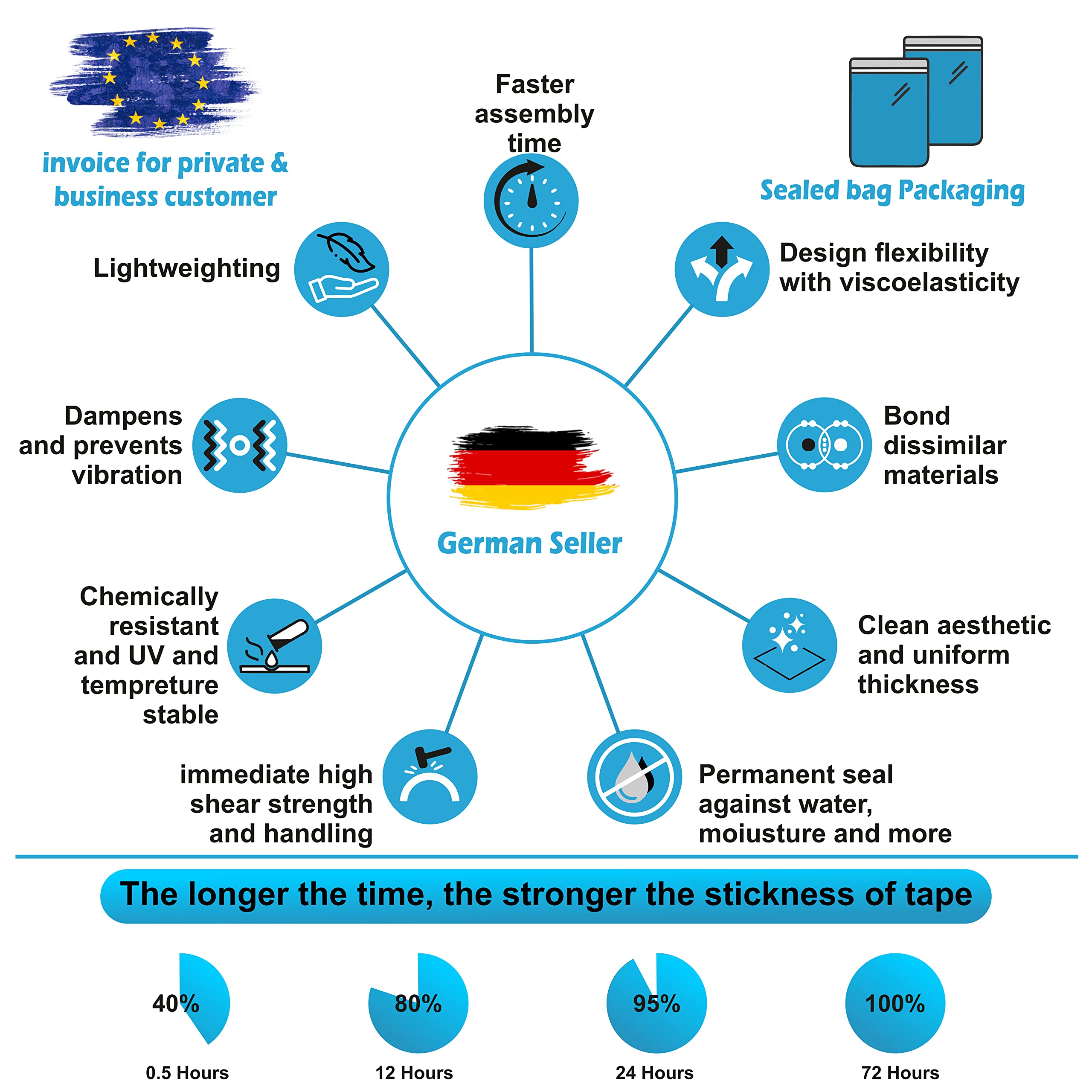 Produktbeschreibungen Perfekt für die befestigung von Maschienen, LED-Lichtbänder, Motorrad, Glas, Auto Karosserieseitenleisten, Bad, Hakenhalter, Fenster, Strassenschild aus Metall, Industrie, Hängeschilder und Bilderrahmen. Acrylschaum-Klebeband mit einzigartigen Eigenschaften, das extra für die Befestigung von diverse bauteilen enwickelt wurde.ProduktdetailsSchnelles und einfaches Kleben sowie leistungsstarke und dauerhafte HaltbarkeitKann mechanische Verbindungselemente (Nieten, Schweissnähte, Schrauben) oder flüssige Klebstoffe ersetzen, wodurch Bohren, Schleifen, Nachbearbeitung, Schrauben, Schweissen und Säubern eingespart werdenHohe dynamische Belastungsabsorption reduziert Vibrationen und StösseSchafft eine dauerhafte Abdichtung gegen Wasser, Feuchtigkeit usw.Ermöglicht die Verwendung von dünneren, leichteren und ungleichen Materialien Hervorragende Haftungsleistung bei niedrigen TemperaturenHält die durch Temperaturänderungen verursachte Schrumpfung und Dehnung des Teils ein und behält gleichzeitig gute Spannungsrelaxationseigenschaften beiBietet eine hohe Endhaftung und SchälfestigkeitFunktioniert gut in einem breiten Spektrum von Wetter-, Lösungsmittel- und TemperaturbedingungenViskoelastizität ermöglicht Dehnung und Relaxation bei Belastung und minimiert so die Belastung der KlebefugeFunktioniert gut in einem breiten Spektrum von Wetter-, Lösungsmittel- und Temperaturbedingungen