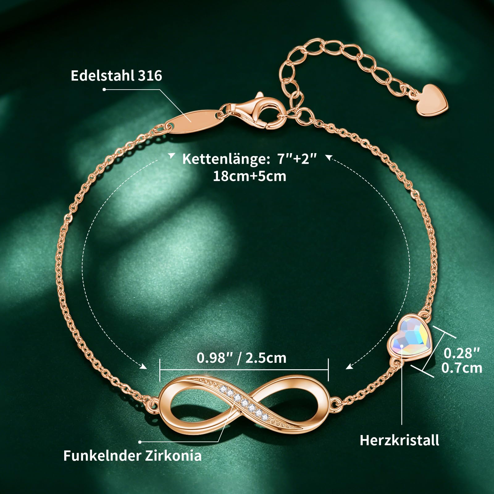 - MATERIALIEN --- Die Damenarmbänder bestehen aus Edelstahl 316L. Dieses 7"+2" verstellbare Armband wird mit einem Karabinerverschluss befestigt und ist mit einem Herzanhänger und einem Unendlichkeitssymbol verziert, das mit österreichischen Kristallen glänzt