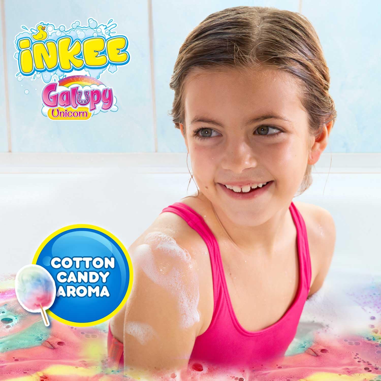 INKEE Badestreusel Galupy Unicorn | 100g Badesalz Kinder mit 4 Farbschichten- Mit Zuckerwatten-Aroma und Kakaobutter