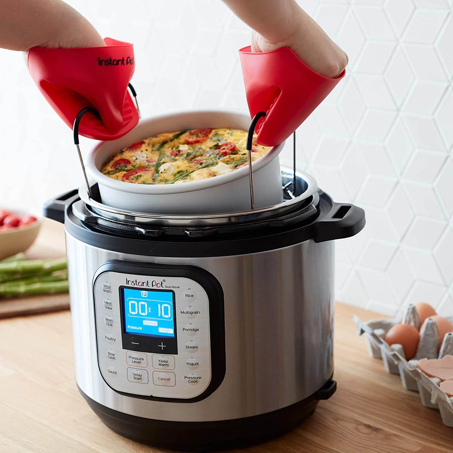Mit dem Duo Nova ist das Kochen mit einem Instant Pot noch einfacher. Sein automatischer, leicht zu verschliessender Deckel dichtet den Druck für Sie ab. Der Duo Nova ist 7 Geräte in einem: Schnellkochtopf, Sauteuse, Dampfgarer, Langsamkocher, Reiskocher, Speisenwärmer und Joghurtbereiter. Befreien Sie Ihren Küchentisch von Unordnung und erledigen Sie alles mit nur einem Gerät. Erhältlich in verschiedenen Grössen: 3L - ideal zum Kochen von Reis, Beilagen oder Mahlzeiten für bis zu 3 Personen. 5,7 l - perfekt für die Verpflegung von bis zu 6 Personen. 8L und 10L - ideal für grosse Familien, für das Kochen in grossen Mengen oder für die Vorbereitung von Mahlzeiten für die kommende Woche. Mit den bequemen Smart-Programmen, die sich mit einem Tastendruck einstellen lassen, können Sie sich anderen Dingen widmen, während Ihr Essen schnell und sicher kocht. Die intelligenten Programme des Duo Nova lassen sich auch individuell anpassen, so dass Sie Ihre Lieblingsgerichte aufzeichnen können! Das leicht ablesbare Bedienfeld zeigt genau an, in welchem Stadium sich der Kochvorgang befindet, und das LCD-Display lässt den DUO Nova auf der Theke elegant aussehen. Der Innentopf ist langlebig und spülmaschinenfest, was die Reinigung noch einfacher macht. Übersetzt mit www.DeepL.com/Translator (kostenlose Version)