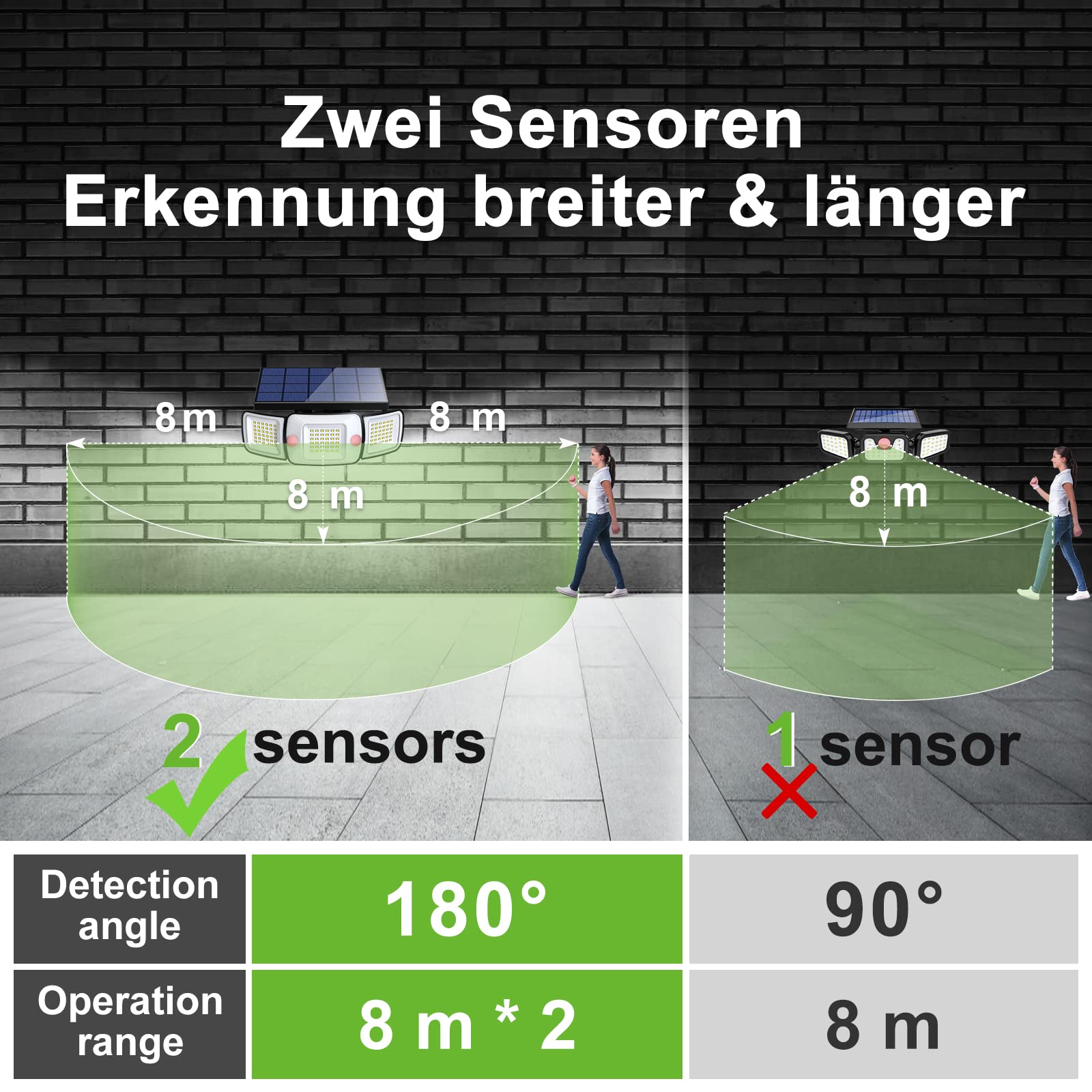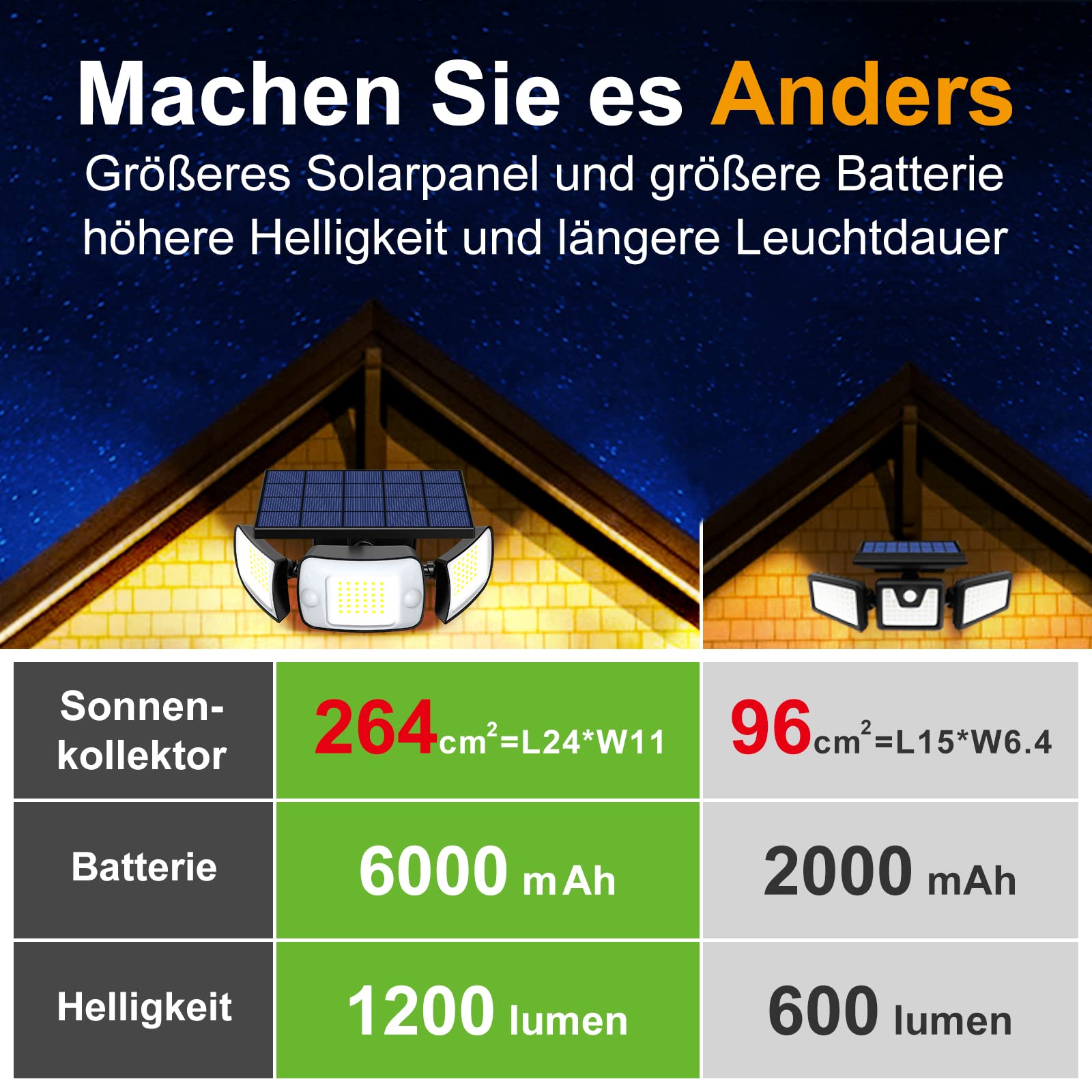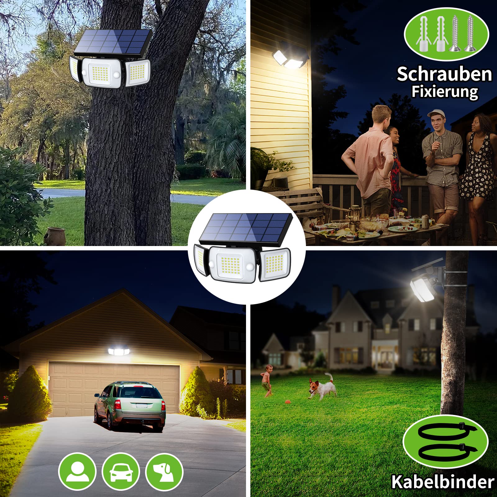 INTELAMP Solarleuchten für den Aussenbereich mit Bewegungsmelder, 6000 mAh, Solarleuchten für den Aussenbereich, 108 LED-Solarlampe, für den Aussenbereich, ideal für Terrasse, Veranda, Garage, Hof, Strassen, IP65 wasserdicht, riesige Weitwinkelbeleuchtung: riesiger 3-Kopf, superhell Solarleuchten für den Aussenbereich mit Bewegungssensor, 108 LED-Lampenperlen mit hoher Helligkeit (Helligkeit bis zu 1200 Lumen), 270°-Weitwinkel-Beleuchtungsdesign und beleuchteter Fläche 70 Quadratmeter, beleuchtet einen grösseren Bereich als eine Einzelkopf-Solarleuchte für den Aussenbereich . 2 PIR-Sensor 3 Beleuchtungsmodi: Wasserdichter Lampen-Solar-Bewegungssensor mit Dual-Sensor-Design erkennt Bewegungen über einen viel grösseren Bereich als Einzelsensor-Modelle und bietet eine 180-Grad-Bereichserkennung, die Erkennung erreicht lose 10–16 Meter. Gleichzeitig stehen Ihnen bei Solarleuchten 3 Beleuchtungsmodi zur Auswahl, die Ihren unterschiedlichen Anforderungen gerecht werden. ABS-Kunststoff IP65 wasserdicht: Unsere Aussen-Solarleuchte mit Bewegungsmelder verwendet ein hochwertiges ABS-Kunststoffgehäuse und ist perfekt für den Einsatz bei jedem Wetter (Regen, Schnee, Frost und Sonnenschein), selbst bei extremen Wetterbedingungen können die Solarleuchten normal hoch sein Effizienz, Energieeinsparung und Umweltschutz: Unsere wetterfesten Solarleuchten für den Aussenbereich verwenden einen sicheren Lithium-Eisenphosphat-Akku mit 6000 mAh und super grosser Kapazität, ein Silikon-Solarpanel mit einer hohen Umwandlungsrate von 22 %, das mehr als 2000 Ladevorgänge erreichen kann Zyklen und einer Lebensdauer von 5 Jahren. Einfache Installation: Unser Solar-LED-Strahler mit Aussenbewegungssensor wird mit Schrauben und Kabelbindern geliefert. Sie können es an der Wand installieren oder an einem Baum oder einer Säule befestigen. Bitte installieren Sie das Solarpanel für einen besseren Ladeeffekt in Richtung der Sonne (ideale Installationshöhe beträgt etwa 1,7 bis 2 Meter).