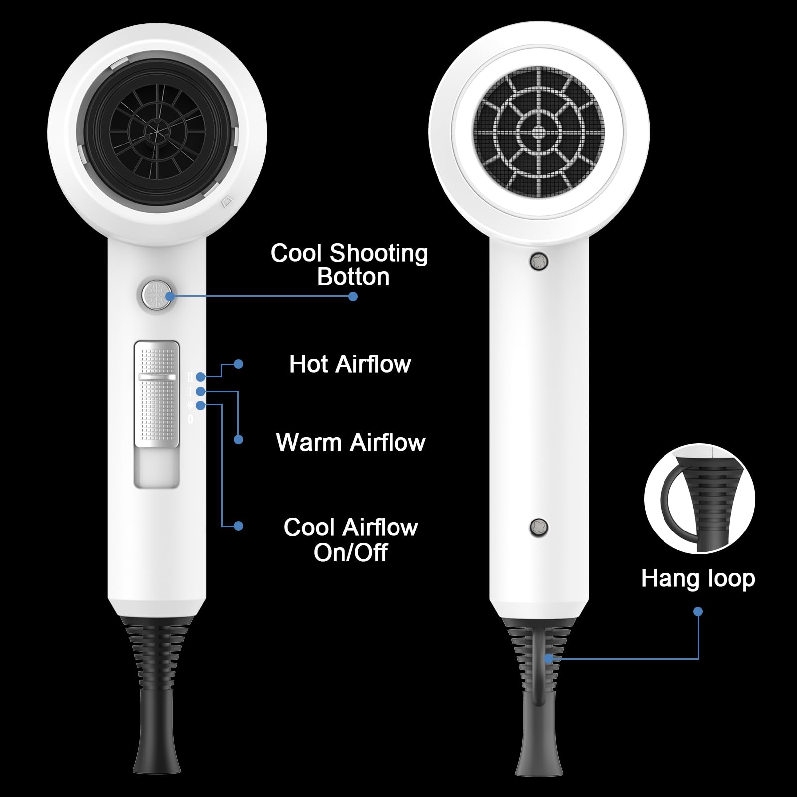 - 【1 Cool Shooting Button & 3 Wärmeeinstellungen】 Ein Drehzahlregler+ Drei Wärmeeinstellungen für vollständige Trocknungs- und Stylingflexibilität. Einfach, die Temperatur und Windgeschwindigkeit zu steuern, um Ihre Lieblingsfrisur zu Hause zu machen.