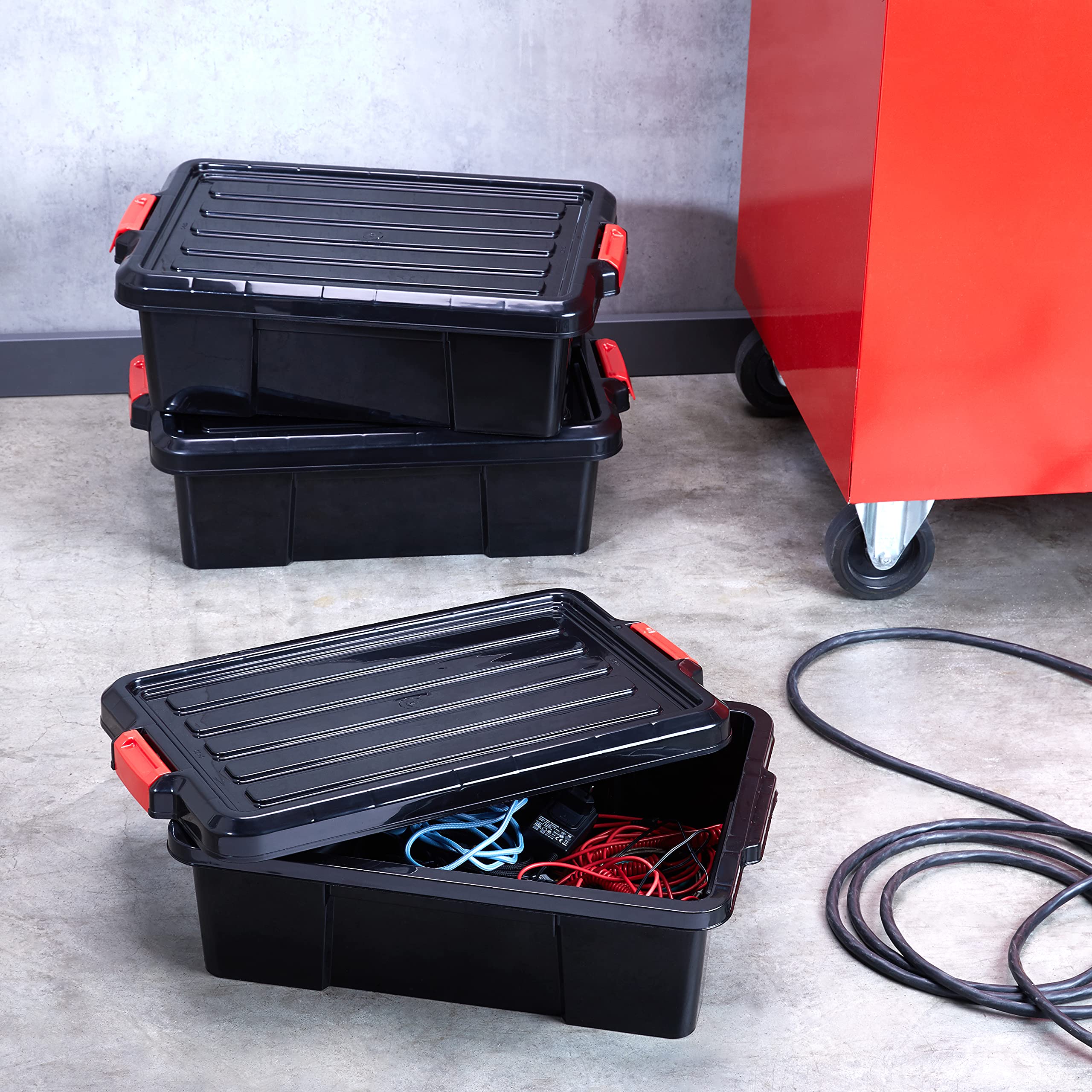 Iris Ohyama, Kunststoffboxen mit Deckel und Clip-Verschluss, 25L, 3er Set, nestbar, BPA-frei, Dachboden, Schuppen, Garage, SK-230, Schwarz