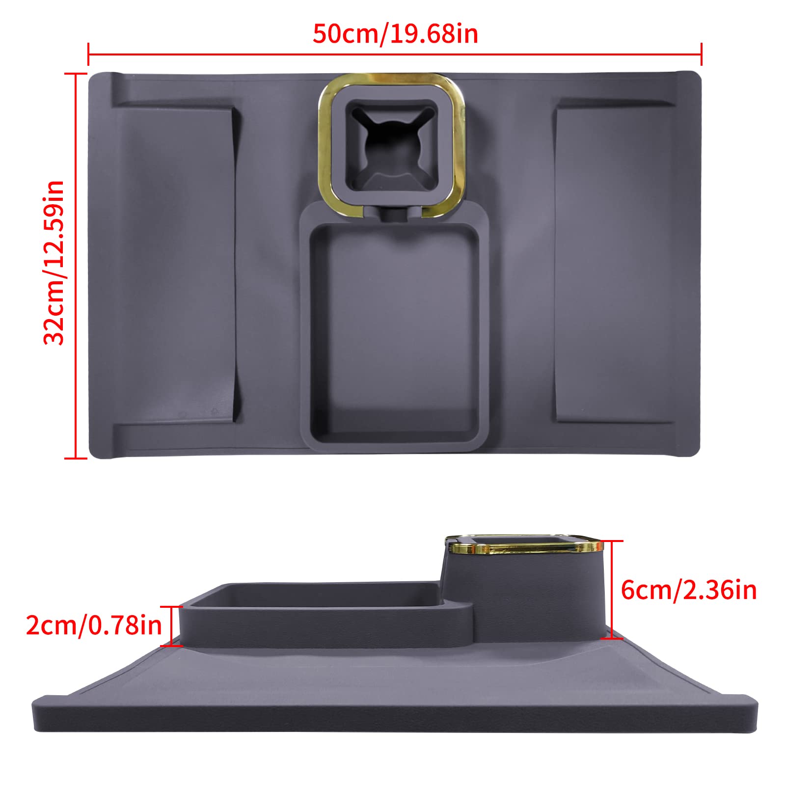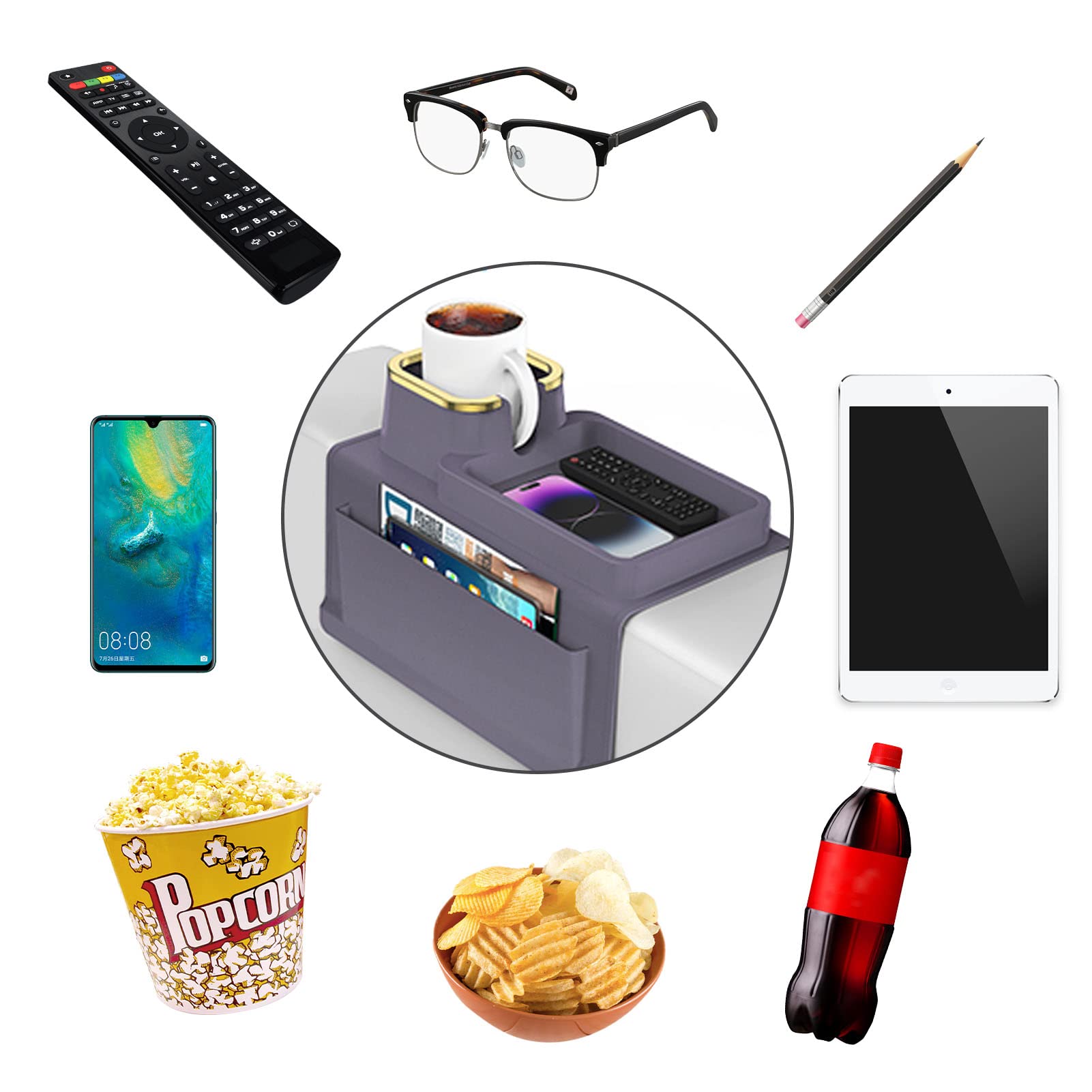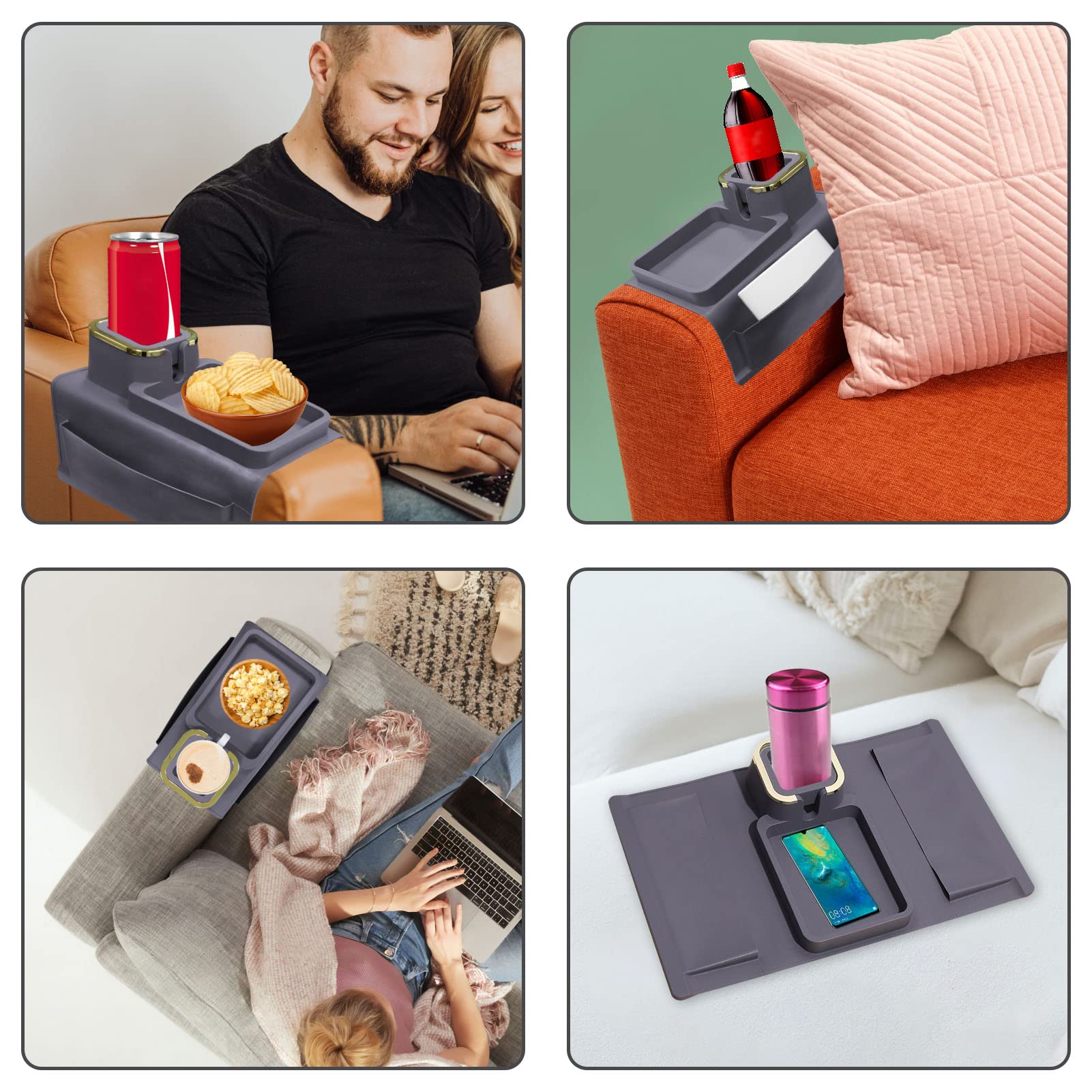 Eigenschaften:⚫ Sofa-Armlehnentisch aus hochwertigem Silikon mit 4 Eisenrohren an der Unterseite, um die Armlehnen der Möbel zu verriegeln und sie an Ort und Stelle zu halten, sie werden sich kaum bewegen.⚫ Der Sofabecherhalter kann Kaffeetassen, Getränkedosen, Bierflaschen usw. halten; das Tablett kann leicht Ihr Mobiltelefon, Ohrhörer, Fernbedienung oder Snacks halten.⚫ Schützt das Sofa effektiv vor Flecken, Beschädigungen usw. So dass Sie ganz in das Sofa eintauchen und einen Film oder eine Sportsendung geniessen können.