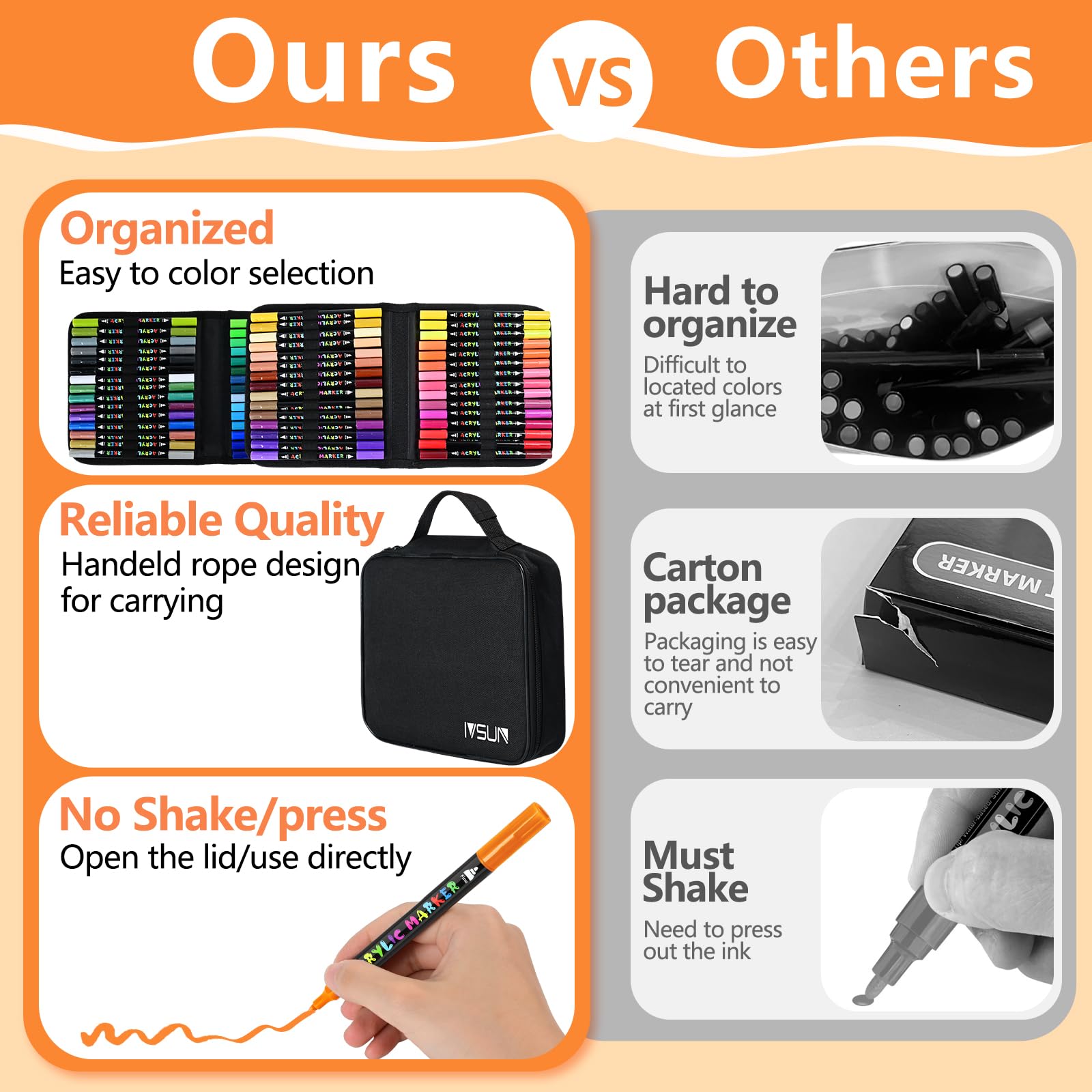 Entfesseln Sie Ihre Kreativität mit dem IVSUN 60er Acrylmarker-Set! Es bietet 52 lebendige Farben und 8 glitzernde Metallic-Töne, die jede Bastelidee zum Leben erwecken. Die praktischen Doppelspitzen – eine 1 mm Feinspitze und eine 1-5 mm Pinselspitze – ermöglichen präzise Details und grossflächige Schattierungen, perfekt für professionelle Künstler und Hobbykreative. Unsere Acrylstifte eignen sich für eine Vielzahl von Oberflächen wie Papier, Stein, Holz, Metall und Stoff. Die schnell trocknende und lichtbeständige Formel lässt Sie sofort loslegen, ohne lästige Vorbereitung. Verpackt in einem praktischen Etui mit speziellen Fächern ist dieses Set ideal für unterwegs. Ein perfektes Geschenk für Kunstliebhaber zu Geburtstagen, Ostern, Halloween, Weihnachten und mehr. Lassen Sie Ihrer Kreativität freien Lauf und gestalten Sie individuelle Meisterwerke!