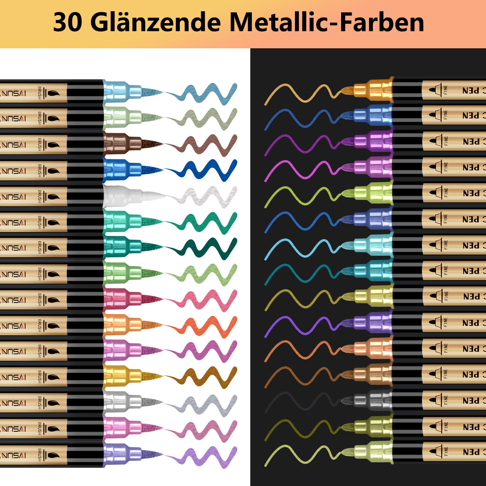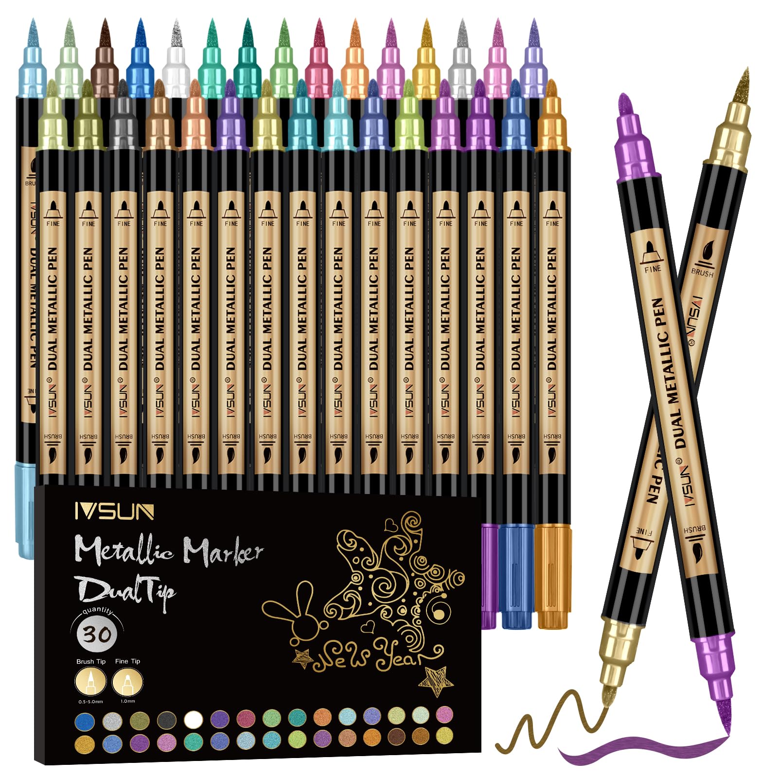 IVSUN Metallic Marker Stifte Set, 30 Dual tip Metallic Acrylstifte Wasserfest für Fotoalbum Gästebuch Hochzeit Scrapbook Schwarzes Papier Gold Stift zum Bemalen Steine Glas Holz Deko Ostereier Ostern