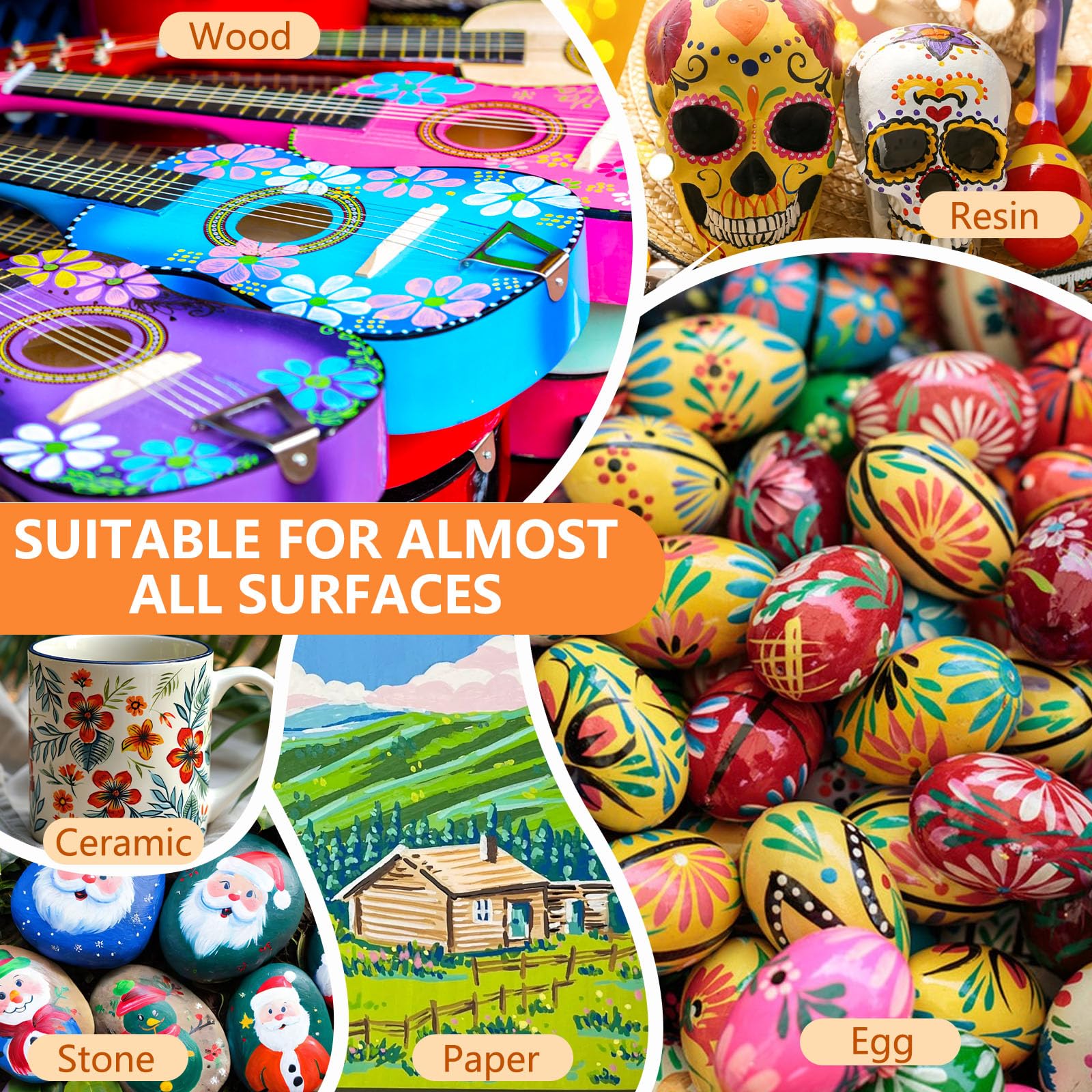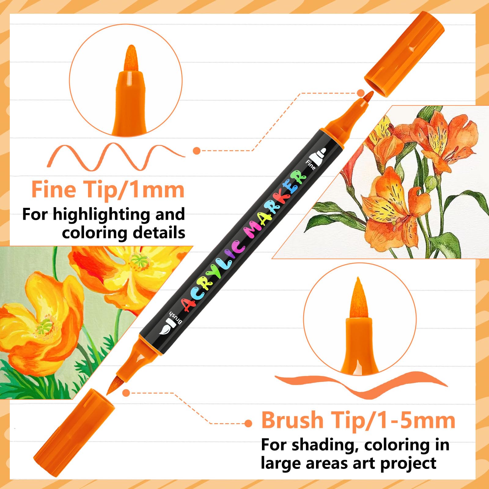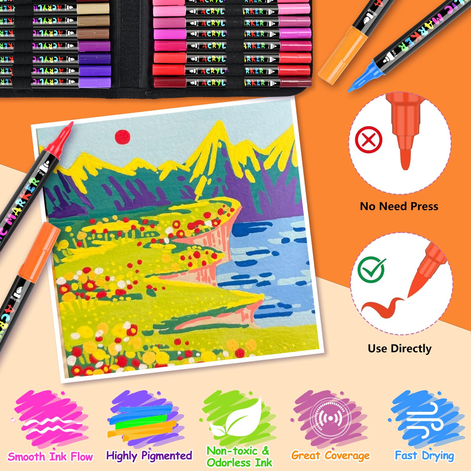 Unsere Marker funktionieren auf verschiedenen Oberflächen wie Papier, Stein, Holz, Metall und Stoff. Sie sind schnell trocknend und lichtbeständig, sodass Sie sofort loslegen können, ohne zu warten oder zu schütteln.