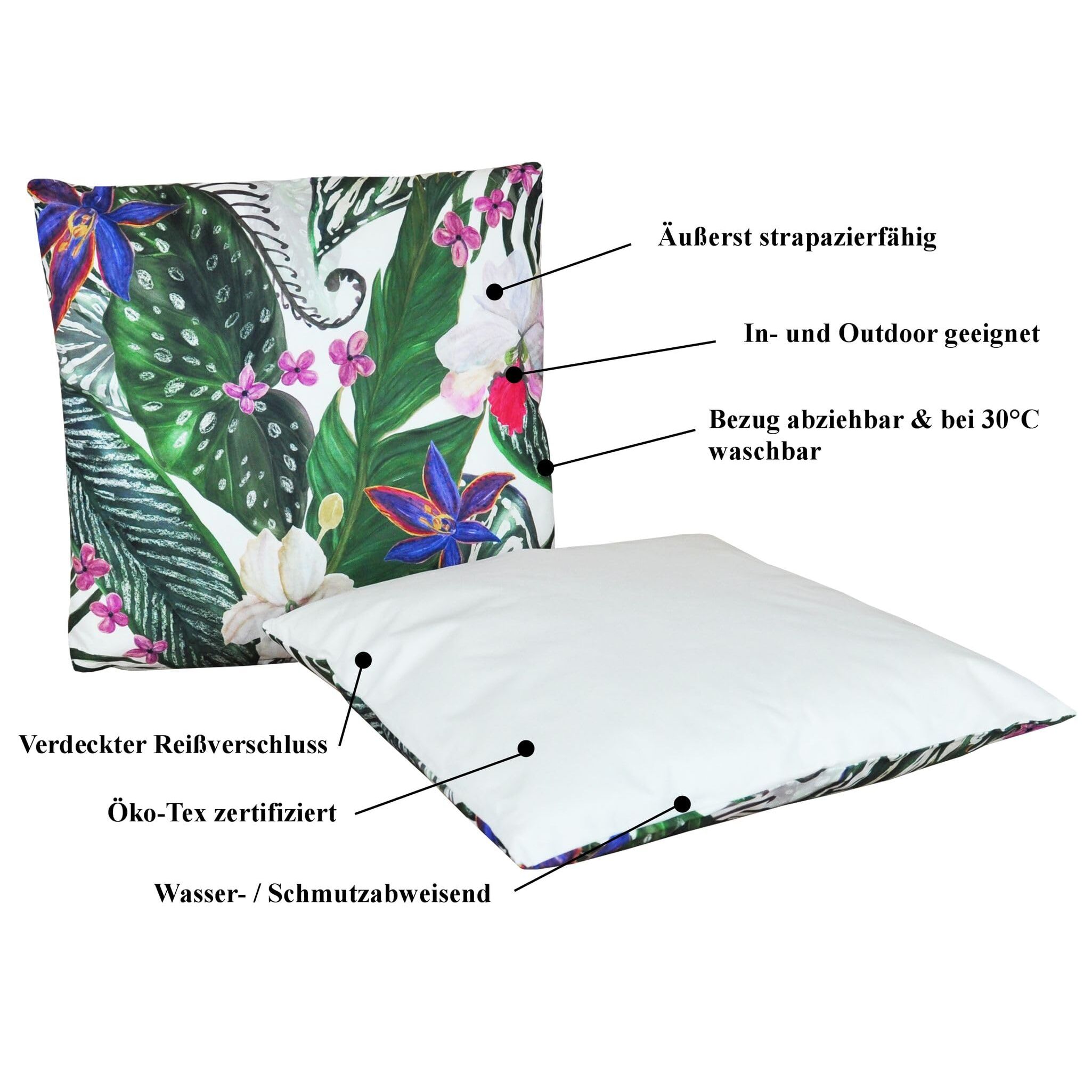 In- & Outdoor Dekokissen mit Motiv 45x45cm der Marke 'JACK'Frühling, Sommer, Herbst & Winter ist Gartenzeit für diese coolen, farbenfrohen und robusten Outdoorkissen. Was macht mehr Spass, als mit den richtigen Accessoires den Garten, den Balkon, den Wintergarten oder die Terrasse freundlich und extravagant dekorieren zu können? Mit dieser eleganten und äusserst dekorativen Kissen-Serie der aussergewöhnlichen Designserie 'Anna´s Collection' für den Innen- und Aussenbereich, gelingt Ihnen das im Handumdrehen. Durch ihre Optik sorgen diese farbenfrohen Wohn-Accessoires sofort für ein gemütliches Ambiente. Diese mit einer wasserresistenten Oberfläche ausgestatteten Sitzkissen sind sowohl Wasser-, als auch Schmutzabweisend wodurch ein dauerhafter und langlebiger Schutz der Oberfläche gegeben ist. Sie sind daher auch äusserst pflegeleicht und sehen - da man sie seltener waschen muss - viel länger 'wie neu' aus. Zusätzlich sind diese Kissenbezüge UV - Resistent und daher besonders lichtecht.Die Kissenfüllung besteht aus einer komfortablen und bequemen Hochbauschvliesfüllung (100% Polyester) und durch den verdeckten Marken-Reissverschluss lassen sie sich sehr einfach abziehen und bis 30 Grad in der Waschmaschine waschen.Eigenschaften:Exclusiv für die Firma JACK - Jetzt Alles Clever Kaufen - Marcus Thiele produziertFür Innen- und Aussenbereich geeignetRobust und strapazierfähigMasse ca. 45 x 45 x 8 cmMit verdecktem ReissverschlussBezug abziehbar & waschbar bei 30 GradGewicht der Kissenfüllung ca.: 350gGesamtgewicht Kissen ca.: 470gLOTUS EFFEKT! Wasser- und SchmutzabweisendBezug/Füllung aus 100% PolyesterPflegeleicht & SchnelltrocknendÖko - Tex Standard 100 SiegelLieferumfang: 1x Kissen (