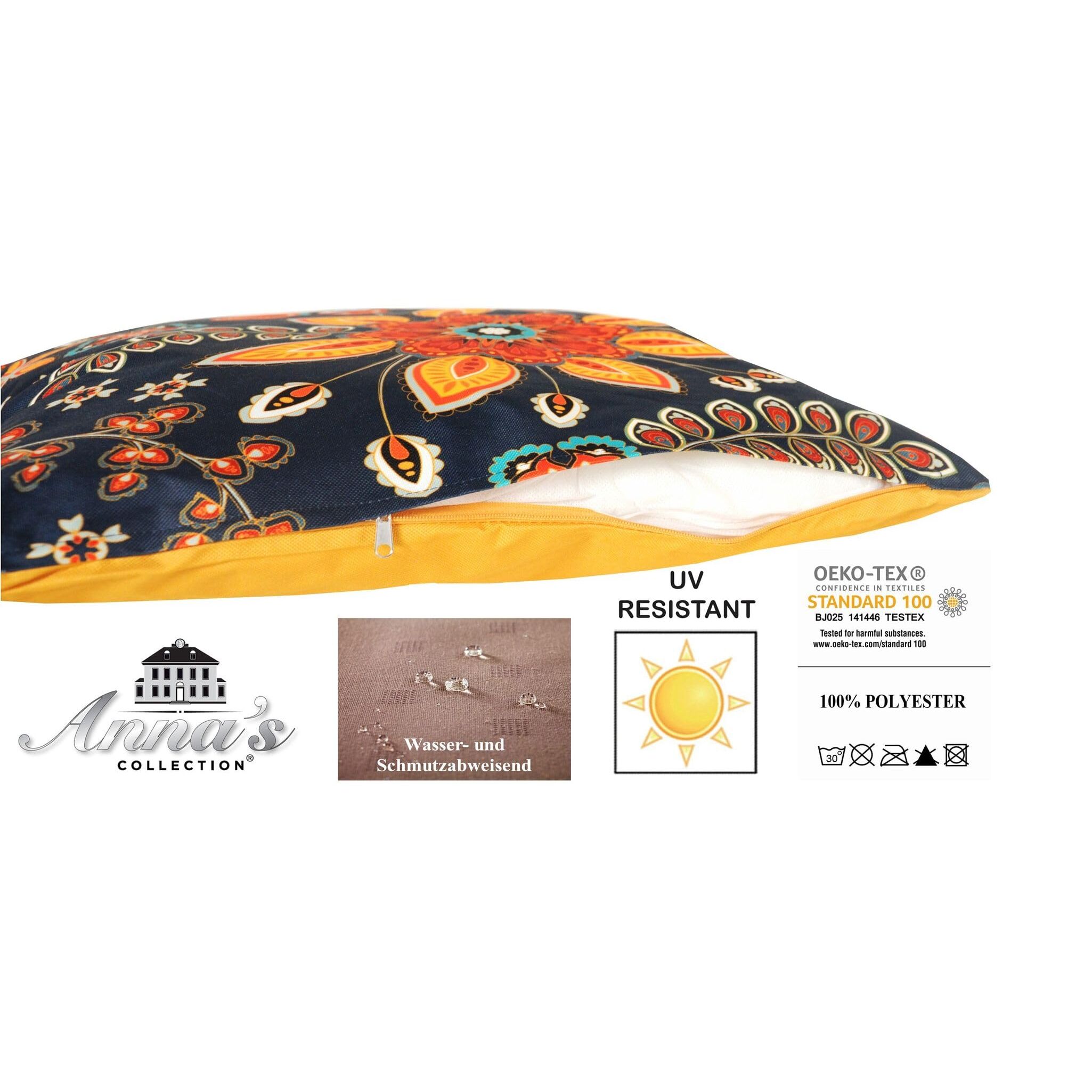 In- & Outdoor Dekokissen mit Motiv 45x45cm der Marke 'JACK'Frühling, Sommer, Herbst & Winter ist Gartenzeit für diese coolen, farbenfrohen und robusten Outdoorkissen. Was macht mehr Spass, als mit den richtigen Accessoires den Garten, den Balkon, den Wintergarten oder die Terrasse freundlich und extravagant dekorieren zu können? Mit dieser eleganten und äusserst dekorativen Kissen-Serie der aussergewöhnlichen Designserie 'Anna´s Collection' für den Innen- und Aussenbereich, gelingt Ihnen das im Handumdrehen. Durch ihre Optik sorgen diese farbenfrohen Wohn-Accessoires sofort für ein gemütliches Ambiente. Diese mit einer wasserresistenten Oberfläche ausgestatteten Sitzkissen sind sowohl Wasser-, als auch Schmutzabweisend wodurch ein dauerhafter und langlebiger Schutz der Oberfläche gegeben ist. Sie sind daher auch äusserst pflegeleicht und sehen - da man sie seltener waschen muss - viel länger 'wie neu' aus. Zusätzlich sind diese Kissenbezüge UV - Resistent und daher besonders lichtecht.Die Kissenfüllung besteht aus einer komfortablen und bequemen Hochbauschvliesfüllung (100% Polyester) und durch den verdeckten Marken-Reissverschluss lassen sie sich sehr einfach abziehen und bis 30 Grad in der Waschmaschine waschen.Eigenschaften:Exclusiv für die Firma JACK - Jetzt Alles Clever Kaufen - Marcus Thiele produziertFür Innen- und Aussenbereich geeignetRobust und strapazierfähigMasse ca. 45 x 45 x 8 cmMit verdecktem ReissverschlussBezug abziehbar & waschbar bei 30 GradGewicht der Kissenfüllung ca.: 350gGesamtgewicht Kissen ca.: 470gLOTUS EFFEKT! Wasser- und SchmutzabweisendBezug/Füllung aus 100% PolyesterPflegeleicht & SchnelltrocknendÖko - Tex Standard 100 SiegelLieferumfang: 1x Kissen (