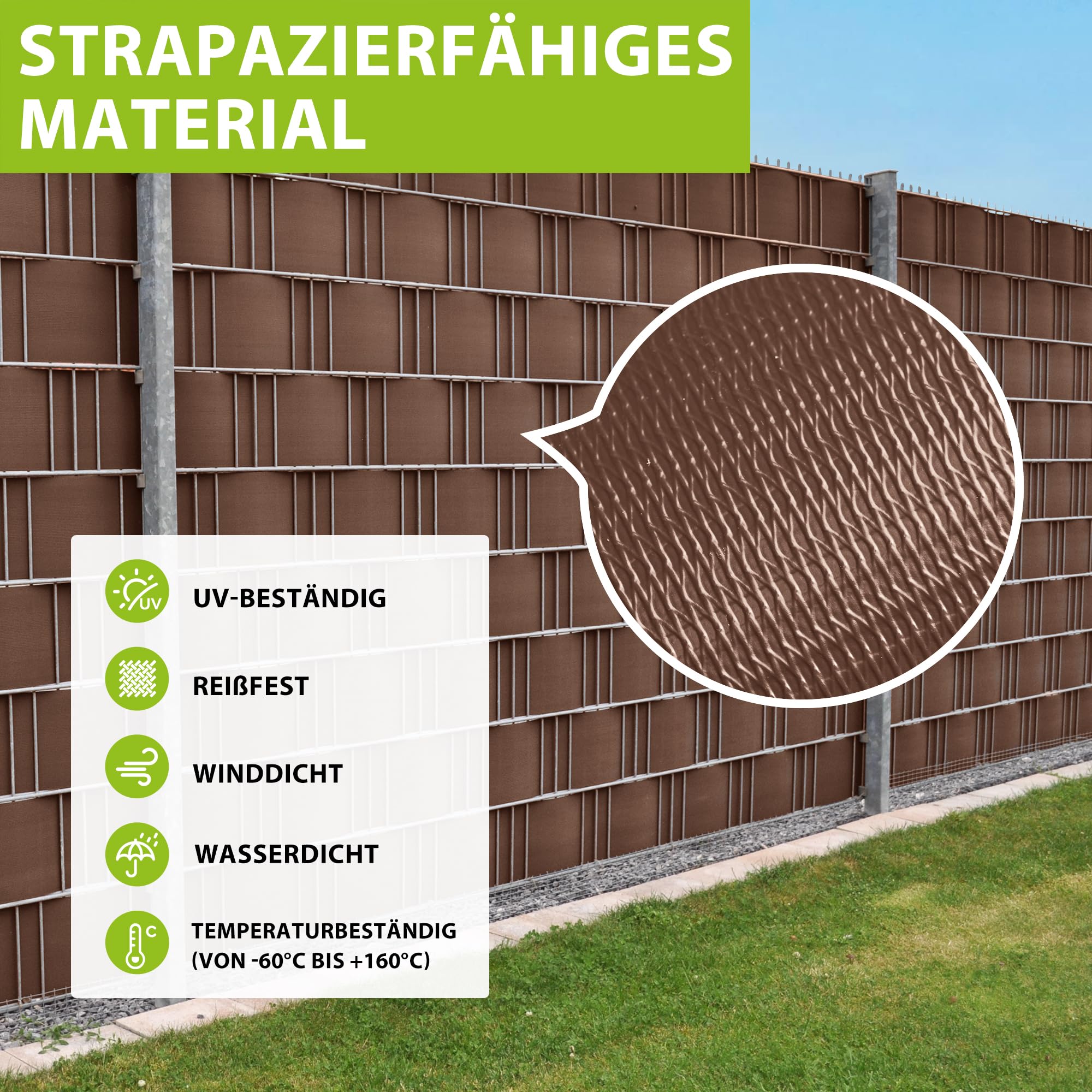 Unser Zaunsichtschutz aus PVC ist der perfekte Sicht- und Windschutz für private oder industrielle Zaunanlagen. Die Montage ist besonders einfach und rasch zu bewerkstelligen. Sie können den Zaunsichtschutz auch problemlos in bereits vorhandene Gitterstab- und Stab-Zaunsysteme einflechten. Dank der hohen UV-Beständigkeit des Materials haben Sie lange Freude an den kräftigen Farben und der besonders edlen Optik. Vorteile - 100% recycelfähiges und hochwertig laminiertes PVC aus deutscher Polyvinylchlorid Granulat Herstellung - Stoffgewicht: 450g pro qm - 100% UV beständig (Lichtechtheit: Stufe 7) und reflektionsarm - Temperaturbeständig von -60°C bis +160°C - Material ist geruchsarm - extreme Reissfestigkeit durch eingearbeitetes Gewebe - einfach mit einem Wasserschlauch zu reinigen - bei starken Verunreinigungen empfehlen wir unsere Reinigungsmittel Rojaguard und Rojaclean - antistatisch: zieht keine Staub- oder Russpartikel an - Lotuseffekt durch Spezialveredelung der Oberfläche mit Nanotechnik - kein recyceltes PVC (hohe Rohmaterial-Qualität) - keine gesundheitsgefährdenden Stoffe nach aktueller EU NormBitte beachten Sie, dass durch die Sichtschutzstreifen an Ihrem Zaun der Wind mehr Angriffsfläche bekommt. Der Zaun sollte also auf jeden Fall solide montiert sein, um auch stärkeren Windböen standzuhalten. Befestigungsclips Zu jedem ca. 40 m langen und ca. 19 cm breiten PVC Sichtschutzstreifen erhalten Sie 22 Befestigungsclips in der passenden Farbe. Mit den Clips (Klemmschienen) befestigen Sie die Streifen ganz einfach ohne Werkzeug und sorgen damit ganz unkompliziert für einen optisch runden und funktionalen Abschluss.Lieferumfang: 1x jarolift PVC Sichtschutzstreifen 19 cm x 40 m, Farbe nach Wahl 25x Befestigungsclips, Farbe passend zu dem Sichtschutzstreifen