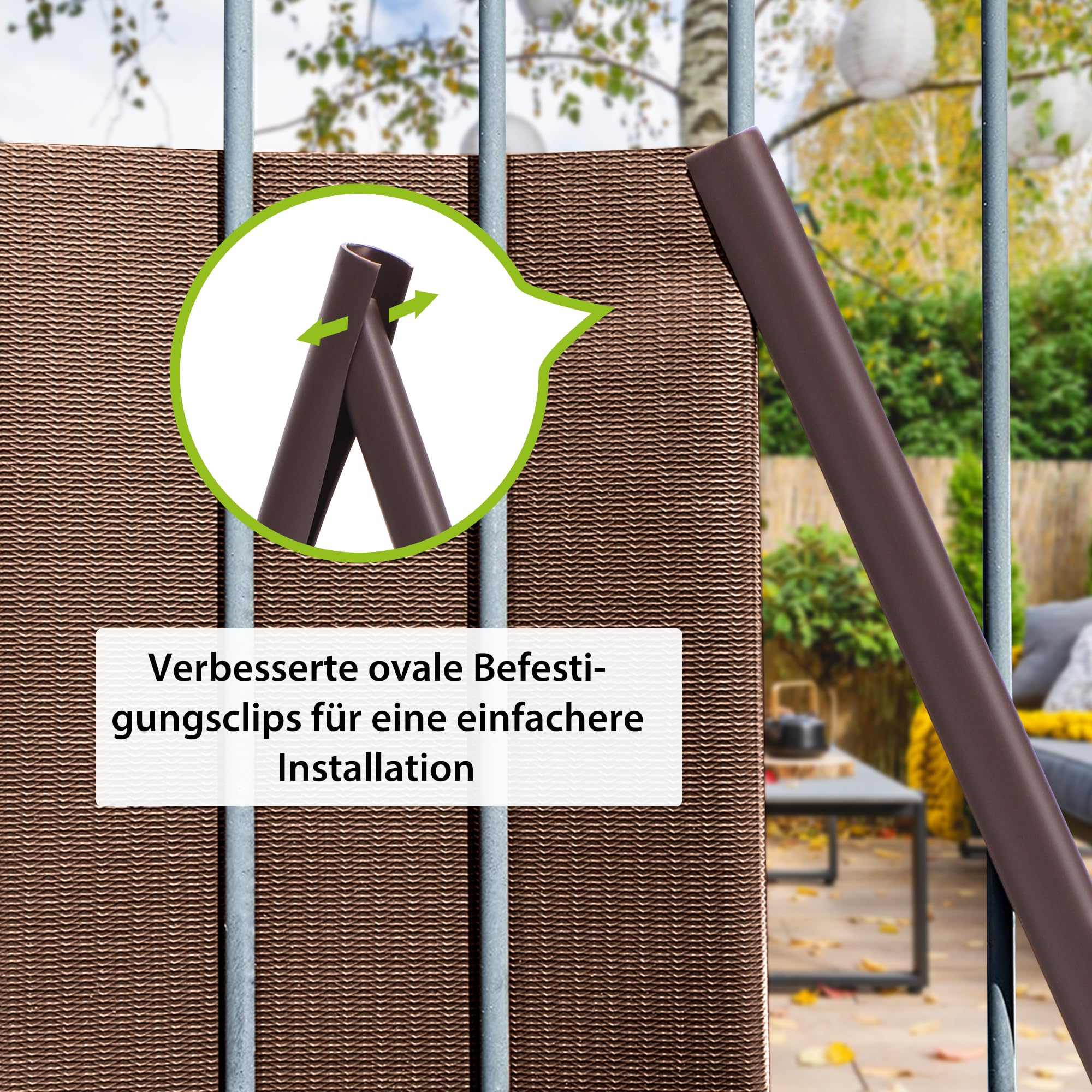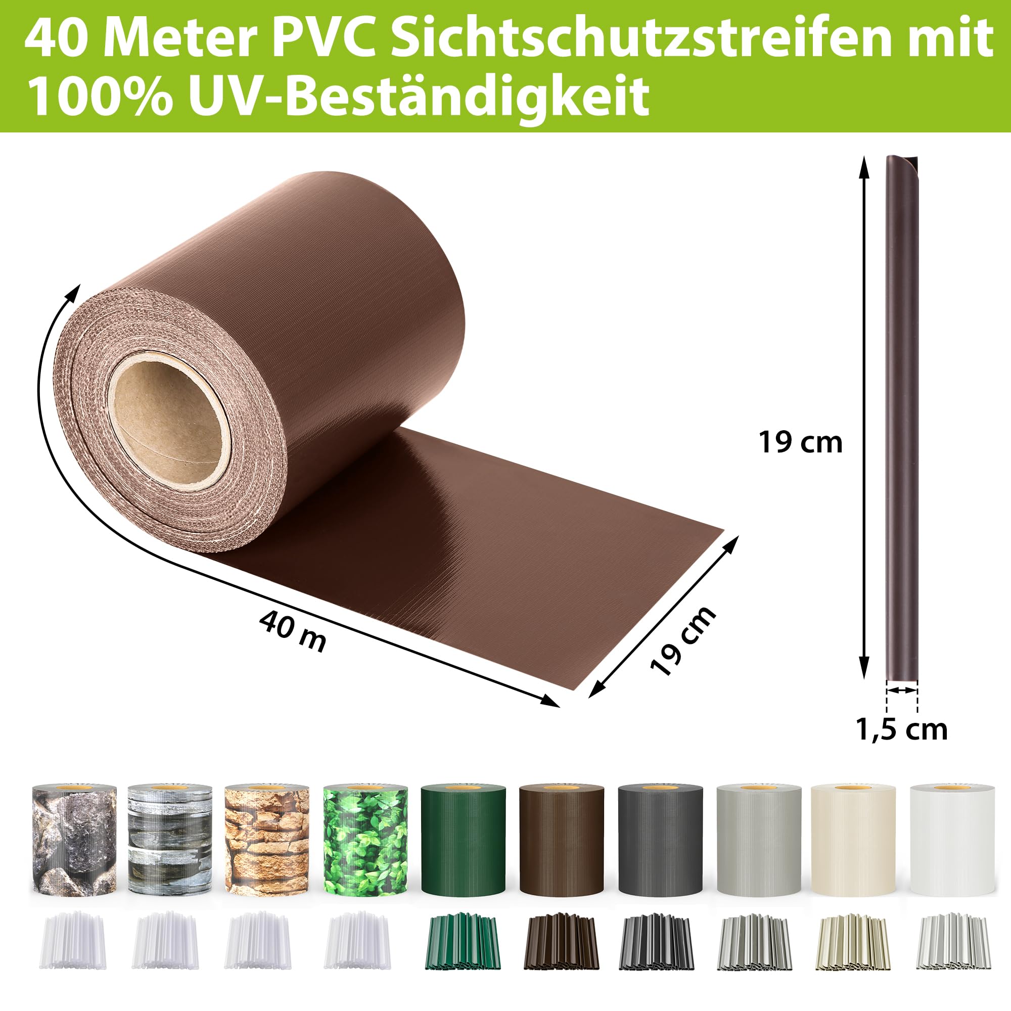 jarolift PVC Sichtschutzstreifen Sichtschutz Gartenzaun Stabmattenzaun Balkon, Wasser und Winddicht Komplettset mit 25 Clips, 40 m (L) x 19 (B) cm, Braun - Sepiabraun