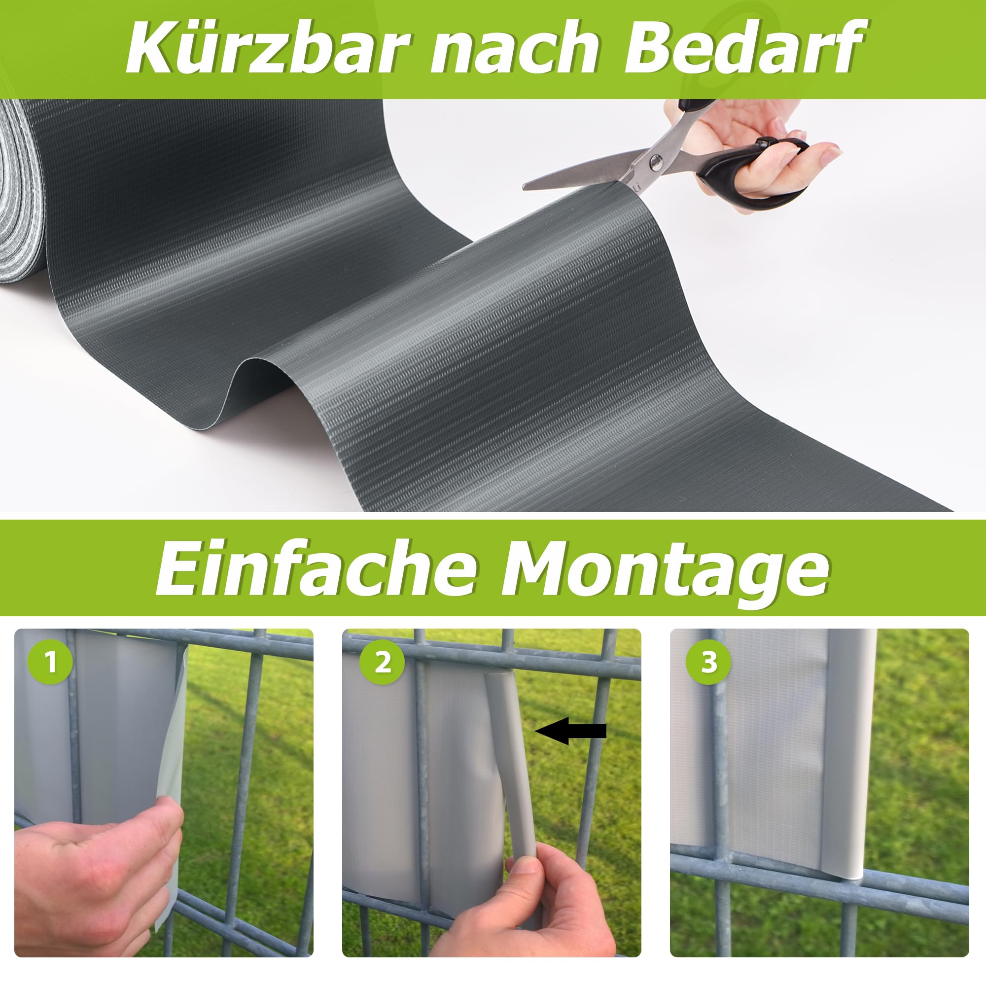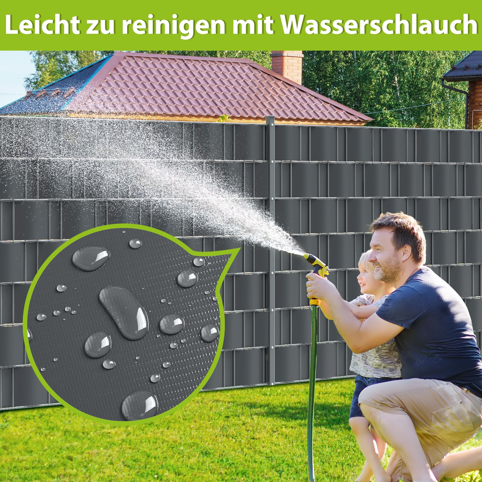 Unser Zaunsichtschutz aus PVC ist der perfekte Sicht- und Windschutz für private oder industrielle Zaunanlagen. Die Montage ist besonders einfach und rasch zu bewerkstelligen. Sie können den Zaunsichtschutz auch problemlos in bereits vorhandene Gitterstab- und Stab-Zaunsysteme einflechten. Dank der hohen UV-Beständigkeit des Materials haben Sie lange Freude an den kräftigen Farben und der besonders edlen Optik. Vorteile - 100% recycelfähiges und hochwertig laminiertes PVC aus deutscher Polyvinylchlorid Granulat Herstellung - Stoffgewicht: 450g pro qm - 100% UV beständig (Lichtechtheit: Stufe 7) und reflektionsarm - Temperaturbeständig von -60°C bis +160°C - Material ist geruchsarm - extreme Reissfestigkeit durch eingearbeitetes Gewebe - einfach mit einem Wasserschlauch zu reinigen - bei starken Verunreinigungen empfehlen wir unsere Reinigungsmittel Rojaguard und Rojaclean - antistatisch: zieht keine Staub- oder Russpartikel an - Lotuseffekt durch Spezialveredelung der Oberfläche mit Nanotechnik - kein recyceltes PVC (hohe Rohmaterial-Qualität) - keine gesundheitsgefährdenden Stoffe nach aktueller EU NormBitte beachten Sie, dass durch die Sichtschutzstreifen an Ihrem Zaun der Wind mehr Angriffsfläche bekommt. Der Zaun sollte also auf jeden Fall solide montiert sein, um auch stärkeren Windböen standzuhalten. Befestigungsclips Zu jedem ca. 40 m langen und ca. 19 cm breiten PVC Sichtschutzstreifen erhalten Sie 22 Befestigungsclips in der passenden Farbe. Mit den Clips (Klemmschienen) befestigen Sie die Streifen ganz einfach ohne Werkzeug und sorgen damit ganz unkompliziert für einen optisch runden und funktionalen Abschluss.Lieferumfang: 1x JAROLIFT PVC Sichtschutzstreifen 19 cm x 40 m, Farbe nach Wahl 25x Befestigungsclips, Farbe passend zu dem Sichtschutzstreifen