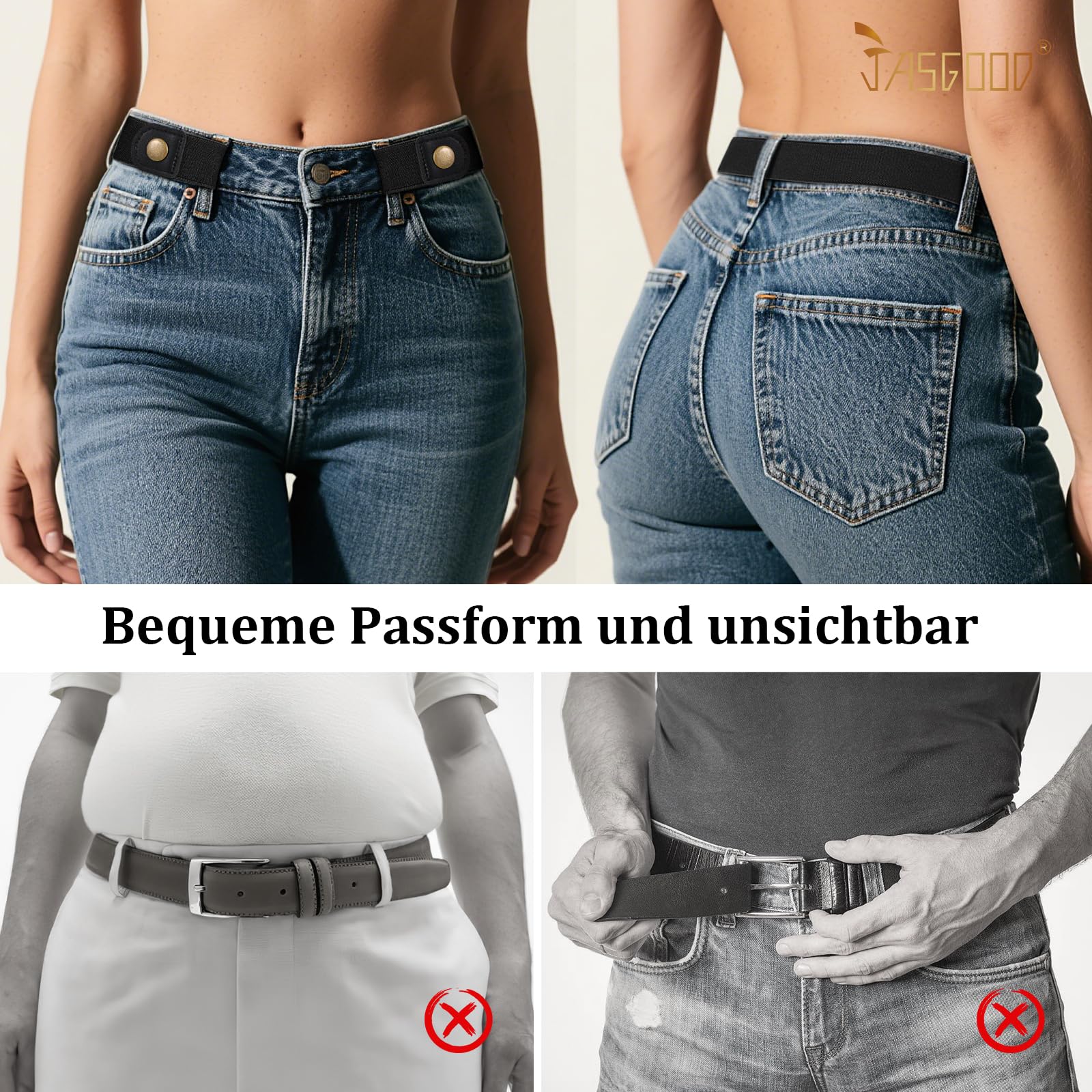 JasGood 2 Stück Gürtel Ohne Schnalle,Elastischer Unsichtbarer Gürtel, Dehnbarer Stretchgürtel für Damen und Herren,Justierbar Schnallenfreier Gurtel Für Jeans Hosen