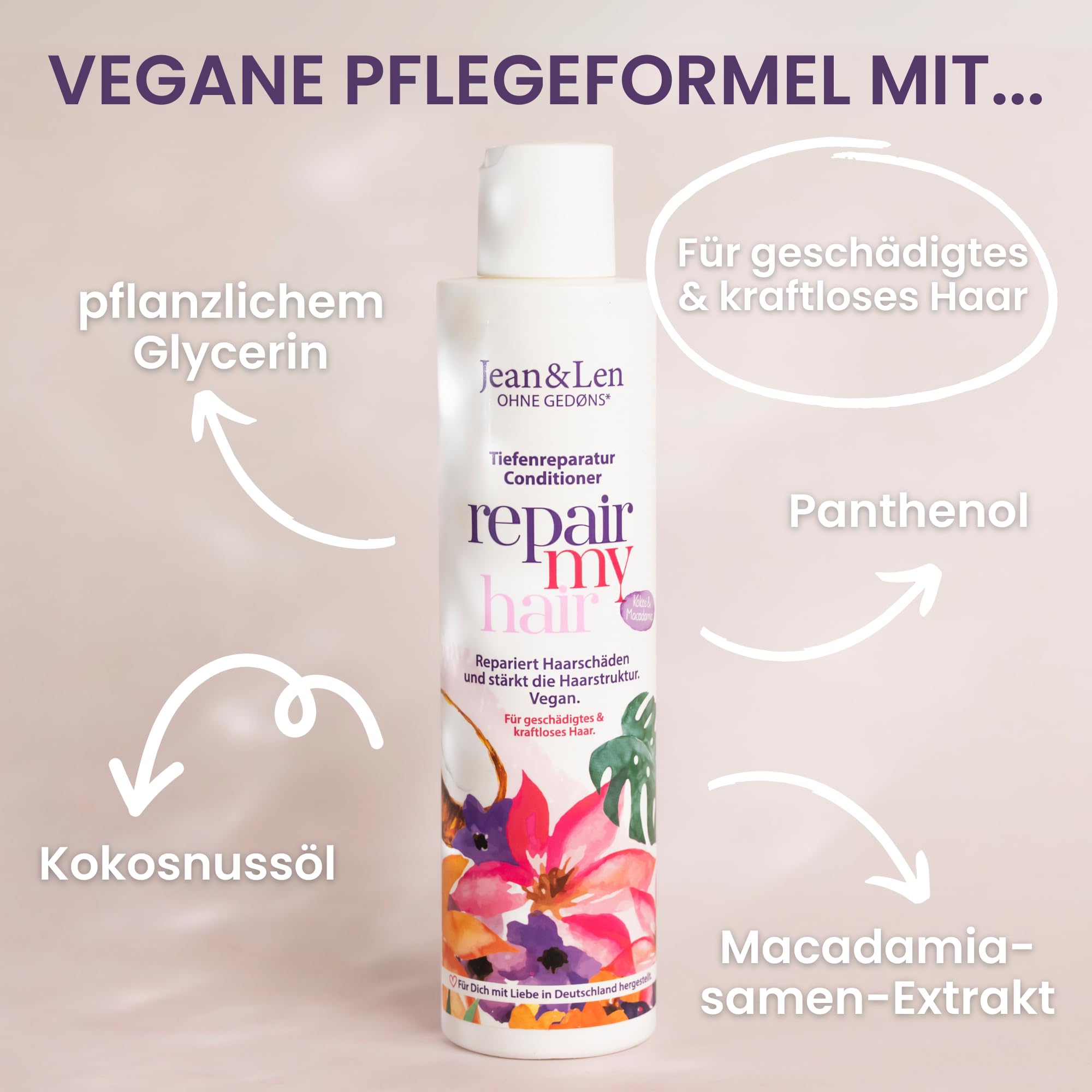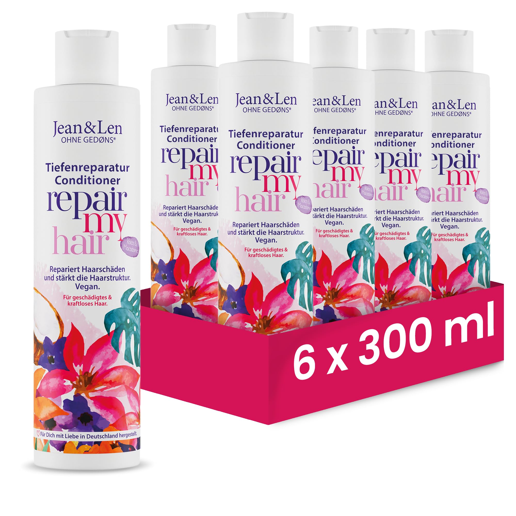 Jean & Len Conditioner Repair Kokos & Macadamia, im Set, für geschädigtes und kraftloses Haar, repariert Haarschäden, verleiht Geschmeidigkeit, Kokos-Duft, ohne Parabene & Silikone, vegan, 6 x 300 ml