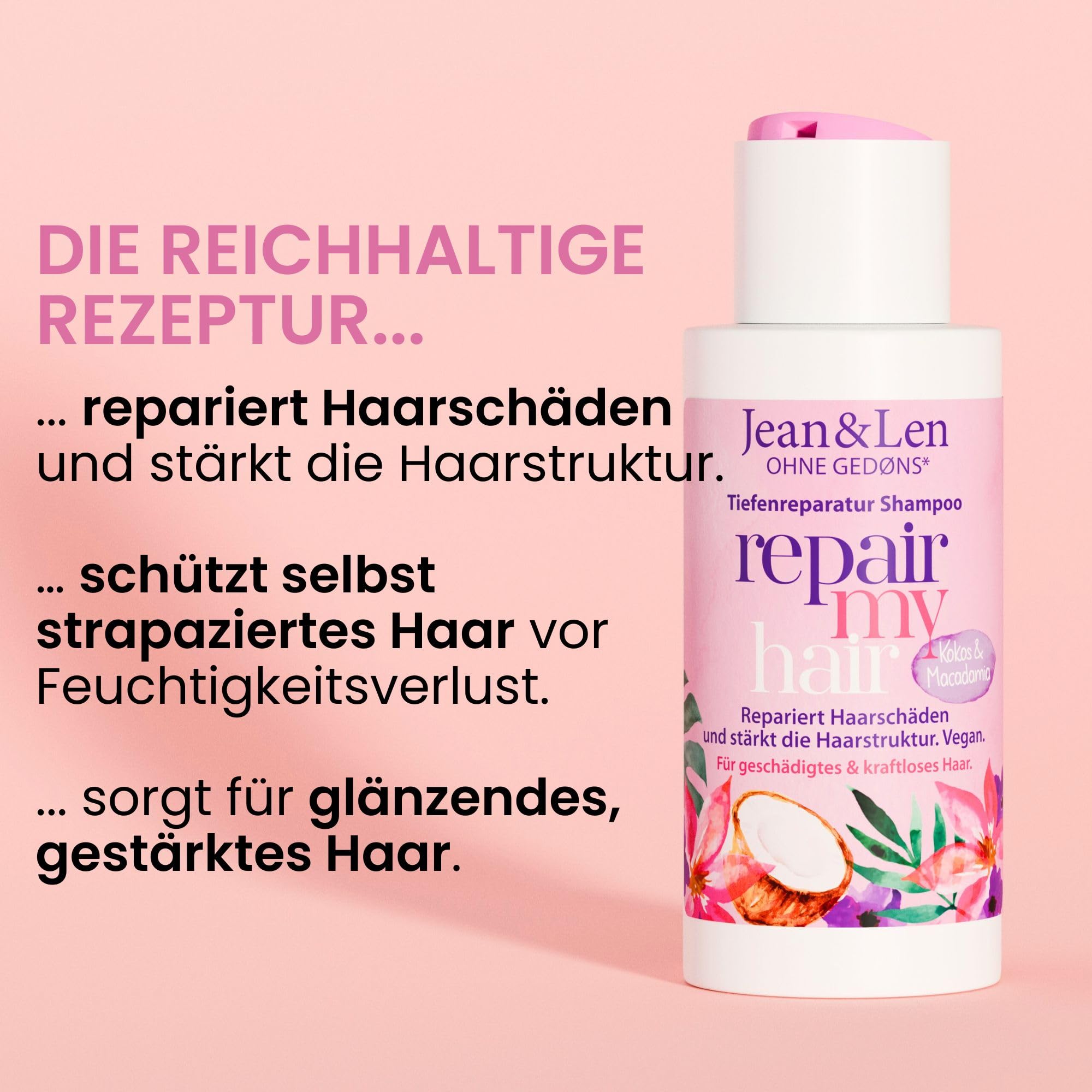 • Das Jean und Len Repair Shampoo mit Kokosöl und Macadamia repariert brüchiges, kraftloses Haar und lässt es gepflegt aussehen – Mit Liebe in Deutschland hergestellt