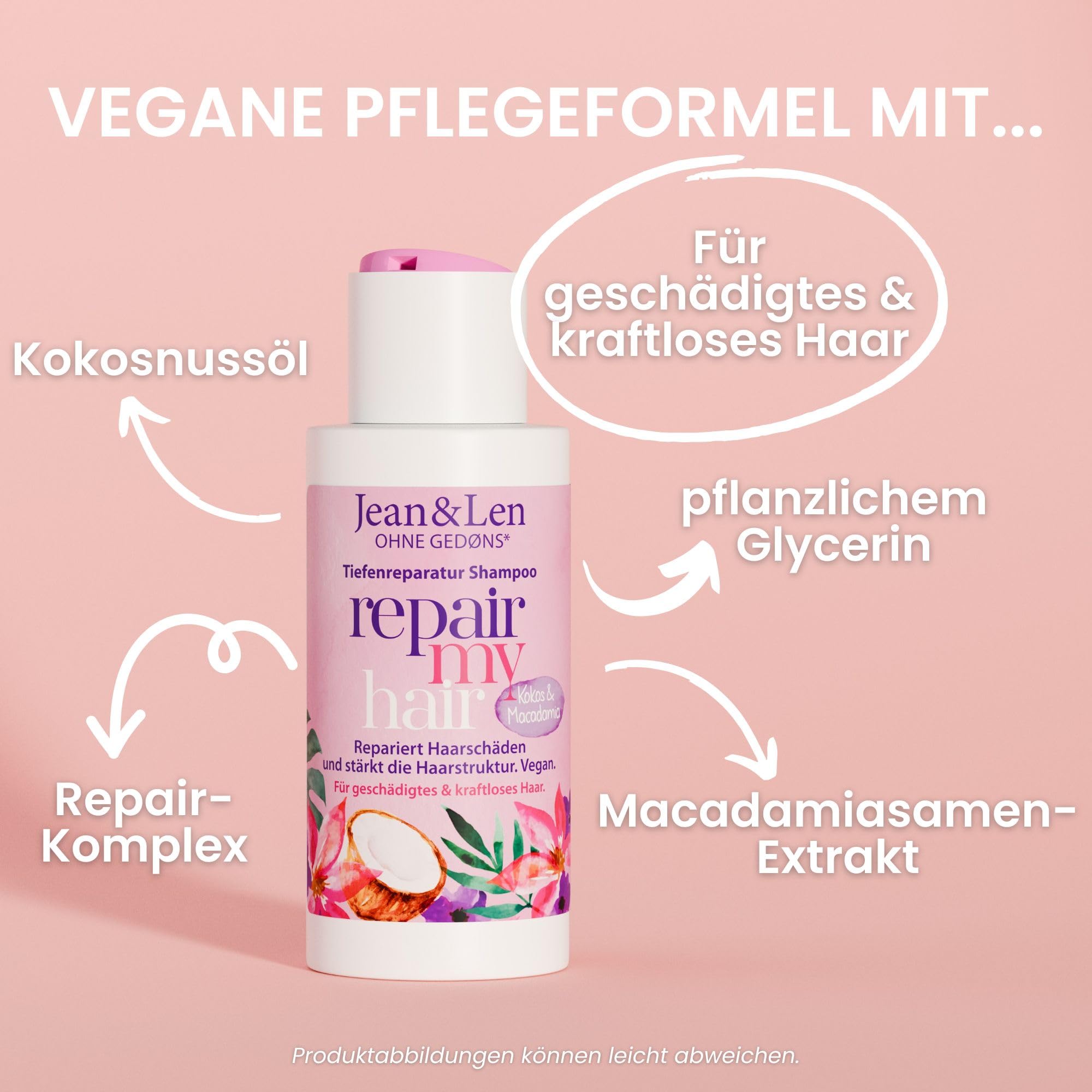 • Lieferumfang: 1 x 50 ml Jean&Len Repair Shampoo Kokosöl & Macadamia, für geschädigtes & kraftloses Haar, gegen Feuchtigkeitsverlust, reduziert Haarbruch, Kokosduft, ohne Parabene und Silikone, vegan