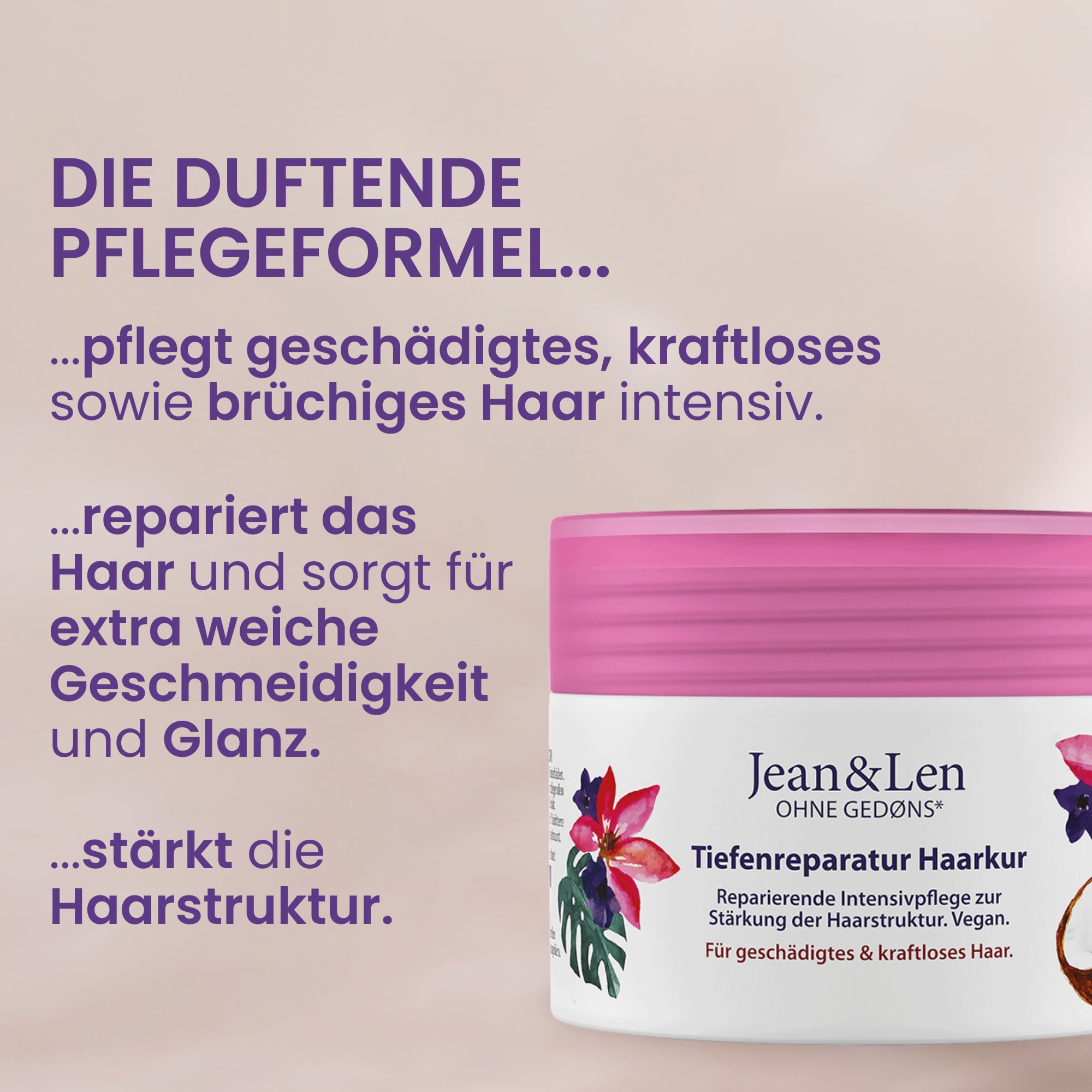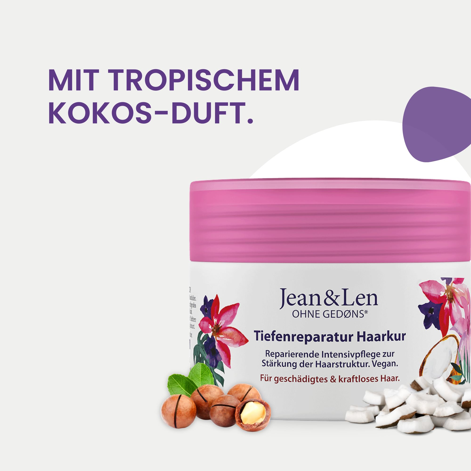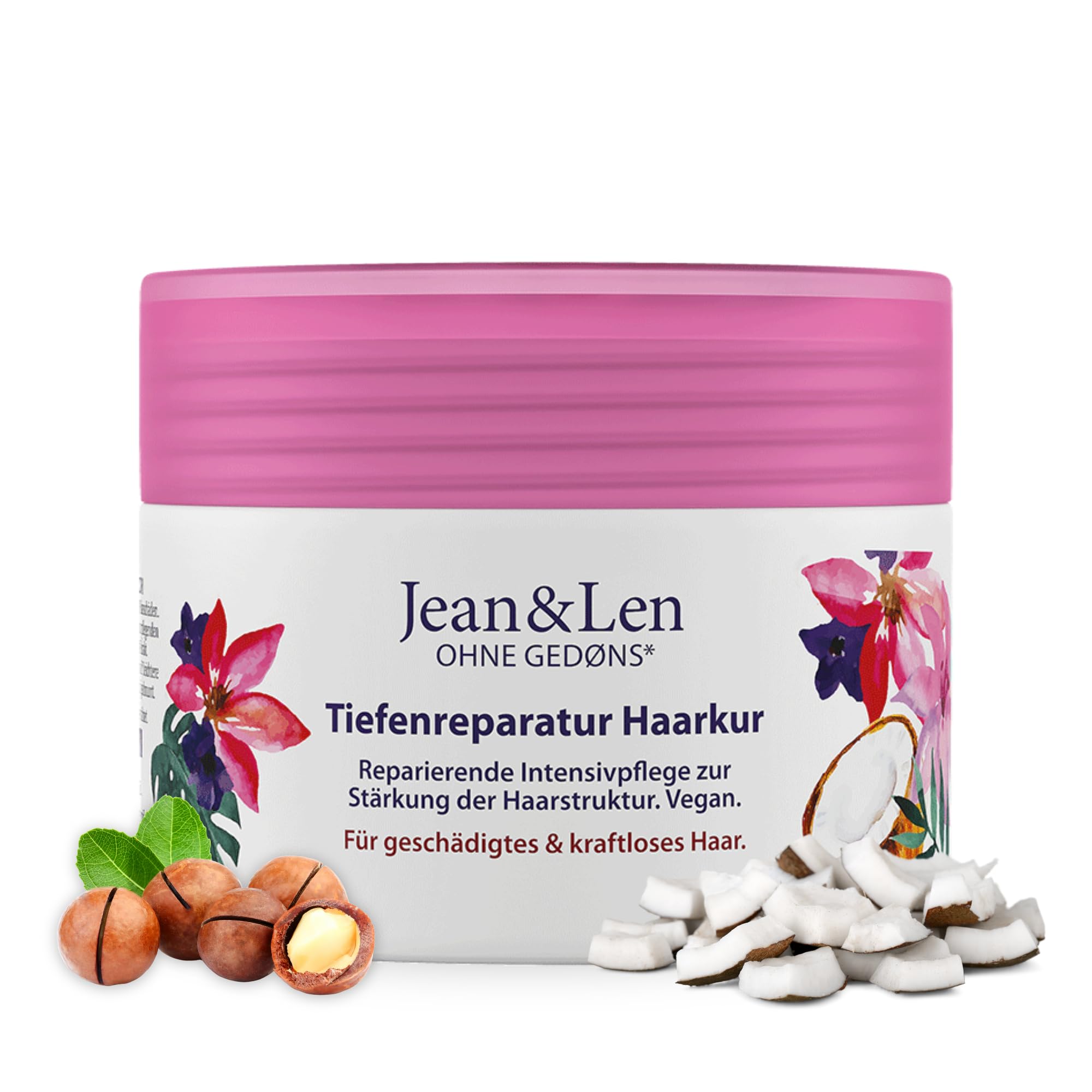 Jean & Len Tiefenreparatur Haarkur Kokosöl & Macadamia, für stark geschädigtes Haar, wirkt Haarbruch entgegen, Kokos & Macadamia Duft, ohne Parabene und Silikone, vegan, 250ml