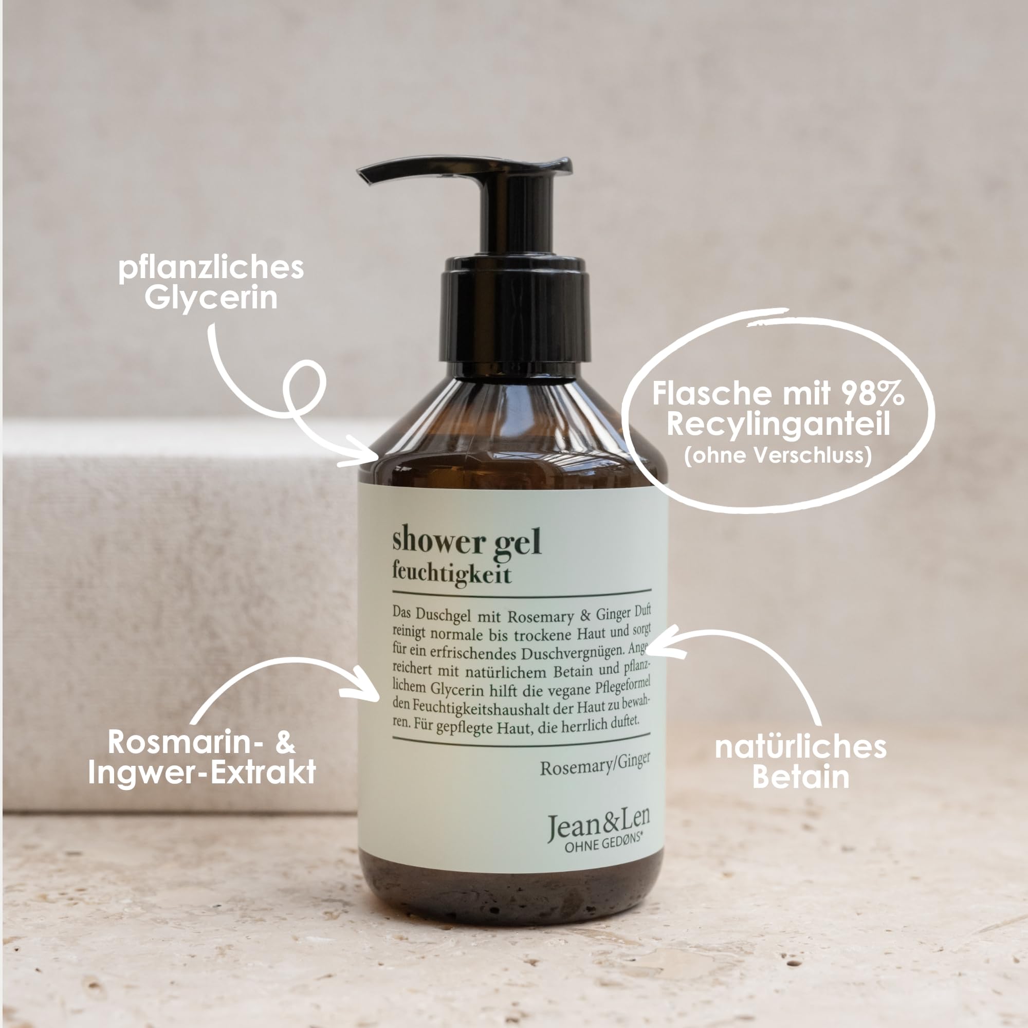 Mit der Jean & Len Feuchtigkeit Dusche Rosemary & Ginger geniesst Du eine sanfte Reinigung, intensive Pflege und einen vitalisierenden Duft in einem Produkt. Ideal für alle, die ihre Haut täglich frisch, hydratisiert und angenehm duftend halten möchten – ohne Kompromisse bei Qualität, Hautverträglichkeit oder Nachhaltigkeit.