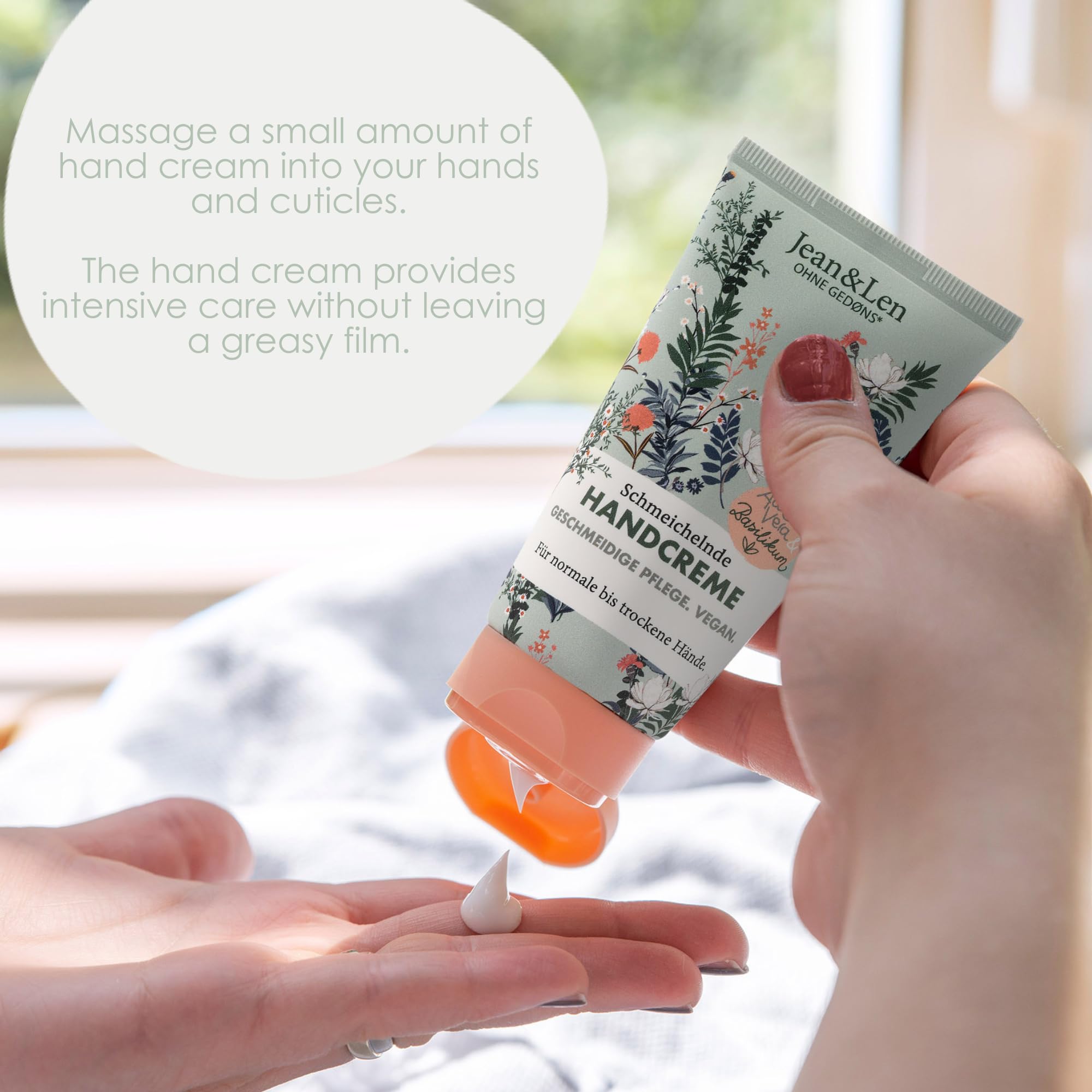 Die Jean & Len Handpflege ist vegan und kommt ohne Parabene und Silikone aus. Damit ist sie besonders hautfreundlich und auch fuer Menschen geeignet, die Wert auf bewusste, ehrliche Kosmetik legen.