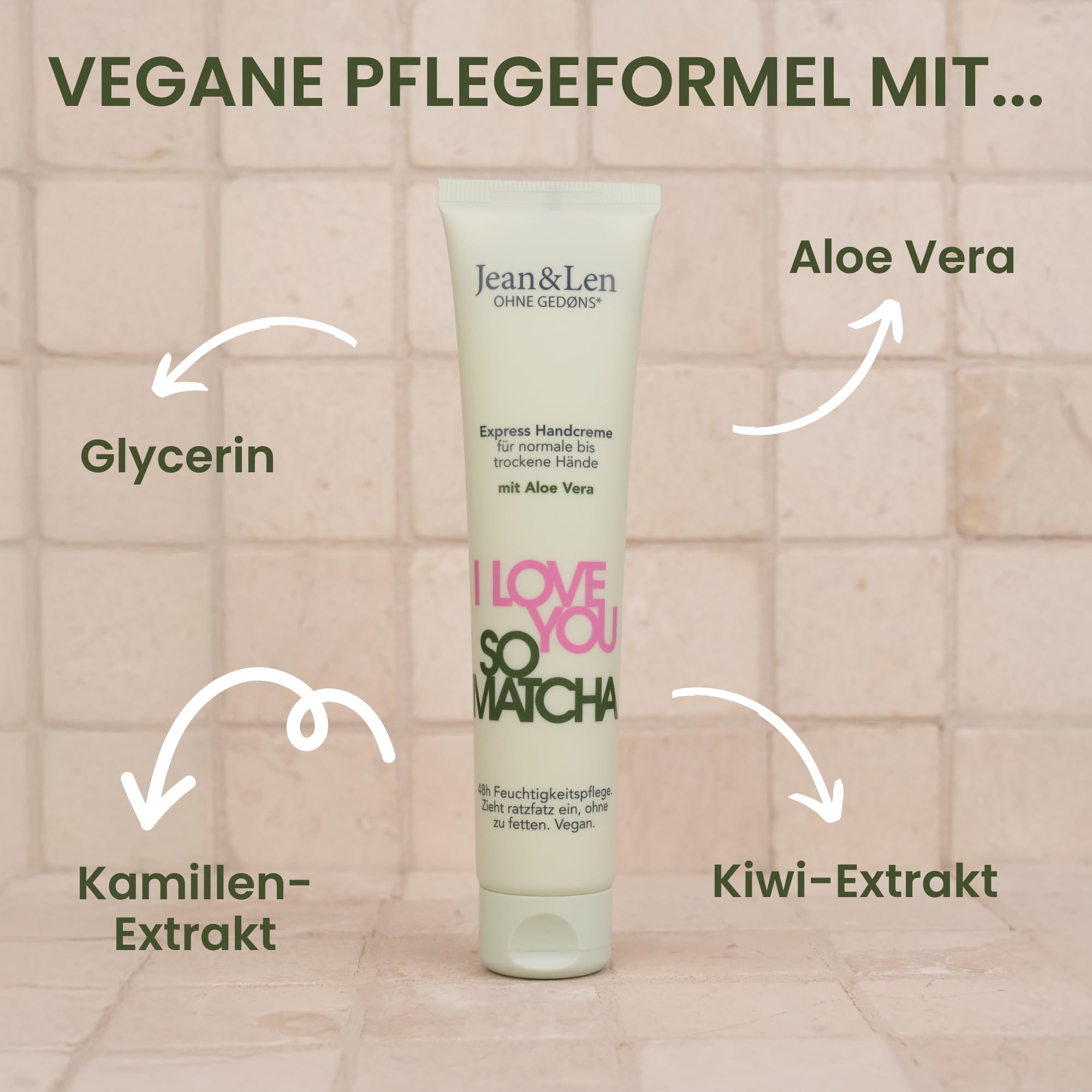 Jean & Len Handcreme I Love You So Matcha, für normale bis trockene Hände, versorgt die Hände mit Feuchtigkeit, zieht schnell ein, vegane Handpflege, ohne Parabene & Silikone, 75 ml