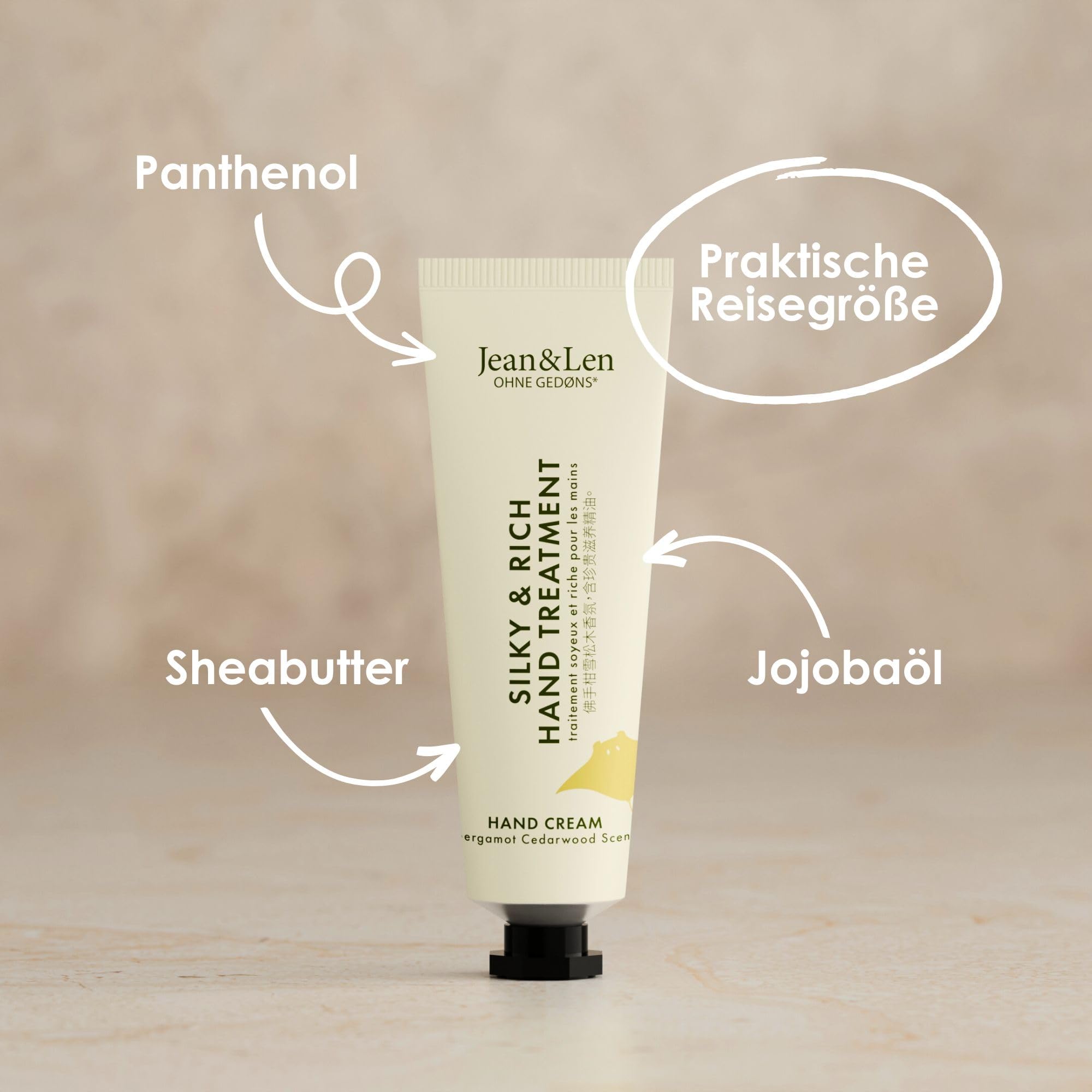 • Lieferumfang: 1 x 30 ml Jean&Len Mini Silky & Rich Hand Treatment Bergamot & Cedarwood, Handcreme Geschenk, erfrischend-zitrischer Duft nach Bergamotte & Zedernholz