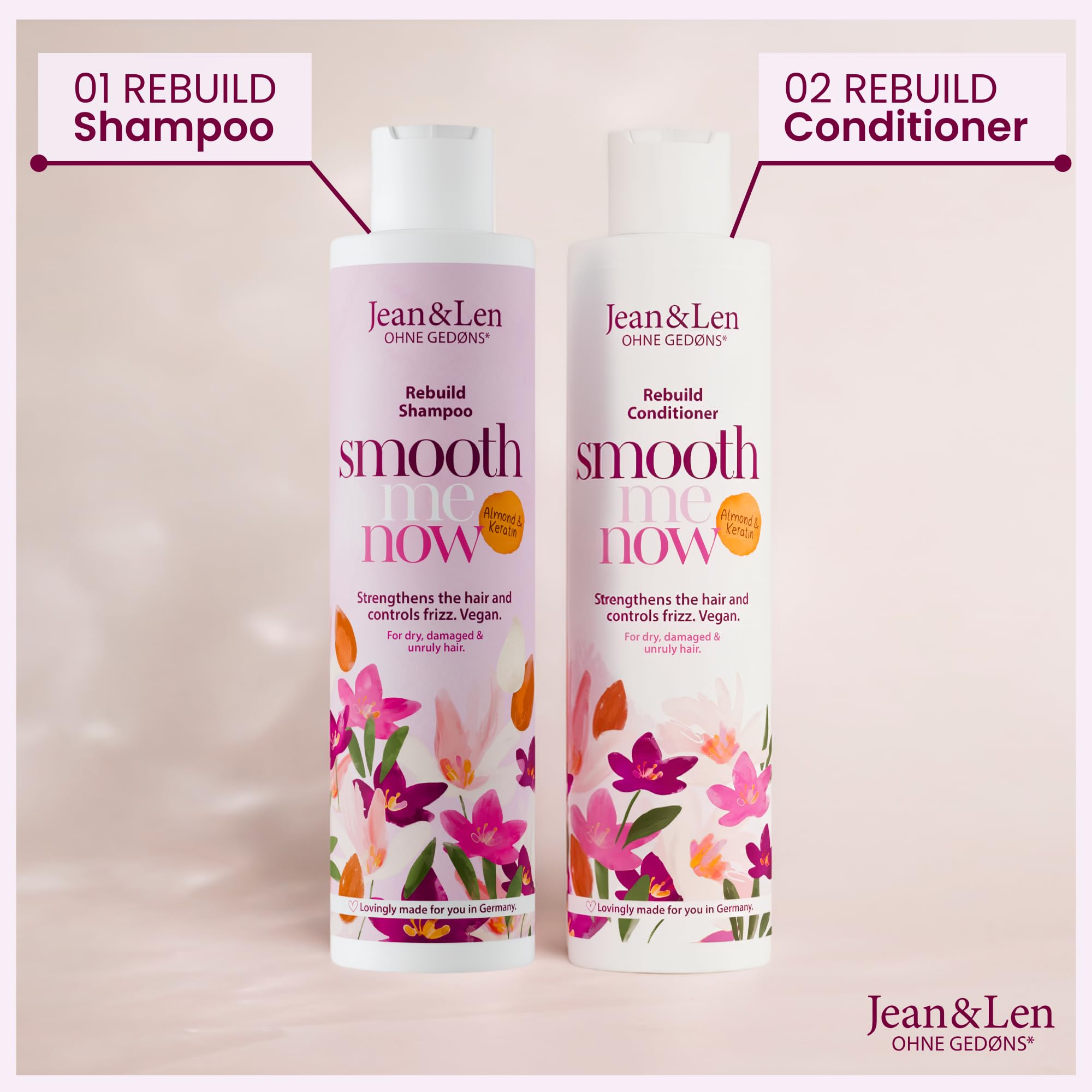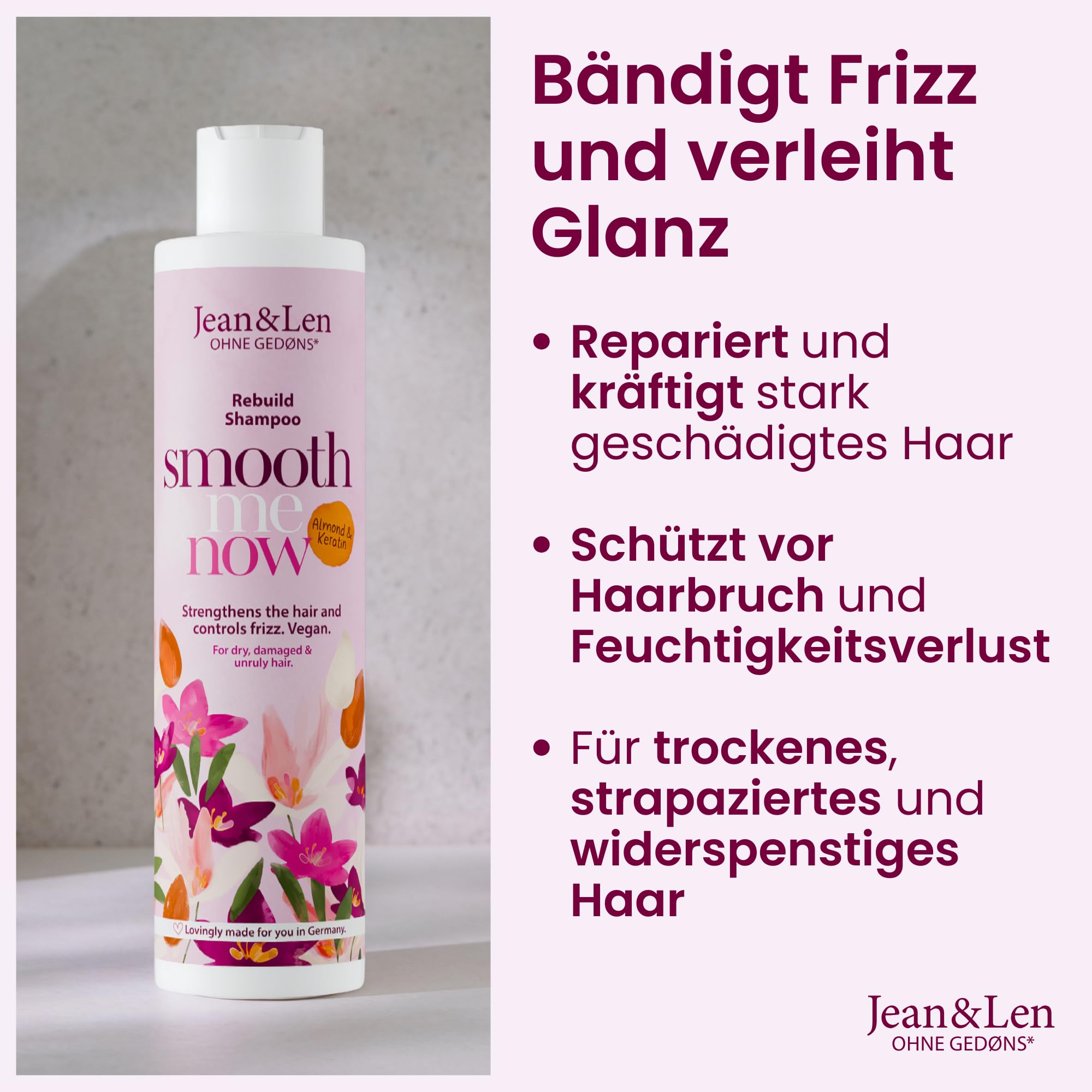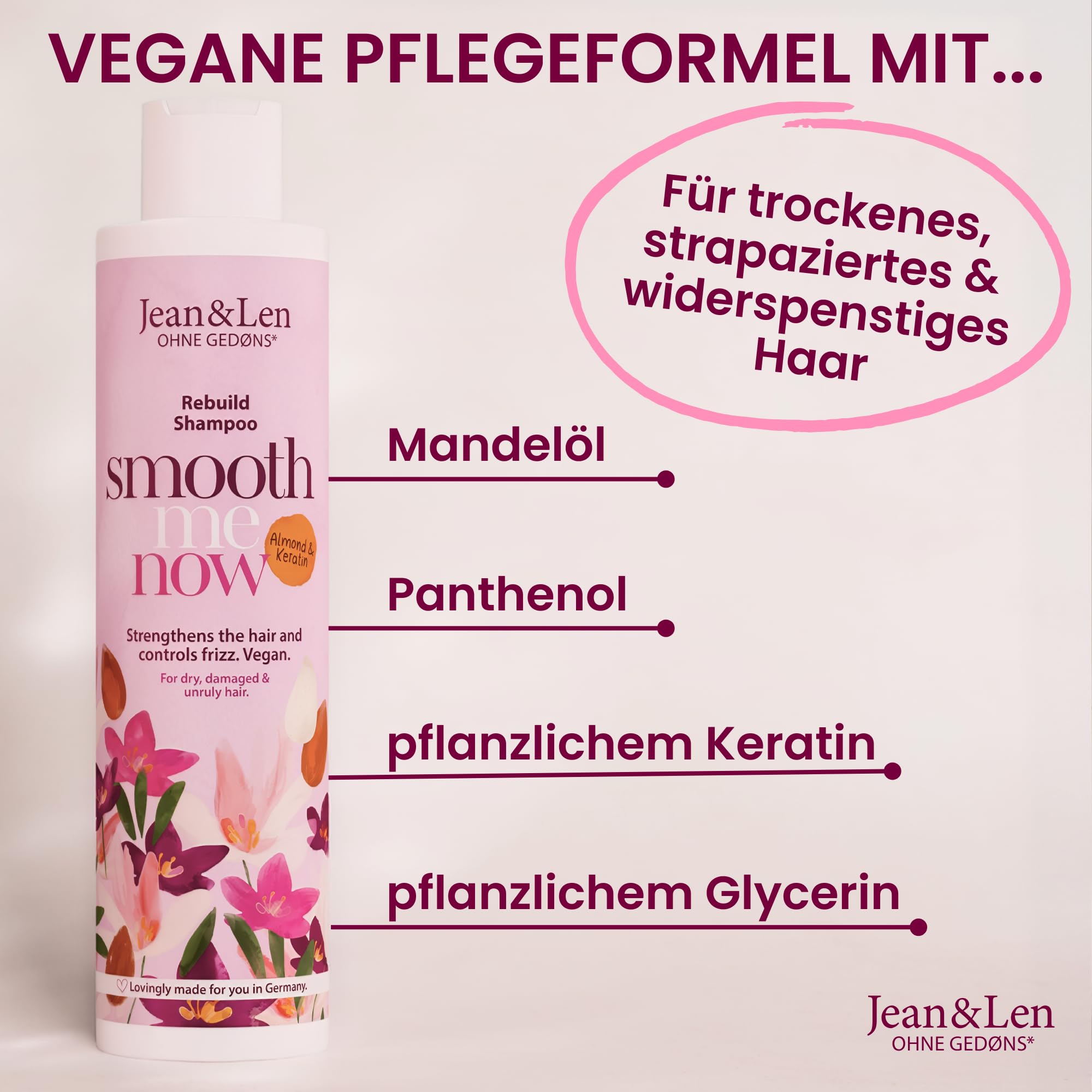 Jean & Len Shampoo Aufbau Mandel & Keratin, für trockenes, strapaziertes & widerspenstiges Haar, kräftigt das Haar, bändigt Frizz und verleiht Glanz, Shampoo ohne Silikone & Parabene, vegan, 300 ml