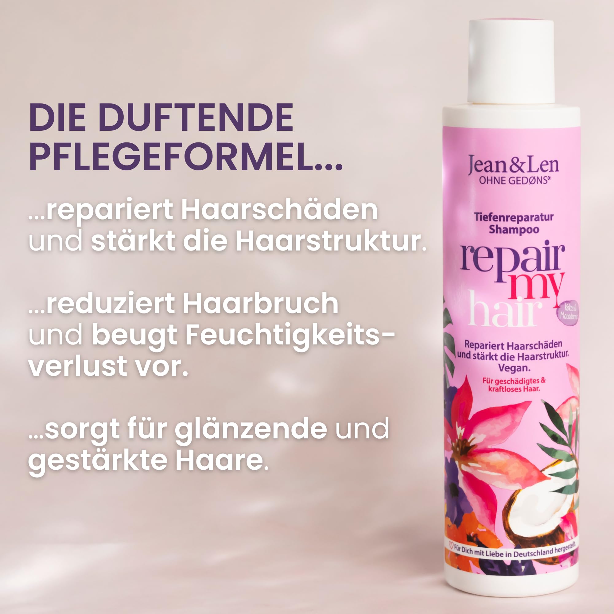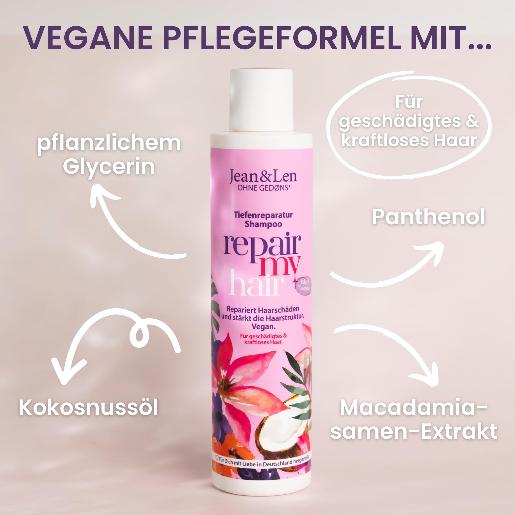 Jean & Len Shampoo Repair Kokosöl & Macadamia, für geschädigtes & kraftloses Haar, beugt Feuchtigkeitsverlust vor, repariert Haarschäden, Kokos-Duft, ohne Parabene & Silikone, vegan 300 ml