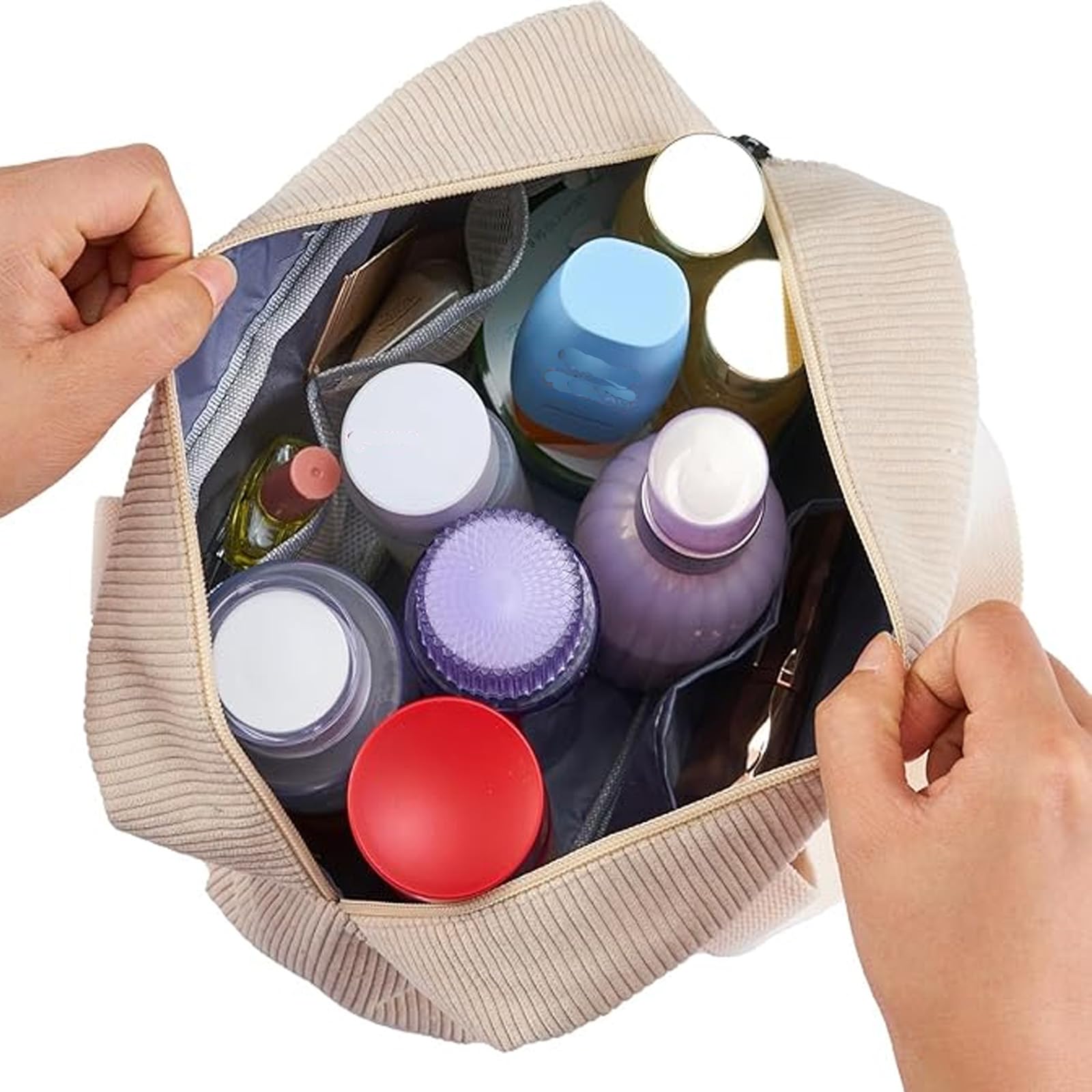Der grosszuegige Innenraum bietet ausreichend Platz fuer Make-up, Pflegeprodukte, Toilettenartikel, Haaraccessoires und persoenliche Reiseutensilien. Dank der durchdachten Form bleiben alle Inhalte uebersichtlich organisiert und jederzeit griffbereit – ob im Badezimmer, im Koffer oder im Handgepaeck.
