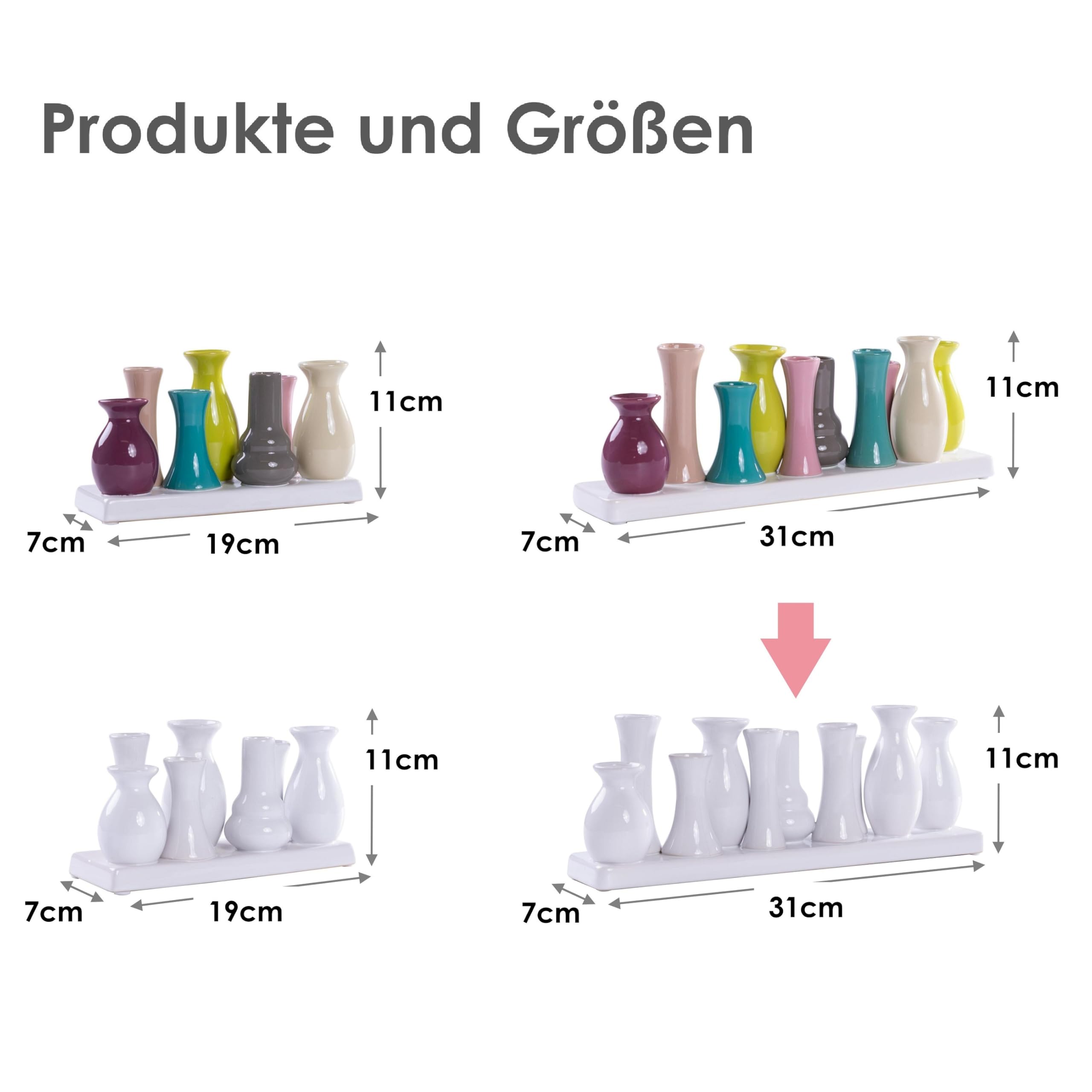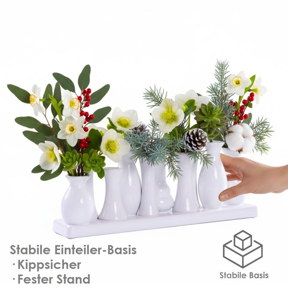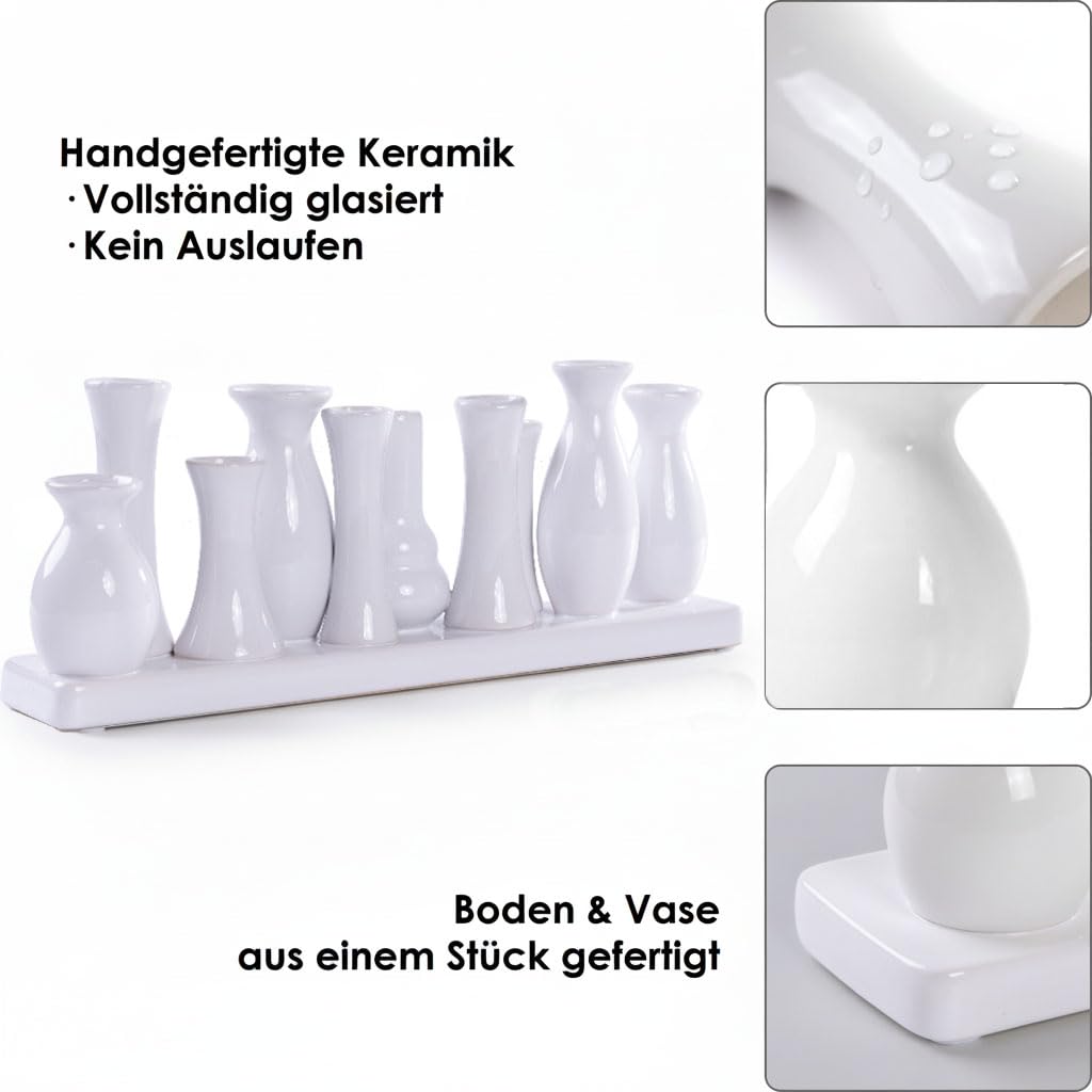 *Jedes Produkt besteht aus 10 Keramikvasen in den verschiedensten, aussergewöhnlichsten Formen, ganz in weiss, montiert auf einer festen Basis.*Höhe jeder keramischen Vase: ca. 6 cm bis 9,5 cm, Gesamtlänge: 30cm, Gesamtbreite: 6 cm. *Frei nach Wunsch können Sie die Blumen mischen und zusammenbringen, das ist eine gute Hauptdekoration, selbst wenn Sie die Blumenanordnung nicht planen.