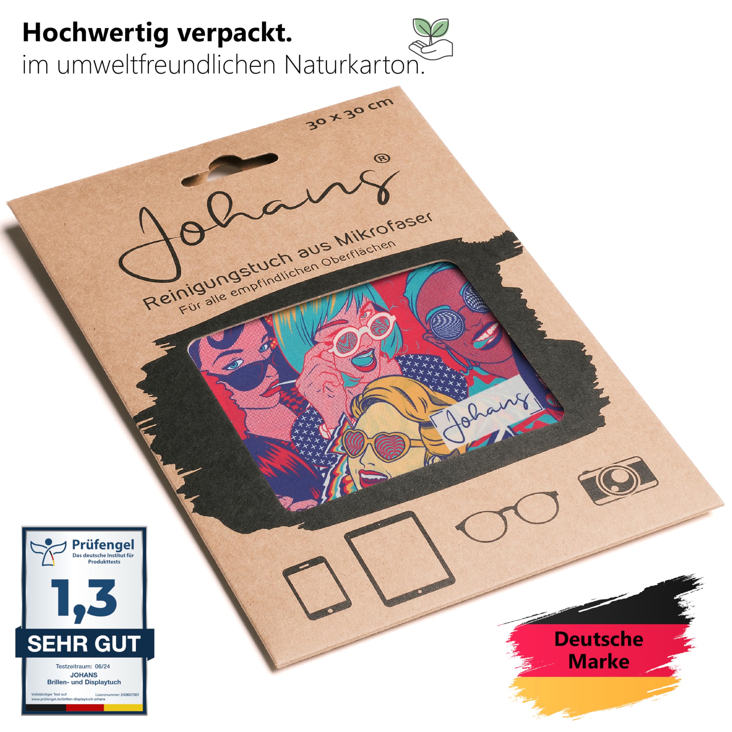 Durch die Grösse (30x30cm) liegt das Johans Tuch besonders gut in der Hand und bietet viel Fläche für eine gründliche Reinigung deiner Brillengläser oder Displays Deiner täglichen Begleiter.