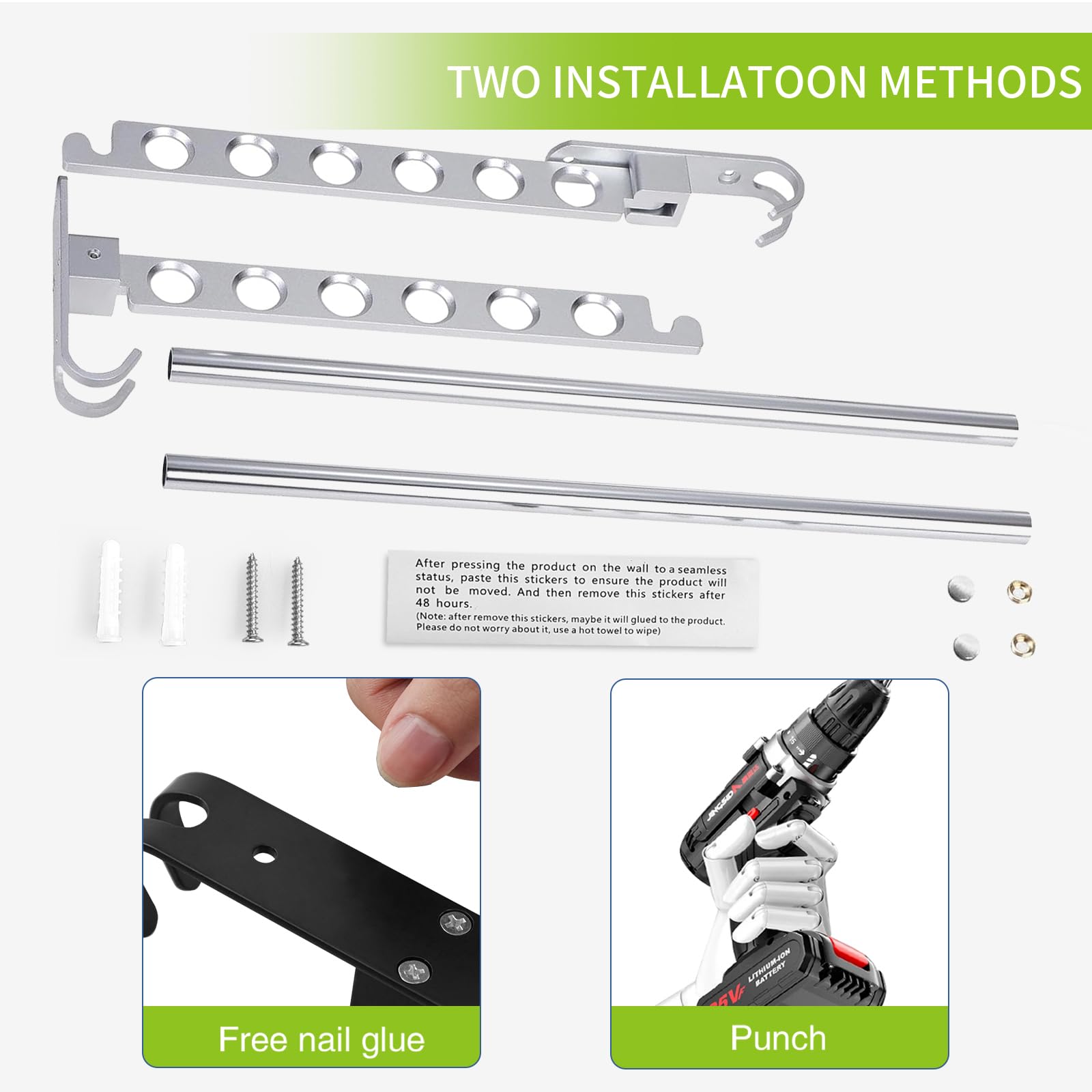Entdecken Sie unsere hochwertige Wandgarderobe, ideal für den Innenbereich. Hergestellt aus dickem Aluminium, ist es robust, beständig gegen Verformung, Feuchtigkeit und Kratzer. Jedes Klappregal bietet eine grosszügige Speicherkapazität mit 6 separaten Löchern und 3 kleinen Haken sowie einer Edelstahlstange in der Mitte, um den Stauraum zu verdoppeln. Die abnehmbaren 40 cm langen Edelstahlstangen können zu einer 80 cm langen Kleiderstange kombiniert werden, die eine grössere Trocknungskapazität bietet. Dieser praktische Wandkleiderständer ist zusammenklappbar, sodass er bei Nichtgebrauch einfach an der Wand aufbewahrt werden kann. Es kann in Schlafzimmer, Badezimmer, Balkon oder Waschküche zum Trocknen oder Organisieren von Kleidung und Handtüchern verwendet werden. Die Masse des Produkts betragen 31 cm tief, 31 cm breit und 40 cm hoch, und es kann bis zu 44 Pfund tragen. Dieser Wandgarderobe ist in Silber erhältlich und erfordert eine Montage.